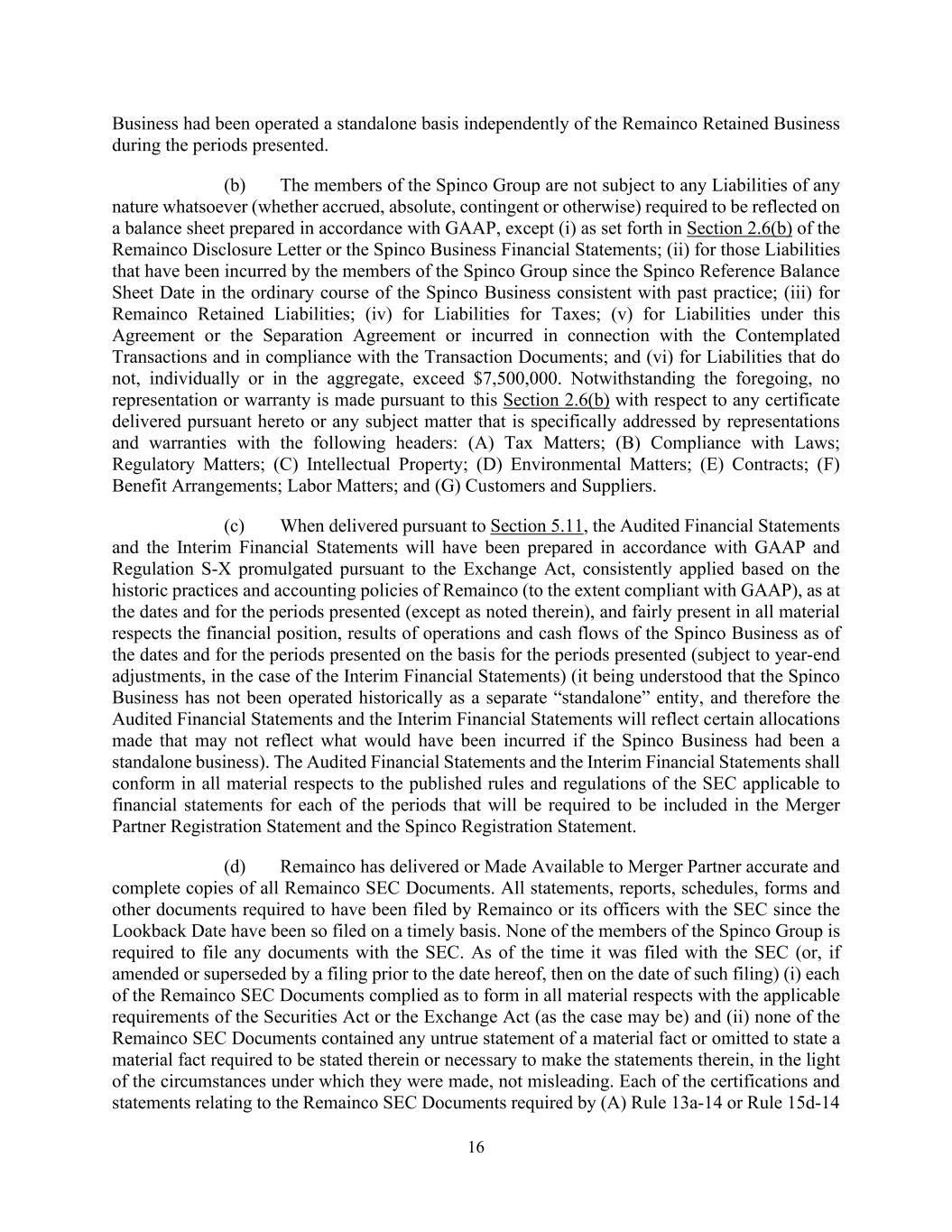 16 Business had been operated a standalone basis independently of the Remainco Retained Business during the periods presented. (b) The members of the Spinco Group are not subject to any Liabilities of any nature whatsoever (whether accrued, absolute, contingent or otherwise) required to be reflected on a balance sheet prepared in accordance with GAAP, except (i) as set forth in Section 2.6(b) of the Remainco Disclosure Letter or the Spinco Business Financial Statements; (ii) for those Liabilities that have been incurred by the members of the Spinco Group since the Spinco Reference Balance Sheet Date in the ordinary course of the Spinco Business consistent with past practice; (iii) for Remainco Retained Liabilities; (iv) for Liabilities for Taxes; (v) for Liabilities under this Agreement or the Separation Agreement or incurred in connection with the Contemplated Transactions and in compliance with the Transaction Documents; and (vi) for Liabilities that do not, individually or in the aggregate, exceed $7,500,000. Notwithstanding the foregoing, no representation or warranty is made pursuant to this Section 2.6(b) with respect to any certificate delivered pursuant hereto or any subject matter that is specifically addressed by representations and warranties with the following headers: (A) Tax Matters; (B) Compliance with Laws; Regulatory Matters; (C) Intellectual Property; (D) Environmental Matters; (E) Contracts; (F) Benefit Arrangements; Labor Matters; and (G) Customers and Suppliers. (c) When delivered pursuant to Section 5.11, the Audited Financial Statements and the Interim Financial Statements will have been prepared in accordance with GAAP and Regulation S-X promulgated pursuant to the Exchange Act, consistently applied based on the historic practices and accounting policies of Remainco (to the extent compliant with GAAP), as at the dates and for the periods presented (except as noted therein), and fairly present in all material respects the financial position, results of operations and cash flows of the Spinco Business as of the dates and for the periods presented on the basis for the periods presented (subject to year-end adjustments, in the case of the Interim Financial Statements) (it being understood that the Spinco Business has not been operated historically as a separate “standalone” entity, and therefore the Audited Financial Statements and the Interim Financial Statements will reflect certain allocations made that may not reflect what would have been incurred if the Spinco Business had been a standalone business). The Audited Financial Statements and the Interim Financial Statements shall conform in all material respects to the published rules and regulations of the SEC applicable to financial statements for each of the periods that will be required to be included in the Merger Partner Registration Statement and the Spinco Registration Statement. (d) Remainco has delivered or Made Available to Merger Partner accurate and complete copies of all Remainco SEC Documents. All statements, reports, schedules, forms and other documents required to have been filed by Remainco or its officers with the SEC since the Lookback Date have been so filed on a timely basis. None of the members of the Spinco Group is required to file any documents with the SEC. As of the time it was filed with the SEC (or, if amended or superseded by a filing prior to the date hereof, then on the date of such filing) (i) each of the Remainco SEC Documents complied as to form in all material respects with the applicable requirements of the Securities Act or the Exchange Act (as the case may be) and (ii) none of the Remainco SEC Documents contained any untrue statement of a material fact or omitted to state a material fact required to be stated therein or necessary to make the statements therein, in the light of the circumstances under which they were made, not misleading. Each of the certifications and statements relating to the Remainco SEC Documents required by (A) Rule 13a-14 or Rule 15d-14