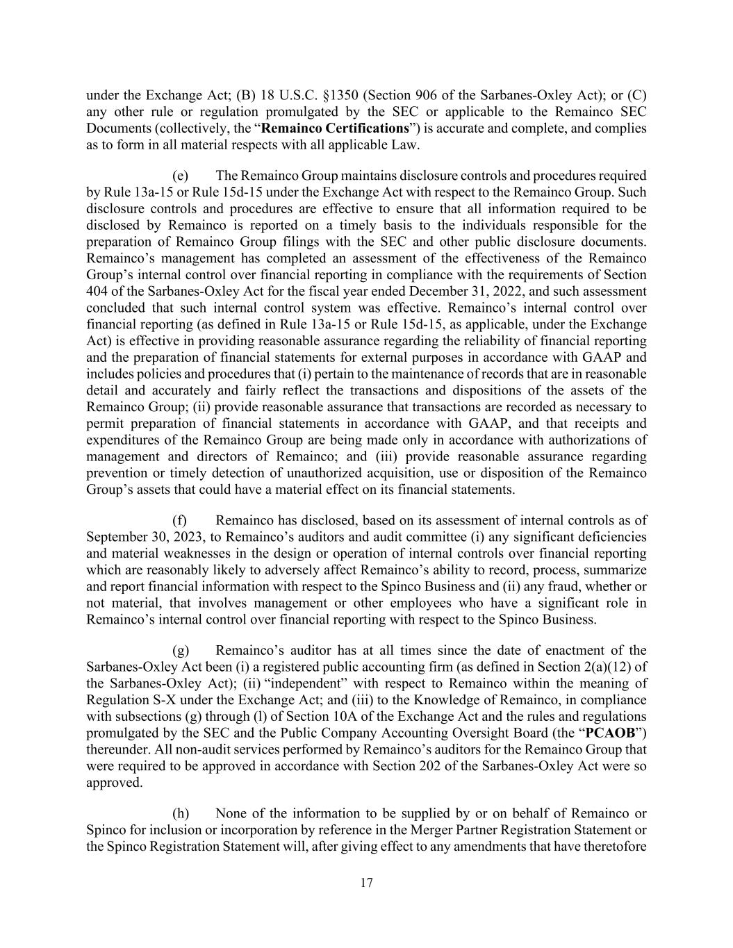 17 under the Exchange Act; (B) 18 U.S.C. §1350 (Section 906 of the Sarbanes-Oxley Act); or (C) any other rule or regulation promulgated by the SEC or applicable to the Remainco SEC Documents (collectively, the “Remainco Certifications”) is accurate and complete, and complies as to form in all material respects with all applicable Law. (e) The Remainco Group maintains disclosure controls and procedures required by Rule 13a-15 or Rule 15d-15 under the Exchange Act with respect to the Remainco Group. Such disclosure controls and procedures are effective to ensure that all information required to be disclosed by Remainco is reported on a timely basis to the individuals responsible for the preparation of Remainco Group filings with the SEC and other public disclosure documents. Remainco’s management has completed an assessment of the effectiveness of the Remainco Group’s internal control over financial reporting in compliance with the requirements of Section 404 of the Sarbanes-Oxley Act for the fiscal year ended December 31, 2022, and such assessment concluded that such internal control system was effective. Remainco’s internal control over financial reporting (as defined in Rule 13a-15 or Rule 15d-15, as applicable, under the Exchange Act) is effective in providing reasonable assurance regarding the reliability of financial reporting and the preparation of financial statements for external purposes in accordance with GAAP and includes policies and procedures that (i) pertain to the maintenance of records that are in reasonable detail and accurately and fairly reflect the transactions and dispositions of the assets of the Remainco Group; (ii) provide reasonable assurance that transactions are recorded as necessary to permit preparation of financial statements in accordance with GAAP, and that receipts and expenditures of the Remainco Group are being made only in accordance with authorizations of management and directors of Remainco; and (iii) provide reasonable assurance regarding prevention or timely detection of unauthorized acquisition, use or disposition of the Remainco Group’s assets that could have a material effect on its financial statements. (f) Remainco has disclosed, based on its assessment of internal controls as of September 30, 2023, to Remainco’s auditors and audit committee (i) any significant deficiencies and material weaknesses in the design or operation of internal controls over financial reporting which are reasonably likely to adversely affect Remainco’s ability to record, process, summarize and report financial information with respect to the Spinco Business and (ii) any fraud, whether or not material, that involves management or other employees who have a significant role in Remainco’s internal control over financial reporting with respect to the Spinco Business. (g) Remainco’s auditor has at all times since the date of enactment of the Sarbanes-Oxley Act been (i) a registered public accounting firm (as defined in Section 2(a)(12) of the Sarbanes-Oxley Act); (ii) “independent” with respect to Remainco within the meaning of Regulation S-X under the Exchange Act; and (iii) to the Knowledge of Remainco, in compliance with subsections (g) through (l) of Section 10A of the Exchange Act and the rules and regulations promulgated by the SEC and the Public Company Accounting Oversight Board (the “PCAOB”) thereunder. All non-audit services performed by Remainco’s auditors for the Remainco Group that were required to be approved in accordance with Section 202 of the Sarbanes-Oxley Act were so approved. (h) None of the information to be supplied by or on behalf of Remainco or Spinco for inclusion or incorporation by reference in the Merger Partner Registration Statement or the Spinco Registration Statement will, after giving effect to any amendments that have theretofore