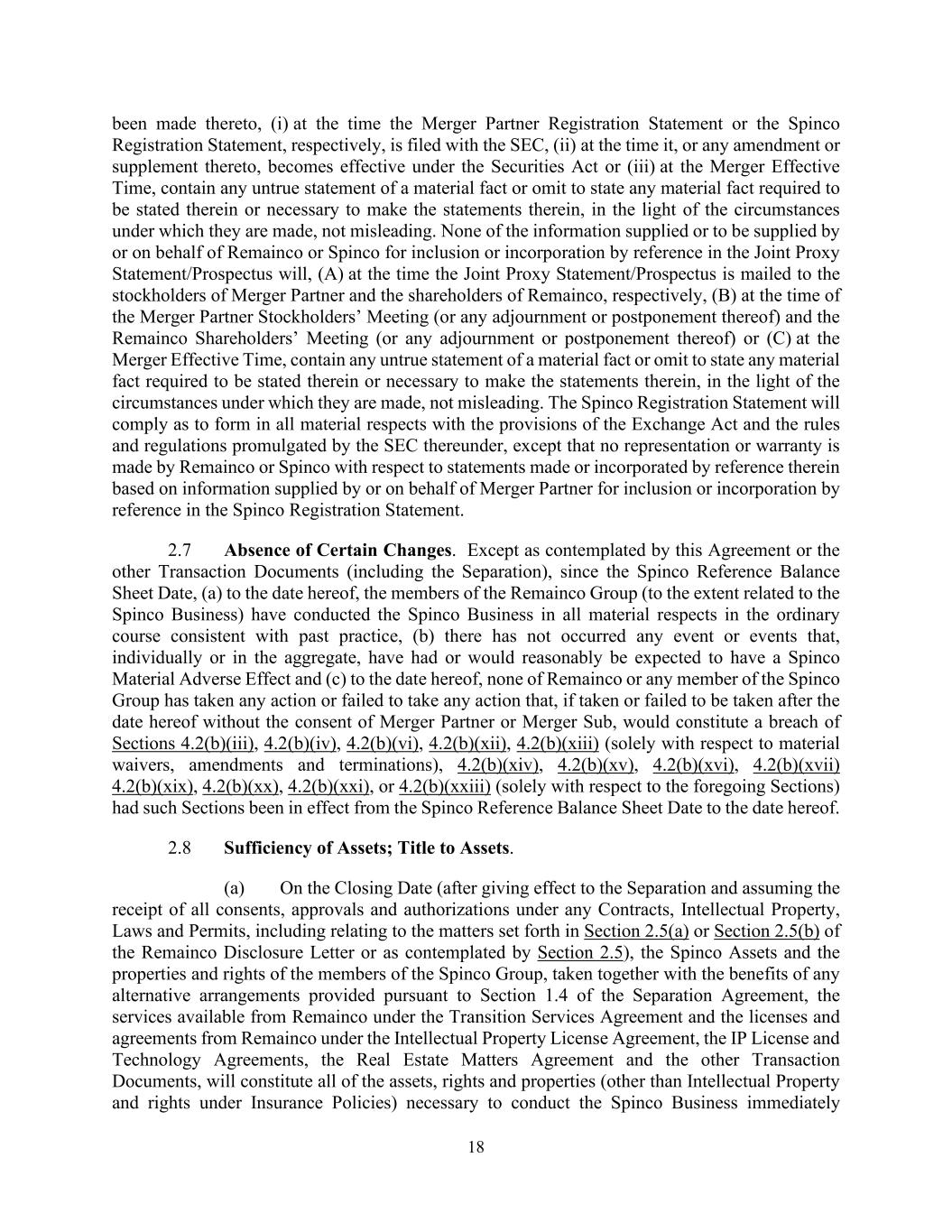 18 been made thereto, (i) at the time the Merger Partner Registration Statement or the Spinco Registration Statement, respectively, is filed with the SEC, (ii) at the time it, or any amendment or supplement thereto, becomes effective under the Securities Act or (iii) at the Merger Effective Time, contain any untrue statement of a material fact or omit to state any material fact required to be stated therein or necessary to make the statements therein, in the light of the circumstances under which they are made, not misleading. None of the information supplied or to be supplied by or on behalf of Remainco or Spinco for inclusion or incorporation by reference in the Joint Proxy Statement/Prospectus will, (A) at the time the Joint Proxy Statement/Prospectus is mailed to the stockholders of Merger Partner and the shareholders of Remainco, respectively, (B) at the time of the Merger Partner Stockholders’ Meeting (or any adjournment or postponement thereof) and the Remainco Shareholders’ Meeting (or any adjournment or postponement thereof) or (C) at the Merger Effective Time, contain any untrue statement of a material fact or omit to state any material fact required to be stated therein or necessary to make the statements therein, in the light of the circumstances under which they are made, not misleading. The Spinco Registration Statement will comply as to form in all material respects with the provisions of the Exchange Act and the rules and regulations promulgated by the SEC thereunder, except that no representation or warranty is made by Remainco or Spinco with respect to statements made or incorporated by reference therein based on information supplied by or on behalf of Merger Partner for inclusion or incorporation by reference in the Spinco Registration Statement. 2.7 Absence of Certain Changes. Except as contemplated by this Agreement or the other Transaction Documents (including the Separation), since the Spinco Reference Balance Sheet Date, (a) to the date hereof, the members of the Remainco Group (to the extent related to the Spinco Business) have conducted the Spinco Business in all material respects in the ordinary course consistent with past practice, (b) there has not occurred any event or events that, individually or in the aggregate, have had or would reasonably be expected to have a Spinco Material Adverse Effect and (c) to the date hereof, none of Remainco or any member of the Spinco Group has taken any action or failed to take any action that, if taken or failed to be taken after the date hereof without the consent of Merger Partner or Merger Sub, would constitute a breach of Sections 4.2(b)(iii), 4.2(b)(iv), 4.2(b)(vi), 4.2(b)(xii), 4.2(b)(xiii) (solely with respect to material waivers, amendments and terminations), 4.2(b)(xiv), 4.2(b)(xv), 4.2(b)(xvi), 4.2(b)(xvii) 4.2(b)(xix), 4.2(b)(xx), 4.2(b)(xxi), or 4.2(b)(xxiii) (solely with respect to the foregoing Sections) had such Sections been in effect from the Spinco Reference Balance Sheet Date to the date hereof. 2.8 Sufficiency of Assets; Title to Assets. (a) On the Closing Date (after giving effect to the Separation and assuming the receipt of all consents, approvals and authorizations under any Contracts, Intellectual Property, Laws and Permits, including relating to the matters set forth in Section 2.5(a) or Section 2.5(b) of the Remainco Disclosure Letter or as contemplated by Section 2.5), the Spinco Assets and the properties and rights of the members of the Spinco Group, taken together with the benefits of any alternative arrangements provided pursuant to Section 1.4 of the Separation Agreement, the services available from Remainco under the Transition Services Agreement and the licenses and agreements from Remainco under the Intellectual Property License Agreement, the IP License and Technology Agreements, the Real Estate Matters Agreement and the other Transaction Documents, will constitute all of the assets, rights and properties (other than Intellectual Property and rights under Insurance Policies) necessary to conduct the Spinco Business immediately