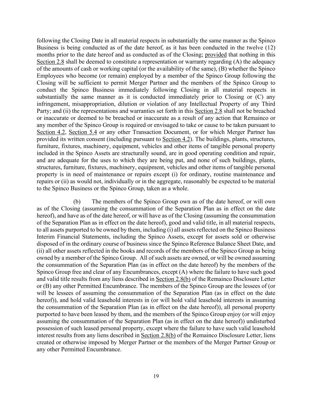 19 following the Closing Date in all material respects in substantially the same manner as the Spinco Business is being conducted as of the date hereof, as it has been conducted in the twelve (12) months prior to the date hereof and as conducted as of the Closing; provided that nothing in this Section 2.8 shall be deemed to constitute a representation or warranty regarding (A) the adequacy of the amounts of cash or working capital (or the availability of the same), (B) whether the Spinco Employees who become (or remain) employed by a member of the Spinco Group following the Closing will be sufficient to permit Merger Partner and the members of the Spinco Group to conduct the Spinco Business immediately following Closing in all material respects in substantially the same manner as it is conducted immediately prior to Closing or (C) any infringement, misappropriation, dilution or violation of any Intellectual Property of any Third Party; and (ii) the representations and warranties set forth in this Section 2.8 shall not be breached or inaccurate or deemed to be breached or inaccurate as a result of any action that Remainco or any member of the Spinco Group is required or envisaged to take or cause to be taken pursuant to Section 4.2, Section 5.4 or any other Transaction Document, or for which Merger Partner has provided its written consent (including pursuant to Section 4.2). The buildings, plants, structures, furniture, fixtures, machinery, equipment, vehicles and other items of tangible personal property included in the Spinco Assets are structurally sound, are in good operating condition and repair, and are adequate for the uses to which they are being put, and none of such buildings, plants, structures, furniture, fixtures, machinery, equipment, vehicles and other items of tangible personal property is in need of maintenance or repairs except (i) for ordinary, routine maintenance and repairs or (ii) as would not, individually or in the aggregate, reasonably be expected to be material to the Spinco Business or the Spinco Group, taken as a whole. (b) The members of the Spinco Group own as of the date hereof, or will own as of the Closing (assuming the consummation of the Separation Plan as in effect on the date hereof), and have as of the date hereof, or will have as of the Closing (assuming the consummation of the Separation Plan as in effect on the date hereof), good and valid title, in all material respects, to all assets purported to be owned by them, including (i) all assets reflected on the Spinco Business Interim Financial Statements, including the Spinco Assets, except for assets sold or otherwise disposed of in the ordinary course of business since the Spinco Reference Balance Sheet Date, and (ii) all other assets reflected in the books and records of the members of the Spinco Group as being owned by a member of the Spinco Group. All of such assets are owned, or will be owned assuming the consummation of the Separation Plan (as in effect on the date hereof) by the members of the Spinco Group free and clear of any Encumbrances, except (A) where the failure to have such good and valid title results from any liens described in Section 2.8(b) of the Remainco Disclosure Letter or (B) any other Permitted Encumbrance. The members of the Spinco Group are the lessees of (or will be lessees of assuming the consummation of the Separation Plan (as in effect on the date hereof)), and hold valid leasehold interests in (or will hold valid leasehold interests in assuming the consummation of the Separation Plan (as in effect on the date hereof)), all personal property purported to have been leased by them, and the members of the Spinco Group enjoy (or will enjoy assuming the consummation of the Separation Plan (as in effect on the date hereof)) undisturbed possession of such leased personal property, except where the failure to have such valid leasehold interest results from any liens described in Section 2.8(b) of the Remainco Disclosure Letter, liens created or otherwise imposed by Merger Partner or the members of the Merger Partner Group or any other Permitted Encumbrance.