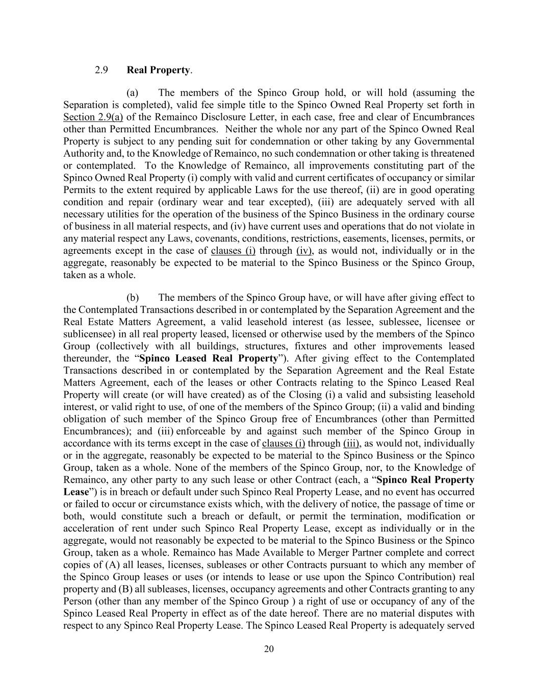 20 2.9 Real Property. (a) The members of the Spinco Group hold, or will hold (assuming the Separation is completed), valid fee simple title to the Spinco Owned Real Property set forth in Section 2.9(a) of the Remainco Disclosure Letter, in each case, free and clear of Encumbrances other than Permitted Encumbrances. Neither the whole nor any part of the Spinco Owned Real Property is subject to any pending suit for condemnation or other taking by any Governmental Authority and, to the Knowledge of Remainco, no such condemnation or other taking is threatened or contemplated. To the Knowledge of Remainco, all improvements constituting part of the Spinco Owned Real Property (i) comply with valid and current certificates of occupancy or similar Permits to the extent required by applicable Laws for the use thereof, (ii) are in good operating condition and repair (ordinary wear and tear excepted), (iii) are adequately served with all necessary utilities for the operation of the business of the Spinco Business in the ordinary course of business in all material respects, and (iv) have current uses and operations that do not violate in any material respect any Laws, covenants, conditions, restrictions, easements, licenses, permits, or agreements except in the case of clauses (i) through (iv), as would not, individually or in the aggregate, reasonably be expected to be material to the Spinco Business or the Spinco Group, taken as a whole. (b) The members of the Spinco Group have, or will have after giving effect to the Contemplated Transactions described in or contemplated by the Separation Agreement and the Real Estate Matters Agreement, a valid leasehold interest (as lessee, sublessee, licensee or sublicensee) in all real property leased, licensed or otherwise used by the members of the Spinco Group (collectively with all buildings, structures, fixtures and other improvements leased thereunder, the “Spinco Leased Real Property”). After giving effect to the Contemplated Transactions described in or contemplated by the Separation Agreement and the Real Estate Matters Agreement, each of the leases or other Contracts relating to the Spinco Leased Real Property will create (or will have created) as of the Closing (i) a valid and subsisting leasehold interest, or valid right to use, of one of the members of the Spinco Group; (ii) a valid and binding obligation of such member of the Spinco Group free of Encumbrances (other than Permitted Encumbrances); and (iii) enforceable by and against such member of the Spinco Group in accordance with its terms except in the case of clauses (i) through (iii), as would not, individually or in the aggregate, reasonably be expected to be material to the Spinco Business or the Spinco Group, taken as a whole. None of the members of the Spinco Group, nor, to the Knowledge of Remainco, any other party to any such lease or other Contract (each, a “Spinco Real Property Lease”) is in breach or default under such Spinco Real Property Lease, and no event has occurred or failed to occur or circumstance exists which, with the delivery of notice, the passage of time or both, would constitute such a breach or default, or permit the termination, modification or acceleration of rent under such Spinco Real Property Lease, except as individually or in the aggregate, would not reasonably be expected to be material to the Spinco Business or the Spinco Group, taken as a whole. Remainco has Made Available to Merger Partner complete and correct copies of (A) all leases, licenses, subleases or other Contracts pursuant to which any member of the Spinco Group leases or uses (or intends to lease or use upon the Spinco Contribution) real property and (B) all subleases, licenses, occupancy agreements and other Contracts granting to any Person (other than any member of the Spinco Group ) a right of use or occupancy of any of the Spinco Leased Real Property in effect as of the date hereof. There are no material disputes with respect to any Spinco Real Property Lease. The Spinco Leased Real Property is adequately served