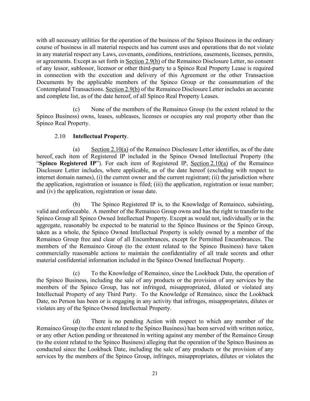 21 with all necessary utilities for the operation of the business of the Spinco Business in the ordinary course of business in all material respects and has current uses and operations that do not violate in any material respect any Laws, covenants, conditions, restrictions, easements, licenses, permits, or agreements. Except as set forth in Section 2.9(b) of the Remainco Disclosure Letter, no consent of any lessor, sublessor, licensor or other third-party to a Spinco Real Property Lease is required in connection with the execution and delivery of this Agreement or the other Transaction Documents by the applicable members of the Spinco Group or the consummation of the Contemplated Transactions. Section 2.9(b) of the Remainco Disclosure Letter includes an accurate and complete list, as of the date hereof, of all Spinco Real Property Leases. (c) None of the members of the Remainco Group (to the extent related to the Spinco Business) owns, leases, subleases, licenses or occupies any real property other than the Spinco Real Property. 2.10 Intellectual Property. (a) Section 2.10(a) of the Remainco Disclosure Letter identifies, as of the date hereof, each item of Registered IP included in the Spinco Owned Intellectual Property (the “Spinco Registered IP”). For each item of Registered IP, Section 2.10(a) of the Remainco Disclosure Letter includes, where applicable, as of the date hereof (excluding with respect to internet domain names), (i) the current owner and the current registrant; (ii) the jurisdiction where the application, registration or issuance is filed; (iii) the application, registration or issue number; and (iv) the application, registration or issue date. (b) The Spinco Registered IP is, to the Knowledge of Remainco, subsisting, valid and enforceable. A member of the Remainco Group owns and has the right to transfer to the Spinco Group all Spinco Owned Intellectual Property. Except as would not, individually or in the aggregate, reasonably be expected to be material to the Spinco Business or the Spinco Group, taken as a whole, the Spinco Owned Intellectual Property is solely owned by a member of the Remainco Group free and clear of all Encumbrances, except for Permitted Encumbrances. The members of the Remainco Group (to the extent related to the Spinco Business) have taken commercially reasonable actions to maintain the confidentiality of all trade secrets and other material confidential information included in the Spinco Owned Intellectual Property. (c) To the Knowledge of Remainco, since the Lookback Date, the operation of the Spinco Business, including the sale of any products or the provision of any services by the members of the Spinco Group, has not infringed, misappropriated, diluted or violated any Intellectual Property of any Third Party. To the Knowledge of Remainco, since the Lookback Date, no Person has been or is engaging in any activity that infringes, misappropriates, dilutes or violates any of the Spinco Owned Intellectual Property. (d) There is no pending Action with respect to which any member of the Remainco Group (to the extent related to the Spinco Business) has been served with written notice, or any other Action pending or threatened in writing against any member of the Remainco Group (to the extent related to the Spinco Business) alleging that the operation of the Spinco Business as conducted since the Lookback Date, including the sale of any products or the provision of any services by the members of the Spinco Group, infringes, misappropriates, dilutes or violates the