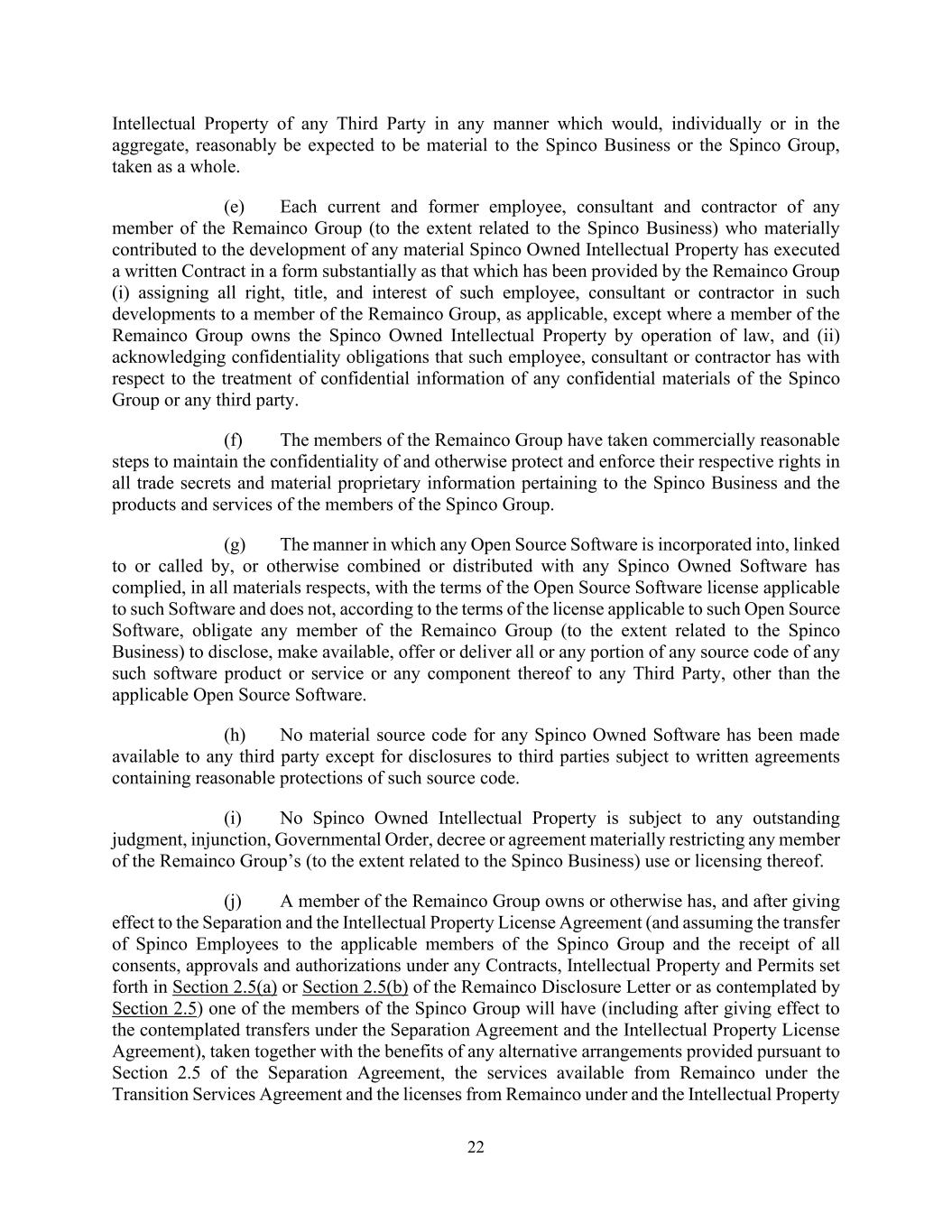 22 Intellectual Property of any Third Party in any manner which would, individually or in the aggregate, reasonably be expected to be material to the Spinco Business or the Spinco Group, taken as a whole. (e) Each current and former employee, consultant and contractor of any member of the Remainco Group (to the extent related to the Spinco Business) who materially contributed to the development of any material Spinco Owned Intellectual Property has executed a written Contract in a form substantially as that which has been provided by the Remainco Group (i) assigning all right, title, and interest of such employee, consultant or contractor in such developments to a member of the Remainco Group, as applicable, except where a member of the Remainco Group owns the Spinco Owned Intellectual Property by operation of law, and (ii) acknowledging confidentiality obligations that such employee, consultant or contractor has with respect to the treatment of confidential information of any confidential materials of the Spinco Group or any third party. (f) The members of the Remainco Group have taken commercially reasonable steps to maintain the confidentiality of and otherwise protect and enforce their respective rights in all trade secrets and material proprietary information pertaining to the Spinco Business and the products and services of the members of the Spinco Group. (g) The manner in which any Open Source Software is incorporated into, linked to or called by, or otherwise combined or distributed with any Spinco Owned Software has complied, in all materials respects, with the terms of the Open Source Software license applicable to such Software and does not, according to the terms of the license applicable to such Open Source Software, obligate any member of the Remainco Group (to the extent related to the Spinco Business) to disclose, make available, offer or deliver all or any portion of any source code of any such software product or service or any component thereof to any Third Party, other than the applicable Open Source Software. (h) No material source code for any Spinco Owned Software has been made available to any third party except for disclosures to third parties subject to written agreements containing reasonable protections of such source code. (i) No Spinco Owned Intellectual Property is subject to any outstanding judgment, injunction, Governmental Order, decree or agreement materially restricting any member of the Remainco Group’s (to the extent related to the Spinco Business) use or licensing thereof. (j) A member of the Remainco Group owns or otherwise has, and after giving effect to the Separation and the Intellectual Property License Agreement (and assuming the transfer of Spinco Employees to the applicable members of the Spinco Group and the receipt of all consents, approvals and authorizations under any Contracts, Intellectual Property and Permits set forth in Section 2.5(a) or Section 2.5(b) of the Remainco Disclosure Letter or as contemplated by Section 2.5) one of the members of the Spinco Group will have (including after giving effect to the contemplated transfers under the Separation Agreement and the Intellectual Property License Agreement), taken together with the benefits of any alternative arrangements provided pursuant to Section 2.5 of the Separation Agreement, the services available from Remainco under the Transition Services Agreement and the licenses from Remainco under and the Intellectual Property
