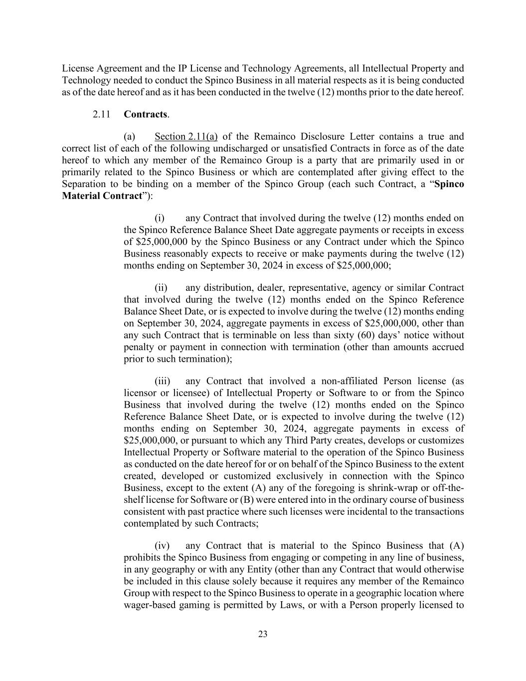 23 License Agreement and the IP License and Technology Agreements, all Intellectual Property and Technology needed to conduct the Spinco Business in all material respects as it is being conducted as of the date hereof and as it has been conducted in the twelve (12) months prior to the date hereof. 2.11 Contracts. (a) Section 2.11(a) of the Remainco Disclosure Letter contains a true and correct list of each of the following undischarged or unsatisfied Contracts in force as of the date hereof to which any member of the Remainco Group is a party that are primarily used in or primarily related to the Spinco Business or which are contemplated after giving effect to the Separation to be binding on a member of the Spinco Group (each such Contract, a “Spinco Material Contract”): (i) any Contract that involved during the twelve (12) months ended on the Spinco Reference Balance Sheet Date aggregate payments or receipts in excess of $25,000,000 by the Spinco Business or any Contract under which the Spinco Business reasonably expects to receive or make payments during the twelve (12) months ending on September 30, 2024 in excess of $25,000,000; (ii) any distribution, dealer, representative, agency or similar Contract that involved during the twelve (12) months ended on the Spinco Reference Balance Sheet Date, or is expected to involve during the twelve (12) months ending on September 30, 2024, aggregate payments in excess of $25,000,000, other than any such Contract that is terminable on less than sixty (60) days’ notice without penalty or payment in connection with termination (other than amounts accrued prior to such termination); (iii) any Contract that involved a non-affiliated Person license (as licensor or licensee) of Intellectual Property or Software to or from the Spinco Business that involved during the twelve (12) months ended on the Spinco Reference Balance Sheet Date, or is expected to involve during the twelve (12) months ending on September 30, 2024, aggregate payments in excess of $25,000,000, or pursuant to which any Third Party creates, develops or customizes Intellectual Property or Software material to the operation of the Spinco Business as conducted on the date hereof for or on behalf of the Spinco Business to the extent created, developed or customized exclusively in connection with the Spinco Business, except to the extent (A) any of the foregoing is shrink-wrap or off-the- shelf license for Software or (B) were entered into in the ordinary course of business consistent with past practice where such licenses were incidental to the transactions contemplated by such Contracts; (iv) any Contract that is material to the Spinco Business that (A) prohibits the Spinco Business from engaging or competing in any line of business, in any geography or with any Entity (other than any Contract that would otherwise be included in this clause solely because it requires any member of the Remainco Group with respect to the Spinco Business to operate in a geographic location where wager-based gaming is permitted by Laws, or with a Person properly licensed to