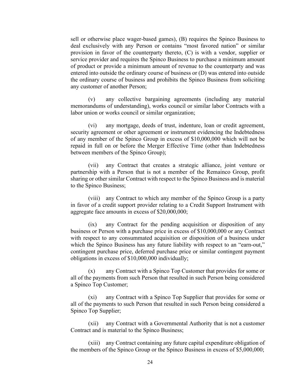 24 sell or otherwise place wager-based games), (B) requires the Spinco Business to deal exclusively with any Person or contains “most favored nation” or similar provision in favor of the counterparty thereto, (C) is with a vendor, supplier or service provider and requires the Spinco Business to purchase a minimum amount of product or provide a minimum amount of revenue to the counterparty and was entered into outside the ordinary course of business or (D) was entered into outside the ordinary course of business and prohibits the Spinco Business from soliciting any customer of another Person; (v) any collective bargaining agreements (including any material memorandums of understanding), works council or similar labor Contracts with a labor union or works council or similar organization; (vi) any mortgage, deeds of trust, indenture, loan or credit agreement, security agreement or other agreement or instrument evidencing the Indebtedness of any member of the Spinco Group in excess of $10,000,000 which will not be repaid in full on or before the Merger Effective Time (other than Indebtedness between members of the Spinco Group); (vii) any Contract that creates a strategic alliance, joint venture or partnership with a Person that is not a member of the Remainco Group, profit sharing or other similar Contract with respect to the Spinco Business and is material to the Spinco Business; (viii) any Contract to which any member of the Spinco Group is a party in favor of a credit support provider relating to a Credit Support Instrument with aggregate face amounts in excess of $20,000,000; (ix) any Contract for the pending acquisition or disposition of any business or Person with a purchase price in excess of $10,000,000 or any Contract with respect to any consummated acquisition or disposition of a business under which the Spinco Business has any future liability with respect to an “earn-out,” contingent purchase price, deferred purchase price or similar contingent payment obligations in excess of $10,000,000 individually; (x) any Contract with a Spinco Top Customer that provides for some or all of the payments from such Person that resulted in such Person being considered a Spinco Top Customer; (xi) any Contract with a Spinco Top Supplier that provides for some or all of the payments to such Person that resulted in such Person being considered a Spinco Top Supplier; (xii) any Contract with a Governmental Authority that is not a customer Contract and is material to the Spinco Business; (xiii) any Contract containing any future capital expenditure obligation of the members of the Spinco Group or the Spinco Business in excess of $5,000,000;