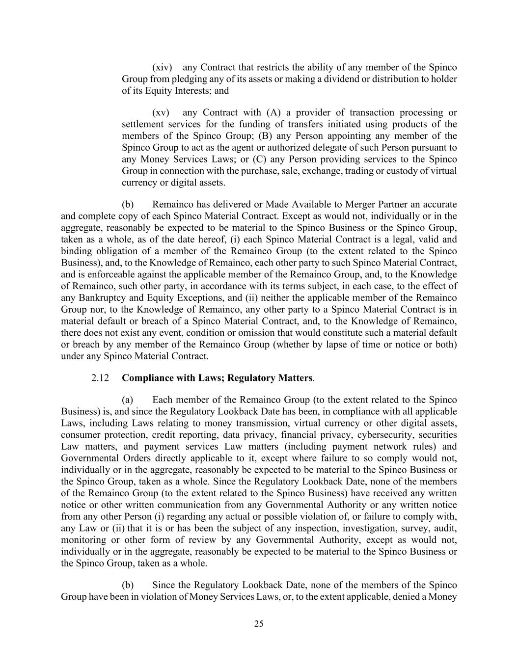25 (xiv) any Contract that restricts the ability of any member of the Spinco Group from pledging any of its assets or making a dividend or distribution to holder of its Equity Interests; and (xv) any Contract with (A) a provider of transaction processing or settlement services for the funding of transfers initiated using products of the members of the Spinco Group; (B) any Person appointing any member of the Spinco Group to act as the agent or authorized delegate of such Person pursuant to any Money Services Laws; or (C) any Person providing services to the Spinco Group in connection with the purchase, sale, exchange, trading or custody of virtual currency or digital assets. (b) Remainco has delivered or Made Available to Merger Partner an accurate and complete copy of each Spinco Material Contract. Except as would not, individually or in the aggregate, reasonably be expected to be material to the Spinco Business or the Spinco Group, taken as a whole, as of the date hereof, (i) each Spinco Material Contract is a legal, valid and binding obligation of a member of the Remainco Group (to the extent related to the Spinco Business), and, to the Knowledge of Remainco, each other party to such Spinco Material Contract, and is enforceable against the applicable member of the Remainco Group, and, to the Knowledge of Remainco, such other party, in accordance with its terms subject, in each case, to the effect of any Bankruptcy and Equity Exceptions, and (ii) neither the applicable member of the Remainco Group nor, to the Knowledge of Remainco, any other party to a Spinco Material Contract is in material default or breach of a Spinco Material Contract, and, to the Knowledge of Remainco, there does not exist any event, condition or omission that would constitute such a material default or breach by any member of the Remainco Group (whether by lapse of time or notice or both) under any Spinco Material Contract. 2.12 Compliance with Laws; Regulatory Matters. (a) Each member of the Remainco Group (to the extent related to the Spinco Business) is, and since the Regulatory Lookback Date has been, in compliance with all applicable Laws, including Laws relating to money transmission, virtual currency or other digital assets, consumer protection, credit reporting, data privacy, financial privacy, cybersecurity, securities Law matters, and payment services Law matters (including payment network rules) and Governmental Orders directly applicable to it, except where failure to so comply would not, individually or in the aggregate, reasonably be expected to be material to the Spinco Business or the Spinco Group, taken as a whole. Since the Regulatory Lookback Date, none of the members of the Remainco Group (to the extent related to the Spinco Business) have received any written notice or other written communication from any Governmental Authority or any written notice from any other Person (i) regarding any actual or possible violation of, or failure to comply with, any Law or (ii) that it is or has been the subject of any inspection, investigation, survey, audit, monitoring or other form of review by any Governmental Authority, except as would not, individually or in the aggregate, reasonably be expected to be material to the Spinco Business or the Spinco Group, taken as a whole. (b) Since the Regulatory Lookback Date, none of the members of the Spinco Group have been in violation of Money Services Laws, or, to the extent applicable, denied a Money