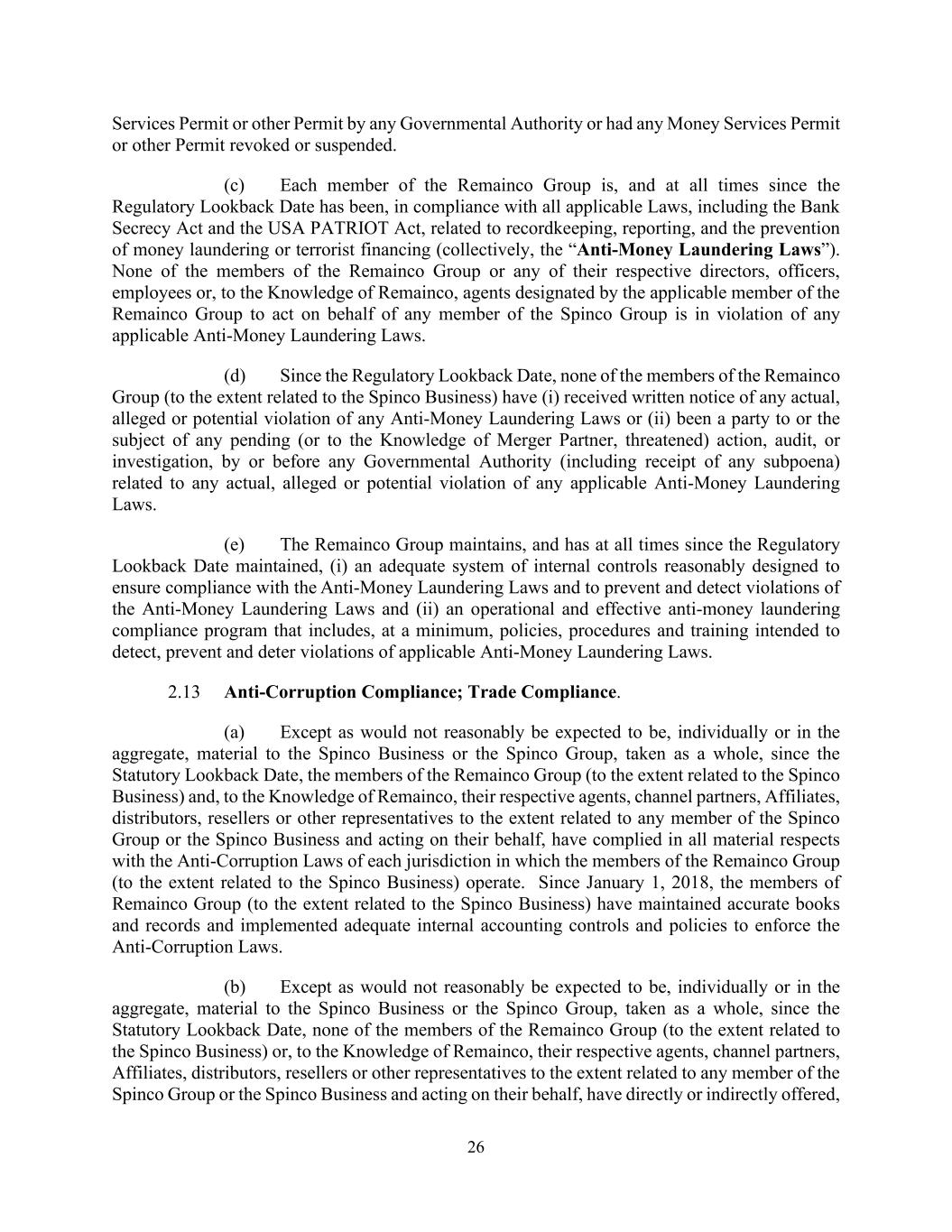 26 Services Permit or other Permit by any Governmental Authority or had any Money Services Permit or other Permit revoked or suspended. (c) Each member of the Remainco Group is, and at all times since the Regulatory Lookback Date has been, in compliance with all applicable Laws, including the Bank Secrecy Act and the USA PATRIOT Act, related to recordkeeping, reporting, and the prevention of money laundering or terrorist financing (collectively, the “Anti-Money Laundering Laws”). None of the members of the Remainco Group or any of their respective directors, officers, employees or, to the Knowledge of Remainco, agents designated by the applicable member of the Remainco Group to act on behalf of any member of the Spinco Group is in violation of any applicable Anti-Money Laundering Laws. (d) Since the Regulatory Lookback Date, none of the members of the Remainco Group (to the extent related to the Spinco Business) have (i) received written notice of any actual, alleged or potential violation of any Anti-Money Laundering Laws or (ii) been a party to or the subject of any pending (or to the Knowledge of Merger Partner, threatened) action, audit, or investigation, by or before any Governmental Authority (including receipt of any subpoena) related to any actual, alleged or potential violation of any applicable Anti-Money Laundering Laws. (e) The Remainco Group maintains, and has at all times since the Regulatory Lookback Date maintained, (i) an adequate system of internal controls reasonably designed to ensure compliance with the Anti-Money Laundering Laws and to prevent and detect violations of the Anti-Money Laundering Laws and (ii) an operational and effective anti-money laundering compliance program that includes, at a minimum, policies, procedures and training intended to detect, prevent and deter violations of applicable Anti-Money Laundering Laws. 2.13 Anti-Corruption Compliance; Trade Compliance. (a) Except as would not reasonably be expected to be, individually or in the aggregate, material to the Spinco Business or the Spinco Group, taken as a whole, since the Statutory Lookback Date, the members of the Remainco Group (to the extent related to the Spinco Business) and, to the Knowledge of Remainco, their respective agents, channel partners, Affiliates, distributors, resellers or other representatives to the extent related to any member of the Spinco Group or the Spinco Business and acting on their behalf, have complied in all material respects with the Anti-Corruption Laws of each jurisdiction in which the members of the Remainco Group (to the extent related to the Spinco Business) operate. Since January 1, 2018, the members of Remainco Group (to the extent related to the Spinco Business) have maintained accurate books and records and implemented adequate internal accounting controls and policies to enforce the Anti-Corruption Laws. (b) Except as would not reasonably be expected to be, individually or in the aggregate, material to the Spinco Business or the Spinco Group, taken as a whole, since the Statutory Lookback Date, none of the members of the Remainco Group (to the extent related to the Spinco Business) or, to the Knowledge of Remainco, their respective agents, channel partners, Affiliates, distributors, resellers or other representatives to the extent related to any member of the Spinco Group or the Spinco Business and acting on their behalf, have directly or indirectly offered,