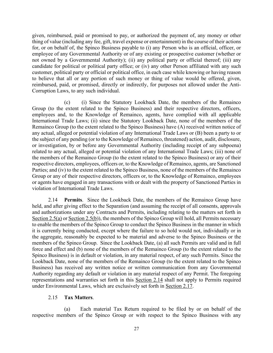 27 given, reimbursed, paid or promised to pay, or authorized the payment of, any money or other thing of value (including any fee, gift, travel expense or entertainment) in the course of their actions for, or on behalf of, the Spinco Business payable to (i) any Person who is an official, officer, or employee of any Governmental Authority or of any existing or prospective customer (whether or not owned by a Governmental Authority); (ii) any political party or official thereof; (iii) any candidate for political or political party office; or (iv) any other Person affiliated with any such customer, political party or official or political office, in each case while knowing or having reason to believe that all or any portion of such money or thing of value would be offered, given, reimbursed, paid, or promised, directly or indirectly, for purposes not allowed under the Anti- Corruption Laws, to any such individual. (c) (i) Since the Statutory Lookback Date, the members of the Remainco Group (to the extent related to the Spinco Business) and their respective directors, officers, employees and, to the Knowledge of Remainco, agents, have complied with all applicable International Trade Laws; (ii) since the Statutory Lookback Date, none of the members of the Remainco Group (to the extent related to the Spinco Business) have (A) received written notice of any actual, alleged or potential violation of any International Trade Laws or (B) been a party to or the subject of any pending (or to the Knowledge of Remainco, threatened) action, audit, disclosure, or investigation, by or before any Governmental Authority (including receipt of any subpoena) related to any actual, alleged or potential violation of any International Trade Laws; (iii) none of the members of the Remainco Group (to the extent related to the Spinco Business) or any of their respective directors, employees, officers or, to the Knowledge of Remainco, agents, are Sanctioned Parties; and (iv) to the extent related to the Spinco Business, none of the members of the Remainco Group or any of their respective directors, officers or, to the Knowledge of Remainco, employees or agents have engaged in any transactions with or dealt with the property of Sanctioned Parties in violation of International Trade Laws. 2.14 Permits. Since the Lookback Date, the members of the Remainco Group have held, and after giving effect to the Separation (and assuming the receipt of all consents, approvals and authorizations under any Contracts and Permits, including relating to the matters set forth in Section 2.5(a) or Section 2.5(b)), the members of the Spinco Group will hold, all Permits necessary to enable the members of the Spinco Group to conduct the Spinco Business in the manner in which it is currently being conducted, except where the failure to so hold would not, individually or in the aggregate, reasonably be expected to be material and adverse to the Spinco Business or the members of the Spinco Group. Since the Lookback Date, (a) all such Permits are valid and in full force and effect and (b) none of the members of the Remainco Group (to the extent related to the Spinco Business) is in default or violation, in any material respect, of any such Permits. Since the Lookback Date, none of the members of the Remainco Group (to the extent related to the Spinco Business) has received any written notice or written communication from any Governmental Authority regarding any default or violation in any material respect of any Permit. The foregoing representations and warranties set forth in this Section 2.14 shall not apply to Permits required under Environmental Laws, which are exclusively set forth in Section 2.17. 2.15 Tax Matters. (a) Each material Tax Return required to be filed by or on behalf of the respective members of the Spinco Group or with respect to the Spinco Business with any
