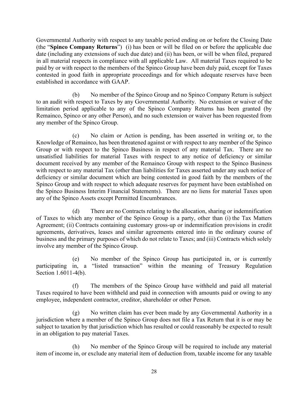 28 Governmental Authority with respect to any taxable period ending on or before the Closing Date (the “Spinco Company Returns”) (i) has been or will be filed on or before the applicable due date (including any extensions of such due date) and (ii) has been, or will be when filed, prepared in all material respects in compliance with all applicable Law. All material Taxes required to be paid by or with respect to the members of the Spinco Group have been duly paid, except for Taxes contested in good faith in appropriate proceedings and for which adequate reserves have been established in accordance with GAAP. (b) No member of the Spinco Group and no Spinco Company Return is subject to an audit with respect to Taxes by any Governmental Authority. No extension or waiver of the limitation period applicable to any of the Spinco Company Returns has been granted (by Remainco, Spinco or any other Person), and no such extension or waiver has been requested from any member of the Spinco Group. (c) No claim or Action is pending, has been asserted in writing or, to the Knowledge of Remainco, has been threatened against or with respect to any member of the Spinco Group or with respect to the Spinco Business in respect of any material Tax. There are no unsatisfied liabilities for material Taxes with respect to any notice of deficiency or similar document received by any member of the Remainco Group with respect to the Spinco Business with respect to any material Tax (other than liabilities for Taxes asserted under any such notice of deficiency or similar document which are being contested in good faith by the members of the Spinco Group and with respect to which adequate reserves for payment have been established on the Spinco Business Interim Financial Statements). There are no liens for material Taxes upon any of the Spinco Assets except Permitted Encumbrances. (d) There are no Contracts relating to the allocation, sharing or indemnification of Taxes to which any member of the Spinco Group is a party, other than (i) the Tax Matters Agreement; (ii) Contracts containing customary gross-up or indemnification provisions in credit agreements, derivatives, leases and similar agreements entered into in the ordinary course of business and the primary purposes of which do not relate to Taxes; and (iii) Contracts which solely involve any member of the Spinco Group. (e) No member of the Spinco Group has participated in, or is currently participating in, a “listed transaction” within the meaning of Treasury Regulation Section 1.6011-4(b). (f) The members of the Spinco Group have withheld and paid all material Taxes required to have been withheld and paid in connection with amounts paid or owing to any employee, independent contractor, creditor, shareholder or other Person. (g) No written claim has ever been made by any Governmental Authority in a jurisdiction where a member of the Spinco Group does not file a Tax Return that it is or may be subject to taxation by that jurisdiction which has resulted or could reasonably be expected to result in an obligation to pay material Taxes. (h) No member of the Spinco Group will be required to include any material item of income in, or exclude any material item of deduction from, taxable income for any taxable
