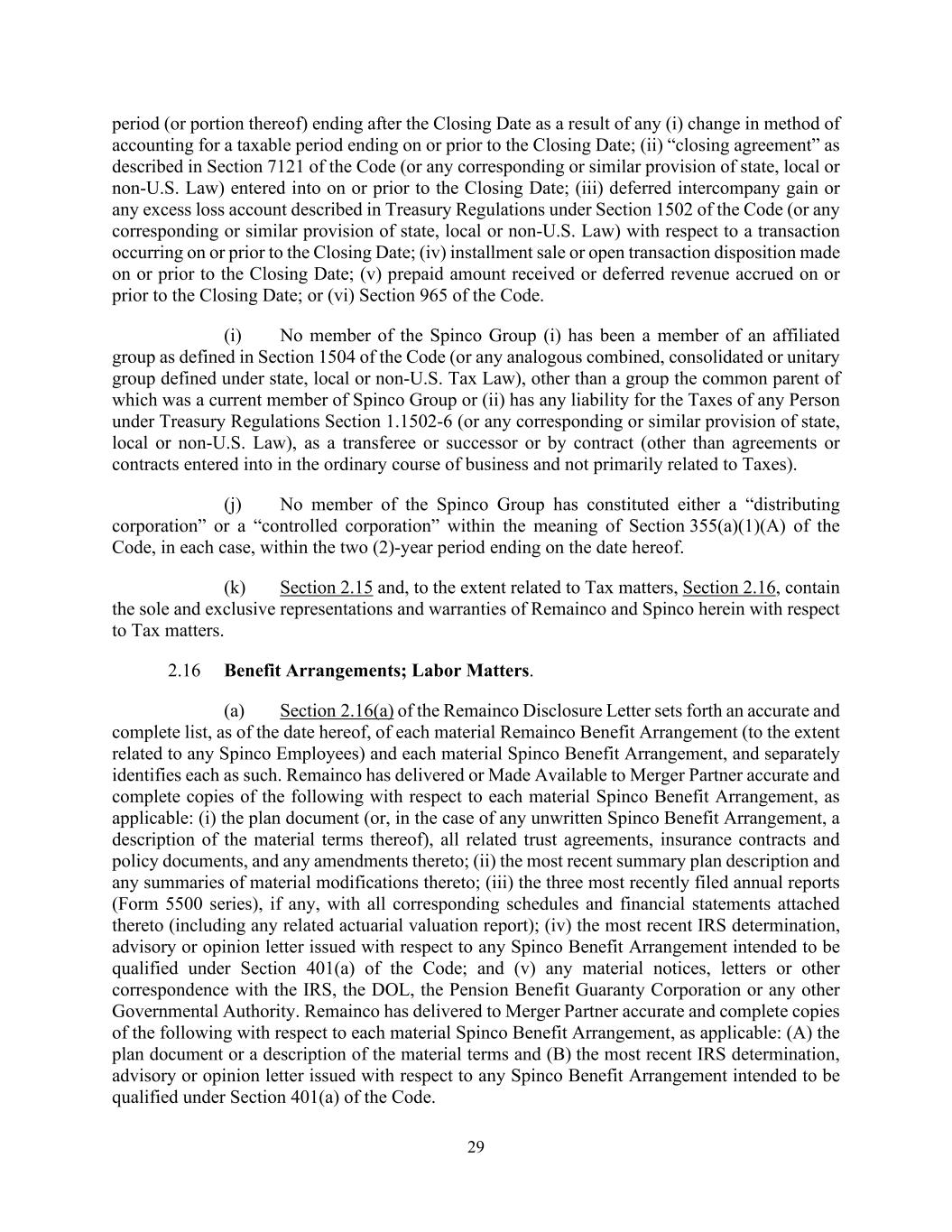 29 period (or portion thereof) ending after the Closing Date as a result of any (i) change in method of accounting for a taxable period ending on or prior to the Closing Date; (ii) “closing agreement” as described in Section 7121 of the Code (or any corresponding or similar provision of state, local or non-U.S. Law) entered into on or prior to the Closing Date; (iii) deferred intercompany gain or any excess loss account described in Treasury Regulations under Section 1502 of the Code (or any corresponding or similar provision of state, local or non-U.S. Law) with respect to a transaction occurring on or prior to the Closing Date; (iv) installment sale or open transaction disposition made on or prior to the Closing Date; (v) prepaid amount received or deferred revenue accrued on or prior to the Closing Date; or (vi) Section 965 of the Code. (i) No member of the Spinco Group (i) has been a member of an affiliated group as defined in Section 1504 of the Code (or any analogous combined, consolidated or unitary group defined under state, local or non-U.S. Tax Law), other than a group the common parent of which was a current member of Spinco Group or (ii) has any liability for the Taxes of any Person under Treasury Regulations Section 1.1502-6 (or any corresponding or similar provision of state, local or non-U.S. Law), as a transferee or successor or by contract (other than agreements or contracts entered into in the ordinary course of business and not primarily related to Taxes). (j) No member of the Spinco Group has constituted either a “distributing corporation” or a “controlled corporation” within the meaning of Section 355(a)(1)(A) of the Code, in each case, within the two (2)-year period ending on the date hereof. (k) Section 2.15 and, to the extent related to Tax matters, Section 2.16, contain the sole and exclusive representations and warranties of Remainco and Spinco herein with respect to Tax matters. 2.16 Benefit Arrangements; Labor Matters. (a) Section 2.16(a) of the Remainco Disclosure Letter sets forth an accurate and complete list, as of the date hereof, of each material Remainco Benefit Arrangement (to the extent related to any Spinco Employees) and each material Spinco Benefit Arrangement, and separately identifies each as such. Remainco has delivered or Made Available to Merger Partner accurate and complete copies of the following with respect to each material Spinco Benefit Arrangement, as applicable: (i) the plan document (or, in the case of any unwritten Spinco Benefit Arrangement, a description of the material terms thereof), all related trust agreements, insurance contracts and policy documents, and any amendments thereto; (ii) the most recent summary plan description and any summaries of material modifications thereto; (iii) the three most recently filed annual reports (Form 5500 series), if any, with all corresponding schedules and financial statements attached thereto (including any related actuarial valuation report); (iv) the most recent IRS determination, advisory or opinion letter issued with respect to any Spinco Benefit Arrangement intended to be qualified under Section 401(a) of the Code; and (v) any material notices, letters or other correspondence with the IRS, the DOL, the Pension Benefit Guaranty Corporation or any other Governmental Authority. Remainco has delivered to Merger Partner accurate and complete copies of the following with respect to each material Spinco Benefit Arrangement, as applicable: (A) the plan document or a description of the material terms and (B) the most recent IRS determination, advisory or opinion letter issued with respect to any Spinco Benefit Arrangement intended to be qualified under Section 401(a) of the Code.