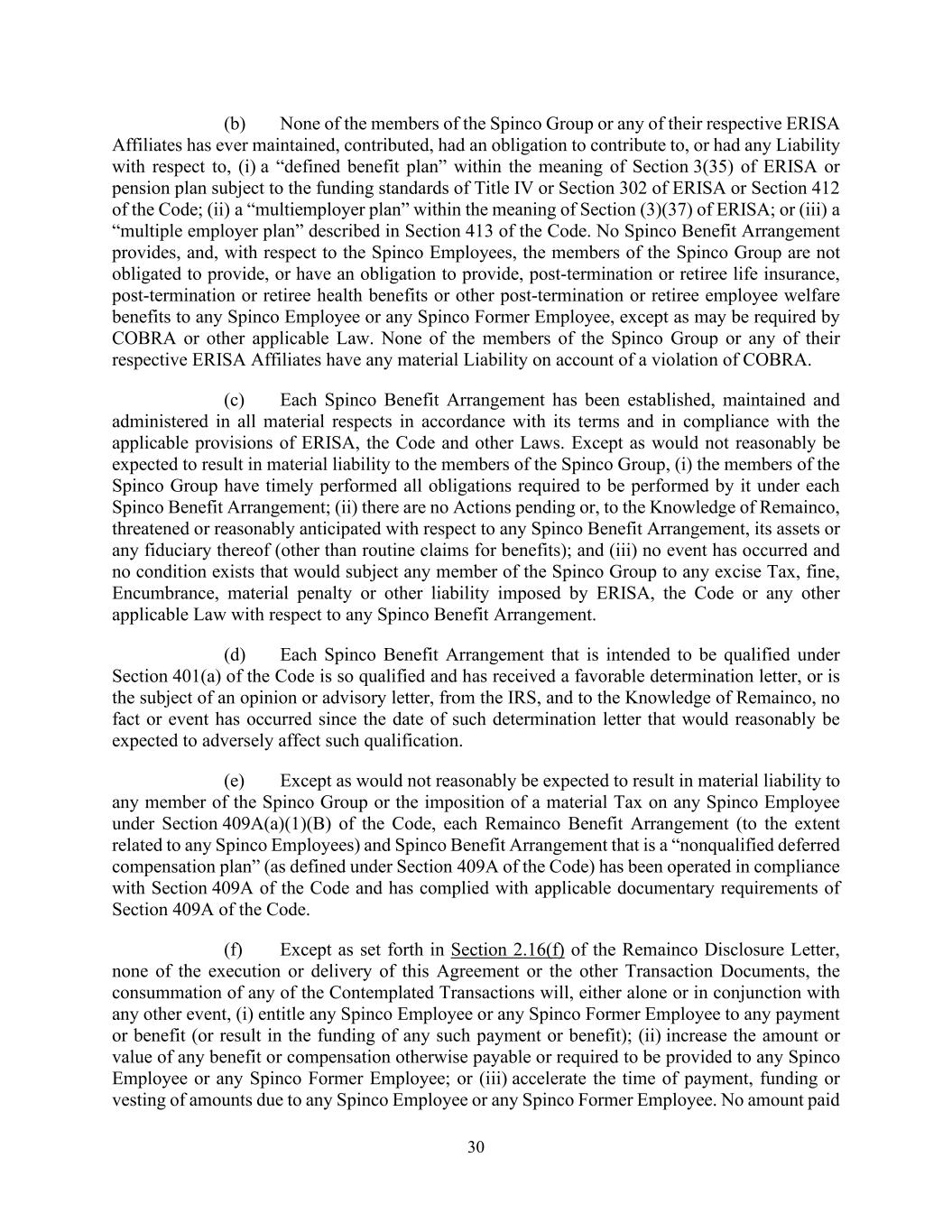 30 (b) None of the members of the Spinco Group or any of their respective ERISA Affiliates has ever maintained, contributed, had an obligation to contribute to, or had any Liability with respect to, (i) a “defined benefit plan” within the meaning of Section 3(35) of ERISA or pension plan subject to the funding standards of Title IV or Section 302 of ERISA or Section 412 of the Code; (ii) a “multiemployer plan” within the meaning of Section (3)(37) of ERISA; or (iii) a “multiple employer plan” described in Section 413 of the Code. No Spinco Benefit Arrangement provides, and, with respect to the Spinco Employees, the members of the Spinco Group are not obligated to provide, or have an obligation to provide, post-termination or retiree life insurance, post-termination or retiree health benefits or other post-termination or retiree employee welfare benefits to any Spinco Employee or any Spinco Former Employee, except as may be required by COBRA or other applicable Law. None of the members of the Spinco Group or any of their respective ERISA Affiliates have any material Liability on account of a violation of COBRA. (c) Each Spinco Benefit Arrangement has been established, maintained and administered in all material respects in accordance with its terms and in compliance with the applicable provisions of ERISA, the Code and other Laws. Except as would not reasonably be expected to result in material liability to the members of the Spinco Group, (i) the members of the Spinco Group have timely performed all obligations required to be performed by it under each Spinco Benefit Arrangement; (ii) there are no Actions pending or, to the Knowledge of Remainco, threatened or reasonably anticipated with respect to any Spinco Benefit Arrangement, its assets or any fiduciary thereof (other than routine claims for benefits); and (iii) no event has occurred and no condition exists that would subject any member of the Spinco Group to any excise Tax, fine, Encumbrance, material penalty or other liability imposed by ERISA, the Code or any other applicable Law with respect to any Spinco Benefit Arrangement. (d) Each Spinco Benefit Arrangement that is intended to be qualified under Section 401(a) of the Code is so qualified and has received a favorable determination letter, or is the subject of an opinion or advisory letter, from the IRS, and to the Knowledge of Remainco, no fact or event has occurred since the date of such determination letter that would reasonably be expected to adversely affect such qualification. (e) Except as would not reasonably be expected to result in material liability to any member of the Spinco Group or the imposition of a material Tax on any Spinco Employee under Section 409A(a)(1)(B) of the Code, each Remainco Benefit Arrangement (to the extent related to any Spinco Employees) and Spinco Benefit Arrangement that is a “nonqualified deferred compensation plan” (as defined under Section 409A of the Code) has been operated in compliance with Section 409A of the Code and has complied with applicable documentary requirements of Section 409A of the Code. (f) Except as set forth in Section 2.16(f) of the Remainco Disclosure Letter, none of the execution or delivery of this Agreement or the other Transaction Documents, the consummation of any of the Contemplated Transactions will, either alone or in conjunction with any other event, (i) entitle any Spinco Employee or any Spinco Former Employee to any payment or benefit (or result in the funding of any such payment or benefit); (ii) increase the amount or value of any benefit or compensation otherwise payable or required to be provided to any Spinco Employee or any Spinco Former Employee; or (iii) accelerate the time of payment, funding or vesting of amounts due to any Spinco Employee or any Spinco Former Employee. No amount paid