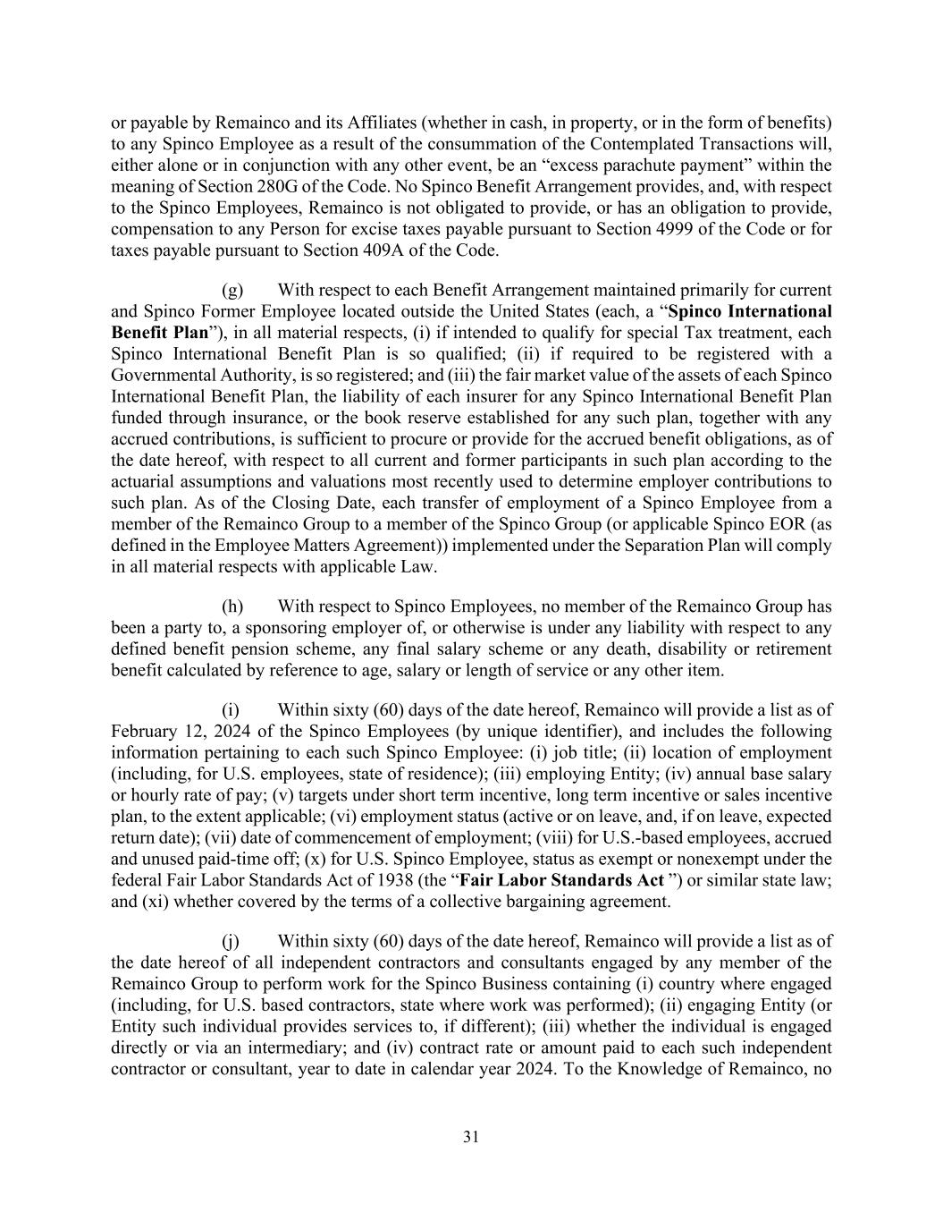 31 or payable by Remainco and its Affiliates (whether in cash, in property, or in the form of benefits) to any Spinco Employee as a result of the consummation of the Contemplated Transactions will, either alone or in conjunction with any other event, be an “excess parachute payment” within the meaning of Section 280G of the Code. No Spinco Benefit Arrangement provides, and, with respect to the Spinco Employees, Remainco is not obligated to provide, or has an obligation to provide, compensation to any Person for excise taxes payable pursuant to Section 4999 of the Code or for taxes payable pursuant to Section 409A of the Code. (g) With respect to each Benefit Arrangement maintained primarily for current and Spinco Former Employee located outside the United States (each, a “Spinco International Benefit Plan”), in all material respects, (i) if intended to qualify for special Tax treatment, each Spinco International Benefit Plan is so qualified; (ii) if required to be registered with a Governmental Authority, is so registered; and (iii) the fair market value of the assets of each Spinco International Benefit Plan, the liability of each insurer for any Spinco International Benefit Plan funded through insurance, or the book reserve established for any such plan, together with any accrued contributions, is sufficient to procure or provide for the accrued benefit obligations, as of the date hereof, with respect to all current and former participants in such plan according to the actuarial assumptions and valuations most recently used to determine employer contributions to such plan. As of the Closing Date, each transfer of employment of a Spinco Employee from a member of the Remainco Group to a member of the Spinco Group (or applicable Spinco EOR (as defined in the Employee Matters Agreement)) implemented under the Separation Plan will comply in all material respects with applicable Law. (h) With respect to Spinco Employees, no member of the Remainco Group has been a party to, a sponsoring employer of, or otherwise is under any liability with respect to any defined benefit pension scheme, any final salary scheme or any death, disability or retirement benefit calculated by reference to age, salary or length of service or any other item. (i) Within sixty (60) days of the date hereof, Remainco will provide a list as of February 12, 2024 of the Spinco Employees (by unique identifier), and includes the following information pertaining to each such Spinco Employee: (i) job title; (ii) location of employment (including, for U.S. employees, state of residence); (iii) employing Entity; (iv) annual base salary or hourly rate of pay; (v) targets under short term incentive, long term incentive or sales incentive plan, to the extent applicable; (vi) employment status (active or on leave, and, if on leave, expected return date); (vii) date of commencement of employment; (viii) for U.S.-based employees, accrued and unused paid-time off; (x) for U.S. Spinco Employee, status as exempt or nonexempt under the federal Fair Labor Standards Act of 1938 (the “Fair Labor Standards Act ”) or similar state law; and (xi) whether covered by the terms of a collective bargaining agreement. (j) Within sixty (60) days of the date hereof, Remainco will provide a list as of the date hereof of all independent contractors and consultants engaged by any member of the Remainco Group to perform work for the Spinco Business containing (i) country where engaged (including, for U.S. based contractors, state where work was performed); (ii) engaging Entity (or Entity such individual provides services to, if different); (iii) whether the individual is engaged directly or via an intermediary; and (iv) contract rate or amount paid to each such independent contractor or consultant, year to date in calendar year 2024. To the Knowledge of Remainco, no