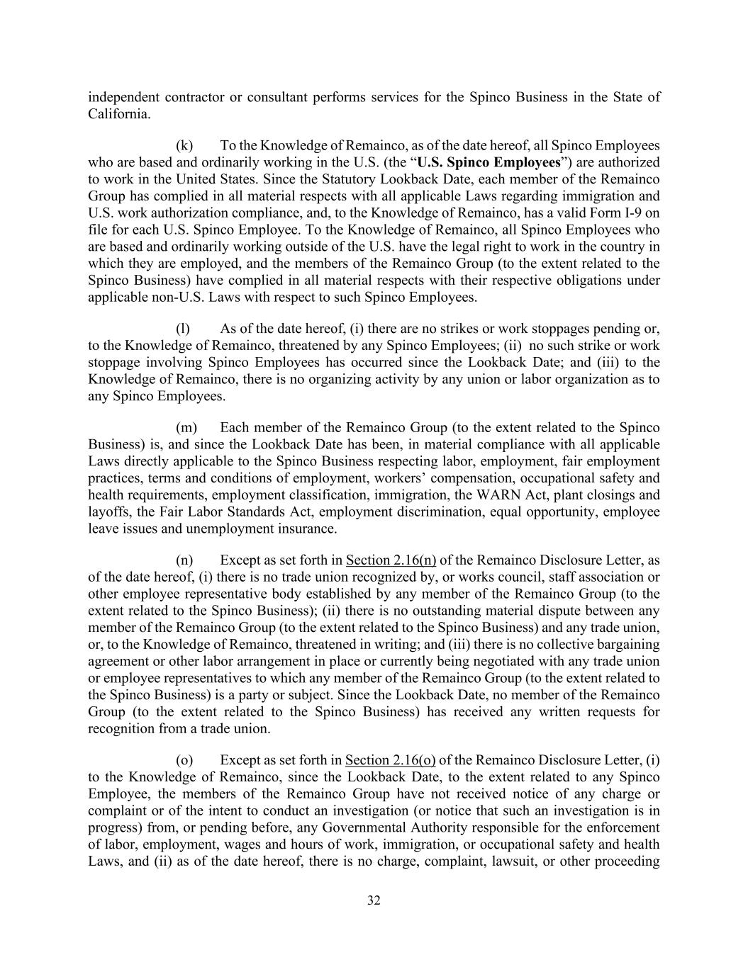 32 independent contractor or consultant performs services for the Spinco Business in the State of California. (k) To the Knowledge of Remainco, as of the date hereof, all Spinco Employees who are based and ordinarily working in the U.S. (the “U.S. Spinco Employees”) are authorized to work in the United States. Since the Statutory Lookback Date, each member of the Remainco Group has complied in all material respects with all applicable Laws regarding immigration and U.S. work authorization compliance, and, to the Knowledge of Remainco, has a valid Form I-9 on file for each U.S. Spinco Employee. To the Knowledge of Remainco, all Spinco Employees who are based and ordinarily working outside of the U.S. have the legal right to work in the country in which they are employed, and the members of the Remainco Group (to the extent related to the Spinco Business) have complied in all material respects with their respective obligations under applicable non-U.S. Laws with respect to such Spinco Employees. (l) As of the date hereof, (i) there are no strikes or work stoppages pending or, to the Knowledge of Remainco, threatened by any Spinco Employees; (ii) no such strike or work stoppage involving Spinco Employees has occurred since the Lookback Date; and (iii) to the Knowledge of Remainco, there is no organizing activity by any union or labor organization as to any Spinco Employees. (m) Each member of the Remainco Group (to the extent related to the Spinco Business) is, and since the Lookback Date has been, in material compliance with all applicable Laws directly applicable to the Spinco Business respecting labor, employment, fair employment practices, terms and conditions of employment, workers’ compensation, occupational safety and health requirements, employment classification, immigration, the WARN Act, plant closings and layoffs, the Fair Labor Standards Act, employment discrimination, equal opportunity, employee leave issues and unemployment insurance. (n) Except as set forth in Section 2.16(n) of the Remainco Disclosure Letter, as of the date hereof, (i) there is no trade union recognized by, or works council, staff association or other employee representative body established by any member of the Remainco Group (to the extent related to the Spinco Business); (ii) there is no outstanding material dispute between any member of the Remainco Group (to the extent related to the Spinco Business) and any trade union, or, to the Knowledge of Remainco, threatened in writing; and (iii) there is no collective bargaining agreement or other labor arrangement in place or currently being negotiated with any trade union or employee representatives to which any member of the Remainco Group (to the extent related to the Spinco Business) is a party or subject. Since the Lookback Date, no member of the Remainco Group (to the extent related to the Spinco Business) has received any written requests for recognition from a trade union. (o) Except as set forth in Section 2.16(o) of the Remainco Disclosure Letter, (i) to the Knowledge of Remainco, since the Lookback Date, to the extent related to any Spinco Employee, the members of the Remainco Group have not received notice of any charge or complaint or of the intent to conduct an investigation (or notice that such an investigation is in progress) from, or pending before, any Governmental Authority responsible for the enforcement of labor, employment, wages and hours of work, immigration, or occupational safety and health Laws, and (ii) as of the date hereof, there is no charge, complaint, lawsuit, or other proceeding