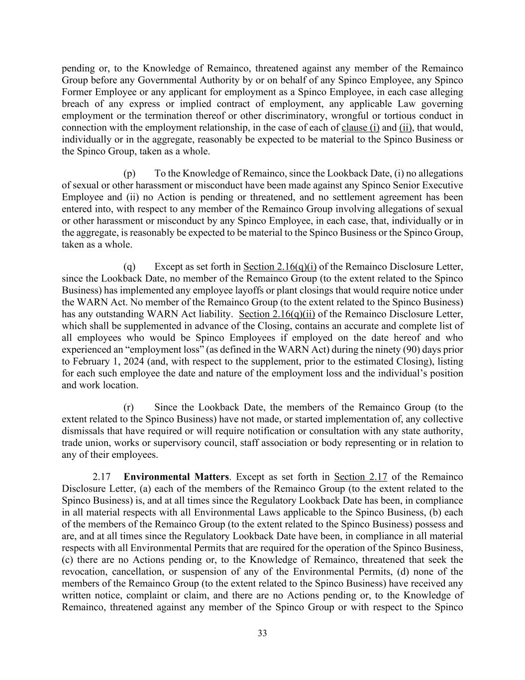 33 pending or, to the Knowledge of Remainco, threatened against any member of the Remainco Group before any Governmental Authority by or on behalf of any Spinco Employee, any Spinco Former Employee or any applicant for employment as a Spinco Employee, in each case alleging breach of any express or implied contract of employment, any applicable Law governing employment or the termination thereof or other discriminatory, wrongful or tortious conduct in connection with the employment relationship, in the case of each of clause (i) and (ii), that would, individually or in the aggregate, reasonably be expected to be material to the Spinco Business or the Spinco Group, taken as a whole. (p) To the Knowledge of Remainco, since the Lookback Date, (i) no allegations of sexual or other harassment or misconduct have been made against any Spinco Senior Executive Employee and (ii) no Action is pending or threatened, and no settlement agreement has been entered into, with respect to any member of the Remainco Group involving allegations of sexual or other harassment or misconduct by any Spinco Employee, in each case, that, individually or in the aggregate, is reasonably be expected to be material to the Spinco Business or the Spinco Group, taken as a whole. (q) Except as set forth in Section 2.16(q)(i) of the Remainco Disclosure Letter, since the Lookback Date, no member of the Remainco Group (to the extent related to the Spinco Business) has implemented any employee layoffs or plant closings that would require notice under the WARN Act. No member of the Remainco Group (to the extent related to the Spinco Business) has any outstanding WARN Act liability. Section 2.16(q)(ii) of the Remainco Disclosure Letter, which shall be supplemented in advance of the Closing, contains an accurate and complete list of all employees who would be Spinco Employees if employed on the date hereof and who experienced an “employment loss” (as defined in the WARN Act) during the ninety (90) days prior to February 1, 2024 (and, with respect to the supplement, prior to the estimated Closing), listing for each such employee the date and nature of the employment loss and the individual’s position and work location. (r) Since the Lookback Date, the members of the Remainco Group (to the extent related to the Spinco Business) have not made, or started implementation of, any collective dismissals that have required or will require notification or consultation with any state authority, trade union, works or supervisory council, staff association or body representing or in relation to any of their employees. 2.17 Environmental Matters. Except as set forth in Section 2.17 of the Remainco Disclosure Letter, (a) each of the members of the Remainco Group (to the extent related to the Spinco Business) is, and at all times since the Regulatory Lookback Date has been, in compliance in all material respects with all Environmental Laws applicable to the Spinco Business, (b) each of the members of the Remainco Group (to the extent related to the Spinco Business) possess and are, and at all times since the Regulatory Lookback Date have been, in compliance in all material respects with all Environmental Permits that are required for the operation of the Spinco Business, (c) there are no Actions pending or, to the Knowledge of Remainco, threatened that seek the revocation, cancellation, or suspension of any of the Environmental Permits, (d) none of the members of the Remainco Group (to the extent related to the Spinco Business) have received any written notice, complaint or claim, and there are no Actions pending or, to the Knowledge of Remainco, threatened against any member of the Spinco Group or with respect to the Spinco