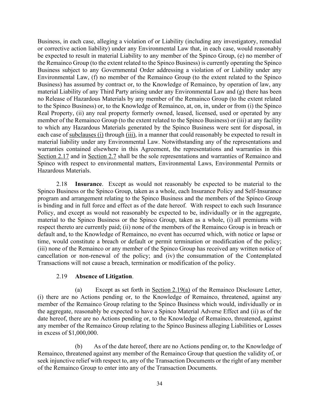 34 Business, in each case, alleging a violation of or Liability (including any investigatory, remedial or corrective action liability) under any Environmental Law that, in each case, would reasonably be expected to result in material Liability to any member of the Spinco Group, (e) no member of the Remainco Group (to the extent related to the Spinco Business) is currently operating the Spinco Business subject to any Governmental Order addressing a violation of or Liability under any Environmental Law, (f) no member of the Remainco Group (to the extent related to the Spinco Business) has assumed by contract or, to the Knowledge of Remainco, by operation of law, any material Liability of any Third Party arising under any Environmental Law and (g) there has been no Release of Hazardous Materials by any member of the Remainco Group (to the extent related to the Spinco Business) or, to the Knowledge of Remainco, at, on, in, under or from (i) the Spinco Real Property, (ii) any real property formerly owned, leased, licensed, used or operated by any member of the Remainco Group (to the extent related to the Spinco Business) or (iii) at any facility to which any Hazardous Materials generated by the Spinco Business were sent for disposal, in each case of subclauses (i) through (iii), in a manner that could reasonably be expected to result in material liability under any Environmental Law. Notwithstanding any of the representations and warranties contained elsewhere in this Agreement, the representations and warranties in this Section 2.17 and in Section 2.7 shall be the sole representations and warranties of Remainco and Spinco with respect to environmental matters, Environmental Laws, Environmental Permits or Hazardous Materials. 2.18 Insurance. Except as would not reasonably be expected to be material to the Spinco Business or the Spinco Group, taken as a whole, each Insurance Policy and Self-Insurance program and arrangement relating to the Spinco Business and the members of the Spinco Group is binding and in full force and effect as of the date hereof. With respect to each such Insurance Policy, and except as would not reasonably be expected to be, individually or in the aggregate, material to the Spinco Business or the Spinco Group, taken as a whole, (i) all premiums with respect thereto are currently paid; (ii) none of the members of the Remainco Group is in breach or default and, to the Knowledge of Remainco, no event has occurred which, with notice or lapse or time, would constitute a breach or default or permit termination or modification of the policy; (iii) none of the Remainco or any member of the Spinco Group has received any written notice of cancellation or non-renewal of the policy; and (iv) the consummation of the Contemplated Transactions will not cause a breach, termination or modification of the policy. 2.19 Absence of Litigation. (a) Except as set forth in Section 2.19(a) of the Remainco Disclosure Letter, (i) there are no Actions pending or, to the Knowledge of Remainco, threatened, against any member of the Remainco Group relating to the Spinco Business which would, individually or in the aggregate, reasonably be expected to have a Spinco Material Adverse Effect and (ii) as of the date hereof, there are no Actions pending or, to the Knowledge of Remainco, threatened, against any member of the Remainco Group relating to the Spinco Business alleging Liabilities or Losses in excess of $1,000,000. (b) As of the date hereof, there are no Actions pending or, to the Knowledge of Remainco, threatened against any member of the Remainco Group that question the validity of, or seek injunctive relief with respect to, any of the Transaction Documents or the right of any member of the Remainco Group to enter into any of the Transaction Documents.