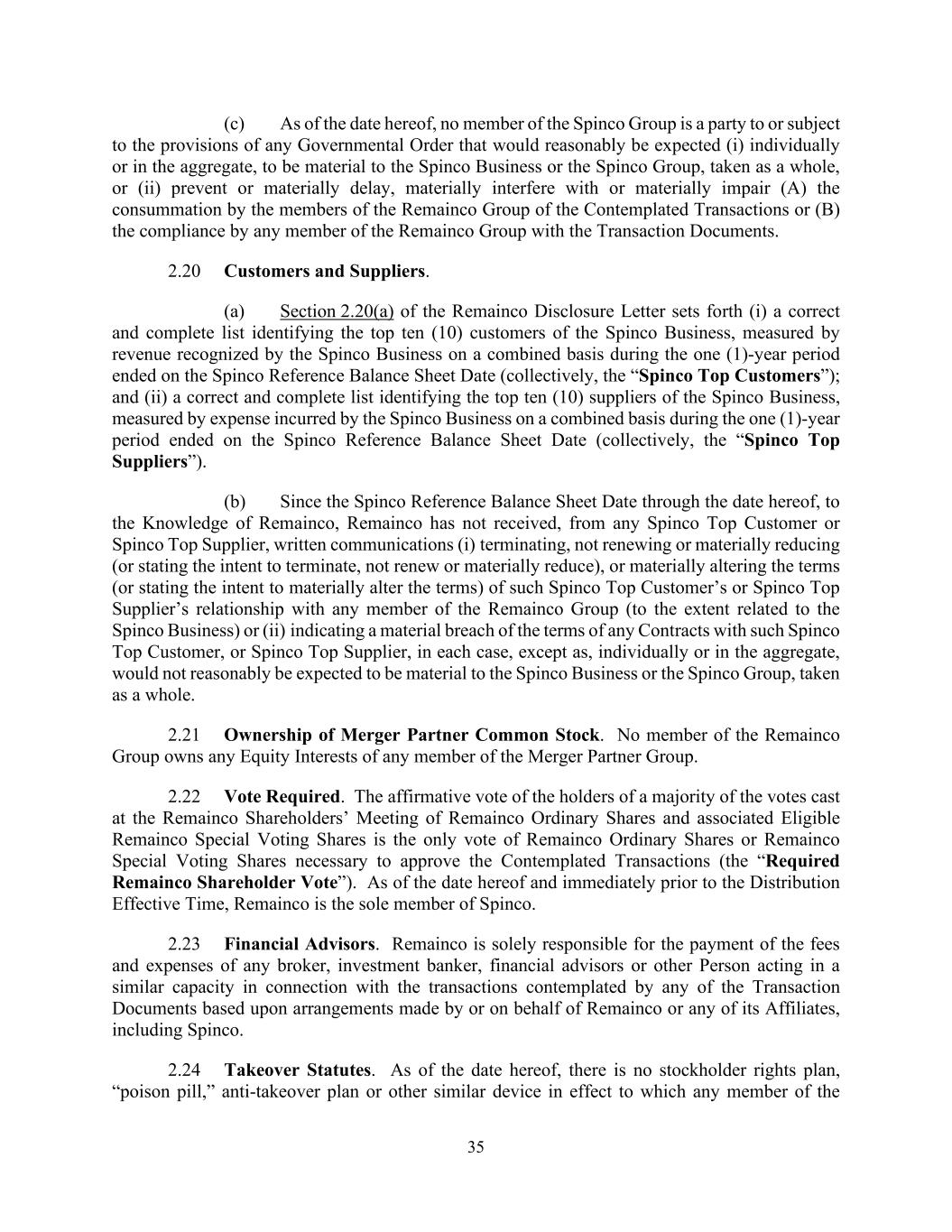 35 (c) As of the date hereof, no member of the Spinco Group is a party to or subject to the provisions of any Governmental Order that would reasonably be expected (i) individually or in the aggregate, to be material to the Spinco Business or the Spinco Group, taken as a whole, or (ii) prevent or materially delay, materially interfere with or materially impair (A) the consummation by the members of the Remainco Group of the Contemplated Transactions or (B) the compliance by any member of the Remainco Group with the Transaction Documents. 2.20 Customers and Suppliers. (a) Section 2.20(a) of the Remainco Disclosure Letter sets forth (i) a correct and complete list identifying the top ten (10) customers of the Spinco Business, measured by revenue recognized by the Spinco Business on a combined basis during the one (1)-year period ended on the Spinco Reference Balance Sheet Date (collectively, the “Spinco Top Customers”); and (ii) a correct and complete list identifying the top ten (10) suppliers of the Spinco Business, measured by expense incurred by the Spinco Business on a combined basis during the one (1)-year period ended on the Spinco Reference Balance Sheet Date (collectively, the “Spinco Top Suppliers”). (b) Since the Spinco Reference Balance Sheet Date through the date hereof, to the Knowledge of Remainco, Remainco has not received, from any Spinco Top Customer or Spinco Top Supplier, written communications (i) terminating, not renewing or materially reducing (or stating the intent to terminate, not renew or materially reduce), or materially altering the terms (or stating the intent to materially alter the terms) of such Spinco Top Customer’s or Spinco Top Supplier’s relationship with any member of the Remainco Group (to the extent related to the Spinco Business) or (ii) indicating a material breach of the terms of any Contracts with such Spinco Top Customer, or Spinco Top Supplier, in each case, except as, individually or in the aggregate, would not reasonably be expected to be material to the Spinco Business or the Spinco Group, taken as a whole. 2.21 Ownership of Merger Partner Common Stock. No member of the Remainco Group owns any Equity Interests of any member of the Merger Partner Group. 2.22 Vote Required. The affirmative vote of the holders of a majority of the votes cast at the Remainco Shareholders’ Meeting of Remainco Ordinary Shares and associated Eligible Remainco Special Voting Shares is the only vote of Remainco Ordinary Shares or Remainco Special Voting Shares necessary to approve the Contemplated Transactions (the “Required Remainco Shareholder Vote”). As of the date hereof and immediately prior to the Distribution Effective Time, Remainco is the sole member of Spinco. 2.23 Financial Advisors. Remainco is solely responsible for the payment of the fees and expenses of any broker, investment banker, financial advisors or other Person acting in a similar capacity in connection with the transactions contemplated by any of the Transaction Documents based upon arrangements made by or on behalf of Remainco or any of its Affiliates, including Spinco. 2.24 Takeover Statutes. As of the date hereof, there is no stockholder rights plan, “poison pill,” anti-takeover plan or other similar device in effect to which any member of the