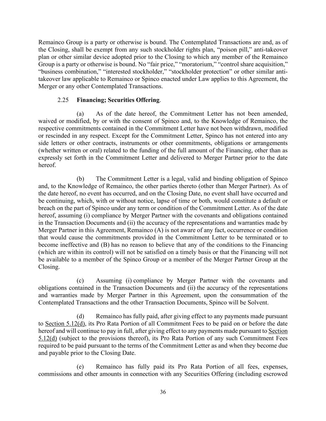 36 Remainco Group is a party or otherwise is bound. The Contemplated Transactions are and, as of the Closing, shall be exempt from any such stockholder rights plan, “poison pill,” anti-takeover plan or other similar device adopted prior to the Closing to which any member of the Remainco Group is a party or otherwise is bound. No “fair price,” “moratorium,” “control share acquisition,” “business combination,” “interested stockholder,” “stockholder protection” or other similar anti- takeover law applicable to Remainco or Spinco enacted under Law applies to this Agreement, the Merger or any other Contemplated Transactions. 2.25 Financing; Securities Offering. (a) As of the date hereof, the Commitment Letter has not been amended, waived or modified, by or with the consent of Spinco and, to the Knowledge of Remainco, the respective commitments contained in the Commitment Letter have not been withdrawn, modified or rescinded in any respect. Except for the Commitment Letter, Spinco has not entered into any side letters or other contracts, instruments or other commitments, obligations or arrangements (whether written or oral) related to the funding of the full amount of the Financing, other than as expressly set forth in the Commitment Letter and delivered to Merger Partner prior to the date hereof. (b) The Commitment Letter is a legal, valid and binding obligation of Spinco and, to the Knowledge of Remainco, the other parties thereto (other than Merger Partner). As of the date hereof, no event has occurred, and on the Closing Date, no event shall have occurred and be continuing, which, with or without notice, lapse of time or both, would constitute a default or breach on the part of Spinco under any term or condition of the Commitment Letter. As of the date hereof, assuming (i) compliance by Merger Partner with the covenants and obligations contained in the Transaction Documents and (ii) the accuracy of the representations and warranties made by Merger Partner in this Agreement, Remainco (A) is not aware of any fact, occurrence or condition that would cause the commitments provided in the Commitment Letter to be terminated or to become ineffective and (B) has no reason to believe that any of the conditions to the Financing (which are within its control) will not be satisfied on a timely basis or that the Financing will not be available to a member of the Spinco Group or a member of the Merger Partner Group at the Closing. (c) Assuming (i) compliance by Merger Partner with the covenants and obligations contained in the Transaction Documents and (ii) the accuracy of the representations and warranties made by Merger Partner in this Agreement, upon the consummation of the Contemplated Transactions and the other Transaction Documents, Spinco will be Solvent. (d) Remainco has fully paid, after giving effect to any payments made pursuant to Section 5.12(d), its Pro Rata Portion of all Commitment Fees to be paid on or before the date hereof and will continue to pay in full, after giving effect to any payments made pursuant to Section 5.12(d) (subject to the provisions thereof), its Pro Rata Portion of any such Commitment Fees required to be paid pursuant to the terms of the Commitment Letter as and when they become due and payable prior to the Closing Date. (e) Remainco has fully paid its Pro Rata Portion of all fees, expenses, commissions and other amounts in connection with any Securities Offering (including escrowed