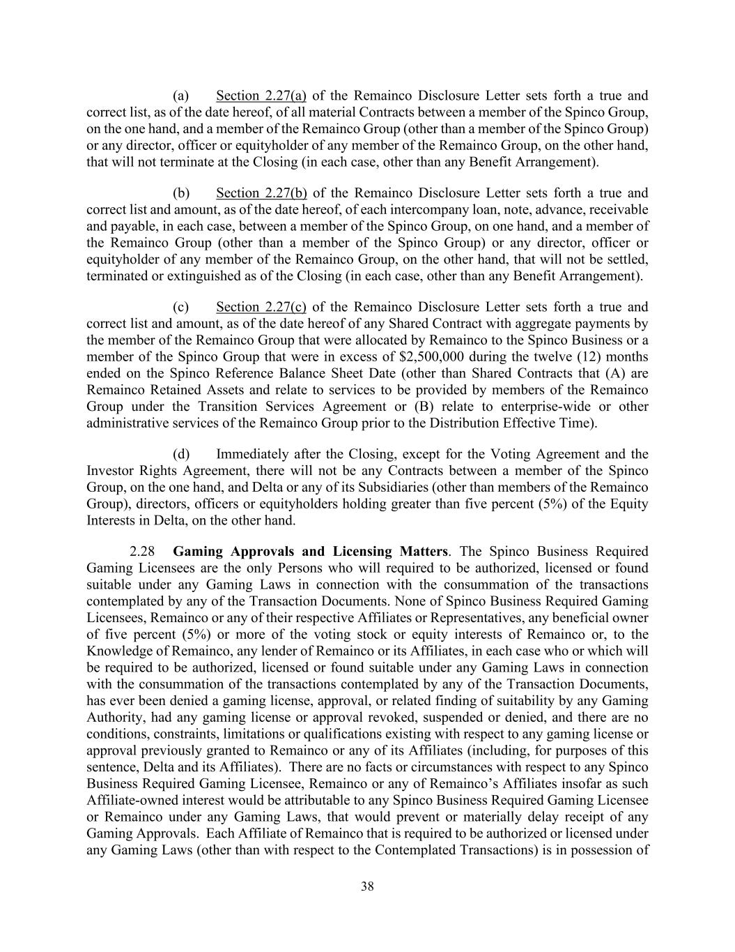38 (a) Section 2.27(a) of the Remainco Disclosure Letter sets forth a true and correct list, as of the date hereof, of all material Contracts between a member of the Spinco Group, on the one hand, and a member of the Remainco Group (other than a member of the Spinco Group) or any director, officer or equityholder of any member of the Remainco Group, on the other hand, that will not terminate at the Closing (in each case, other than any Benefit Arrangement). (b) Section 2.27(b) of the Remainco Disclosure Letter sets forth a true and correct list and amount, as of the date hereof, of each intercompany loan, note, advance, receivable and payable, in each case, between a member of the Spinco Group, on one hand, and a member of the Remainco Group (other than a member of the Spinco Group) or any director, officer or equityholder of any member of the Remainco Group, on the other hand, that will not be settled, terminated or extinguished as of the Closing (in each case, other than any Benefit Arrangement). (c) Section 2.27(c) of the Remainco Disclosure Letter sets forth a true and correct list and amount, as of the date hereof of any Shared Contract with aggregate payments by the member of the Remainco Group that were allocated by Remainco to the Spinco Business or a member of the Spinco Group that were in excess of $2,500,000 during the twelve (12) months ended on the Spinco Reference Balance Sheet Date (other than Shared Contracts that (A) are Remainco Retained Assets and relate to services to be provided by members of the Remainco Group under the Transition Services Agreement or (B) relate to enterprise-wide or other administrative services of the Remainco Group prior to the Distribution Effective Time). (d) Immediately after the Closing, except for the Voting Agreement and the Investor Rights Agreement, there will not be any Contracts between a member of the Spinco Group, on the one hand, and Delta or any of its Subsidiaries (other than members of the Remainco Group), directors, officers or equityholders holding greater than five percent (5%) of the Equity Interests in Delta, on the other hand. 2.28 Gaming Approvals and Licensing Matters. The Spinco Business Required Gaming Licensees are the only Persons who will required to be authorized, licensed or found suitable under any Gaming Laws in connection with the consummation of the transactions contemplated by any of the Transaction Documents. None of Spinco Business Required Gaming Licensees, Remainco or any of their respective Affiliates or Representatives, any beneficial owner of five percent (5%) or more of the voting stock or equity interests of Remainco or, to the Knowledge of Remainco, any lender of Remainco or its Affiliates, in each case who or which will be required to be authorized, licensed or found suitable under any Gaming Laws in connection with the consummation of the transactions contemplated by any of the Transaction Documents, has ever been denied a gaming license, approval, or related finding of suitability by any Gaming Authority, had any gaming license or approval revoked, suspended or denied, and there are no conditions, constraints, limitations or qualifications existing with respect to any gaming license or approval previously granted to Remainco or any of its Affiliates (including, for purposes of this sentence, Delta and its Affiliates). There are no facts or circumstances with respect to any Spinco Business Required Gaming Licensee, Remainco or any of Remainco’s Affiliates insofar as such Affiliate-owned interest would be attributable to any Spinco Business Required Gaming Licensee or Remainco under any Gaming Laws, that would prevent or materially delay receipt of any Gaming Approvals. Each Affiliate of Remainco that is required to be authorized or licensed under any Gaming Laws (other than with respect to the Contemplated Transactions) is in possession of