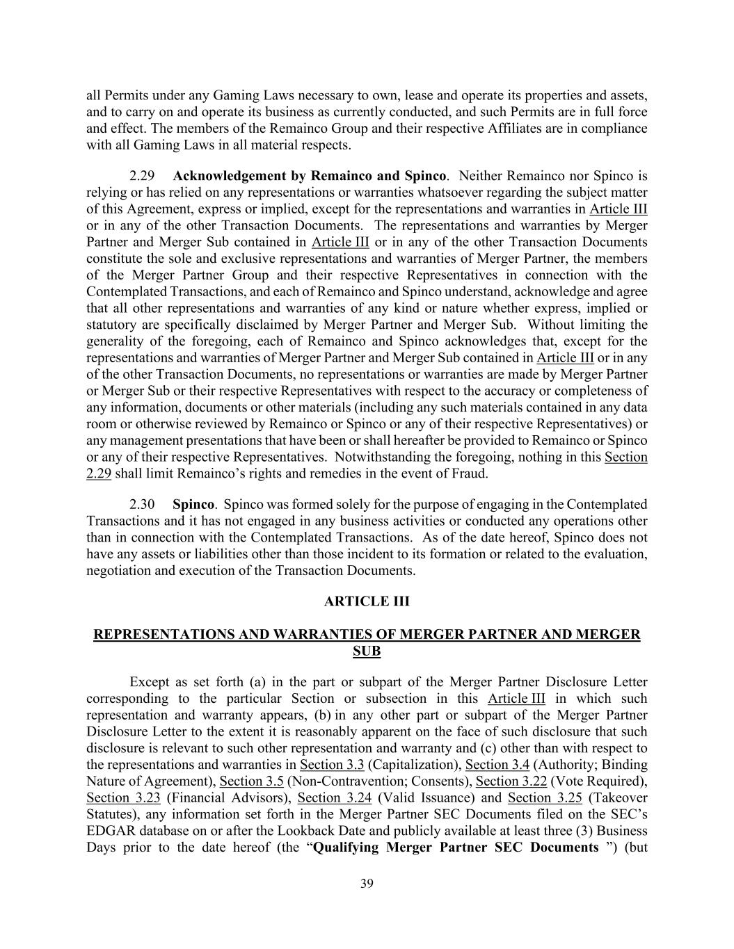 39 all Permits under any Gaming Laws necessary to own, lease and operate its properties and assets, and to carry on and operate its business as currently conducted, and such Permits are in full force and effect. The members of the Remainco Group and their respective Affiliates are in compliance with all Gaming Laws in all material respects. 2.29 Acknowledgement by Remainco and Spinco. Neither Remainco nor Spinco is relying or has relied on any representations or warranties whatsoever regarding the subject matter of this Agreement, express or implied, except for the representations and warranties in Article III or in any of the other Transaction Documents. The representations and warranties by Merger Partner and Merger Sub contained in Article III or in any of the other Transaction Documents constitute the sole and exclusive representations and warranties of Merger Partner, the members of the Merger Partner Group and their respective Representatives in connection with the Contemplated Transactions, and each of Remainco and Spinco understand, acknowledge and agree that all other representations and warranties of any kind or nature whether express, implied or statutory are specifically disclaimed by Merger Partner and Merger Sub. Without limiting the generality of the foregoing, each of Remainco and Spinco acknowledges that, except for the representations and warranties of Merger Partner and Merger Sub contained in Article III or in any of the other Transaction Documents, no representations or warranties are made by Merger Partner or Merger Sub or their respective Representatives with respect to the accuracy or completeness of any information, documents or other materials (including any such materials contained in any data room or otherwise reviewed by Remainco or Spinco or any of their respective Representatives) or any management presentations that have been or shall hereafter be provided to Remainco or Spinco or any of their respective Representatives. Notwithstanding the foregoing, nothing in this Section 2.29 shall limit Remainco’s rights and remedies in the event of Fraud. 2.30 Spinco. Spinco was formed solely for the purpose of engaging in the Contemplated Transactions and it has not engaged in any business activities or conducted any operations other than in connection with the Contemplated Transactions. As of the date hereof, Spinco does not have any assets or liabilities other than those incident to its formation or related to the evaluation, negotiation and execution of the Transaction Documents. ARTICLE III REPRESENTATIONS AND WARRANTIES OF MERGER PARTNER AND MERGER SUB Except as set forth (a) in the part or subpart of the Merger Partner Disclosure Letter corresponding to the particular Section or subsection in this Article III in which such representation and warranty appears, (b) in any other part or subpart of the Merger Partner Disclosure Letter to the extent it is reasonably apparent on the face of such disclosure that such disclosure is relevant to such other representation and warranty and (c) other than with respect to the representations and warranties in Section 3.3 (Capitalization), Section 3.4 (Authority; Binding Nature of Agreement), Section 3.5 (Non-Contravention; Consents), Section 3.22 (Vote Required), Section 3.23 (Financial Advisors), Section 3.24 (Valid Issuance) and Section 3.25 (Takeover Statutes), any information set forth in the Merger Partner SEC Documents filed on the SEC’s EDGAR database on or after the Lookback Date and publicly available at least three (3) Business Days prior to the date hereof (the “Qualifying Merger Partner SEC Documents ”) (but