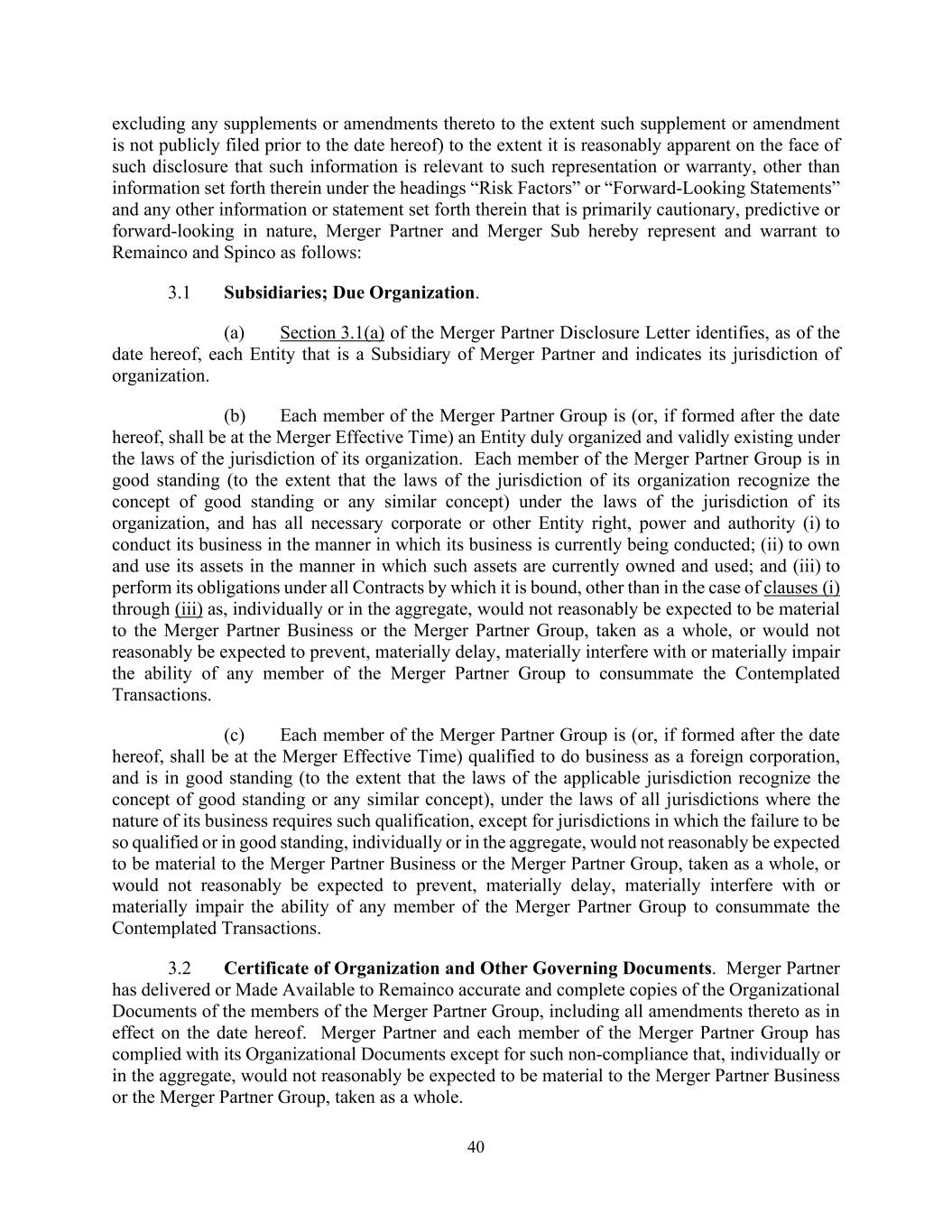 40 excluding any supplements or amendments thereto to the extent such supplement or amendment is not publicly filed prior to the date hereof) to the extent it is reasonably apparent on the face of such disclosure that such information is relevant to such representation or warranty, other than information set forth therein under the headings “Risk Factors” or “Forward-Looking Statements” and any other information or statement set forth therein that is primarily cautionary, predictive or forward-looking in nature, Merger Partner and Merger Sub hereby represent and warrant to Remainco and Spinco as follows: 3.1 Subsidiaries; Due Organization. (a) Section 3.1(a) of the Merger Partner Disclosure Letter identifies, as of the date hereof, each Entity that is a Subsidiary of Merger Partner and indicates its jurisdiction of organization. (b) Each member of the Merger Partner Group is (or, if formed after the date hereof, shall be at the Merger Effective Time) an Entity duly organized and validly existing under the laws of the jurisdiction of its organization. Each member of the Merger Partner Group is in good standing (to the extent that the laws of the jurisdiction of its organization recognize the concept of good standing or any similar concept) under the laws of the jurisdiction of its organization, and has all necessary corporate or other Entity right, power and authority (i) to conduct its business in the manner in which its business is currently being conducted; (ii) to own and use its assets in the manner in which such assets are currently owned and used; and (iii) to perform its obligations under all Contracts by which it is bound, other than in the case of clauses (i) through (iii) as, individually or in the aggregate, would not reasonably be expected to be material to the Merger Partner Business or the Merger Partner Group, taken as a whole, or would not reasonably be expected to prevent, materially delay, materially interfere with or materially impair the ability of any member of the Merger Partner Group to consummate the Contemplated Transactions. (c) Each member of the Merger Partner Group is (or, if formed after the date hereof, shall be at the Merger Effective Time) qualified to do business as a foreign corporation, and is in good standing (to the extent that the laws of the applicable jurisdiction recognize the concept of good standing or any similar concept), under the laws of all jurisdictions where the nature of its business requires such qualification, except for jurisdictions in which the failure to be so qualified or in good standing, individually or in the aggregate, would not reasonably be expected to be material to the Merger Partner Business or the Merger Partner Group, taken as a whole, or would not reasonably be expected to prevent, materially delay, materially interfere with or materially impair the ability of any member of the Merger Partner Group to consummate the Contemplated Transactions. 3.2 Certificate of Organization and Other Governing Documents. Merger Partner has delivered or Made Available to Remainco accurate and complete copies of the Organizational Documents of the members of the Merger Partner Group, including all amendments thereto as in effect on the date hereof. Merger Partner and each member of the Merger Partner Group has complied with its Organizational Documents except for such non-compliance that, individually or in the aggregate, would not reasonably be expected to be material to the Merger Partner Business or the Merger Partner Group, taken as a whole.