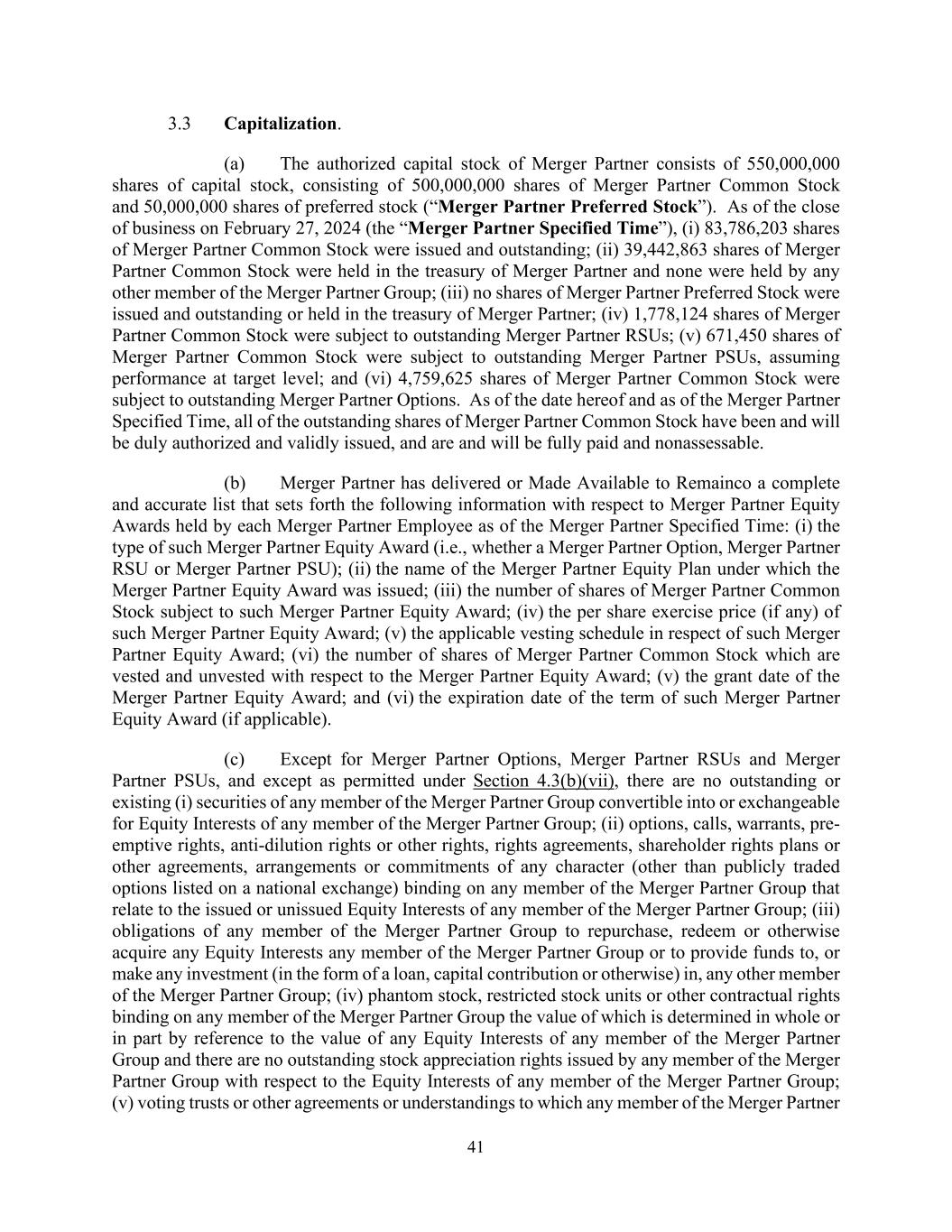 41 3.3 Capitalization. (a) The authorized capital stock of Merger Partner consists of 550,000,000 shares of capital stock, consisting of 500,000,000 shares of Merger Partner Common Stock and 50,000,000 shares of preferred stock (“Merger Partner Preferred Stock”). As of the close of business on February 27, 2024 (the “Merger Partner Specified Time”), (i) 83,786,203 shares of Merger Partner Common Stock were issued and outstanding; (ii) 39,442,863 shares of Merger Partner Common Stock were held in the treasury of Merger Partner and none were held by any other member of the Merger Partner Group; (iii) no shares of Merger Partner Preferred Stock were issued and outstanding or held in the treasury of Merger Partner; (iv) 1,778,124 shares of Merger Partner Common Stock were subject to outstanding Merger Partner RSUs; (v) 671,450 shares of Merger Partner Common Stock were subject to outstanding Merger Partner PSUs, assuming performance at target level; and (vi) 4,759,625 shares of Merger Partner Common Stock were subject to outstanding Merger Partner Options. As of the date hereof and as of the Merger Partner Specified Time, all of the outstanding shares of Merger Partner Common Stock have been and will be duly authorized and validly issued, and are and will be fully paid and nonassessable. (b) Merger Partner has delivered or Made Available to Remainco a complete and accurate list that sets forth the following information with respect to Merger Partner Equity Awards held by each Merger Partner Employee as of the Merger Partner Specified Time: (i) the type of such Merger Partner Equity Award (i.e., whether a Merger Partner Option, Merger Partner RSU or Merger Partner PSU); (ii) the name of the Merger Partner Equity Plan under which the Merger Partner Equity Award was issued; (iii) the number of shares of Merger Partner Common Stock subject to such Merger Partner Equity Award; (iv) the per share exercise price (if any) of such Merger Partner Equity Award; (v) the applicable vesting schedule in respect of such Merger Partner Equity Award; (vi) the number of shares of Merger Partner Common Stock which are vested and unvested with respect to the Merger Partner Equity Award; (v) the grant date of the Merger Partner Equity Award; and (vi) the expiration date of the term of such Merger Partner Equity Award (if applicable). (c) Except for Merger Partner Options, Merger Partner RSUs and Merger Partner PSUs, and except as permitted under Section 4.3(b)(vii), there are no outstanding or existing (i) securities of any member of the Merger Partner Group convertible into or exchangeable for Equity Interests of any member of the Merger Partner Group; (ii) options, calls, warrants, pre- emptive rights, anti-dilution rights or other rights, rights agreements, shareholder rights plans or other agreements, arrangements or commitments of any character (other than publicly traded options listed on a national exchange) binding on any member of the Merger Partner Group that relate to the issued or unissued Equity Interests of any member of the Merger Partner Group; (iii) obligations of any member of the Merger Partner Group to repurchase, redeem or otherwise acquire any Equity Interests any member of the Merger Partner Group or to provide funds to, or make any investment (in the form of a loan, capital contribution or otherwise) in, any other member of the Merger Partner Group; (iv) phantom stock, restricted stock units or other contractual rights binding on any member of the Merger Partner Group the value of which is determined in whole or in part by reference to the value of any Equity Interests of any member of the Merger Partner Group and there are no outstanding stock appreciation rights issued by any member of the Merger Partner Group with respect to the Equity Interests of any member of the Merger Partner Group; (v) voting trusts or other agreements or understandings to which any member of the Merger Partner