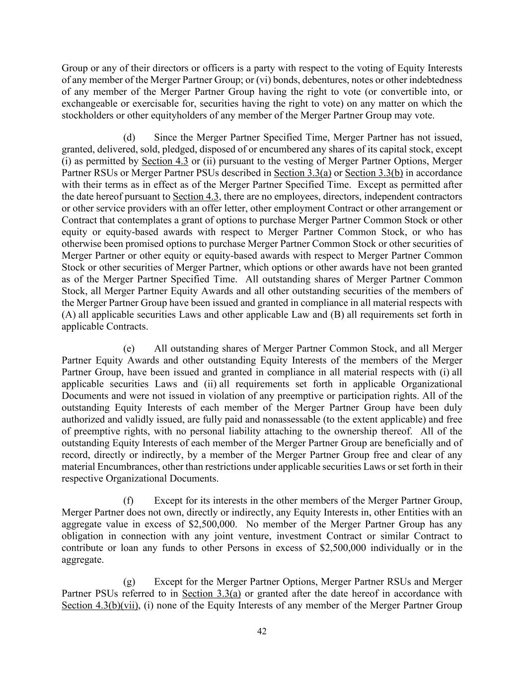 42 Group or any of their directors or officers is a party with respect to the voting of Equity Interests of any member of the Merger Partner Group; or (vi) bonds, debentures, notes or other indebtedness of any member of the Merger Partner Group having the right to vote (or convertible into, or exchangeable or exercisable for, securities having the right to vote) on any matter on which the stockholders or other equityholders of any member of the Merger Partner Group may vote. (d) Since the Merger Partner Specified Time, Merger Partner has not issued, granted, delivered, sold, pledged, disposed of or encumbered any shares of its capital stock, except (i) as permitted by Section 4.3 or (ii) pursuant to the vesting of Merger Partner Options, Merger Partner RSUs or Merger Partner PSUs described in Section 3.3(a) or Section 3.3(b) in accordance with their terms as in effect as of the Merger Partner Specified Time. Except as permitted after the date hereof pursuant to Section 4.3, there are no employees, directors, independent contractors or other service providers with an offer letter, other employment Contract or other arrangement or Contract that contemplates a grant of options to purchase Merger Partner Common Stock or other equity or equity-based awards with respect to Merger Partner Common Stock, or who has otherwise been promised options to purchase Merger Partner Common Stock or other securities of Merger Partner or other equity or equity-based awards with respect to Merger Partner Common Stock or other securities of Merger Partner, which options or other awards have not been granted as of the Merger Partner Specified Time. All outstanding shares of Merger Partner Common Stock, all Merger Partner Equity Awards and all other outstanding securities of the members of the Merger Partner Group have been issued and granted in compliance in all material respects with (A) all applicable securities Laws and other applicable Law and (B) all requirements set forth in applicable Contracts. (e) All outstanding shares of Merger Partner Common Stock, and all Merger Partner Equity Awards and other outstanding Equity Interests of the members of the Merger Partner Group, have been issued and granted in compliance in all material respects with (i) all applicable securities Laws and (ii) all requirements set forth in applicable Organizational Documents and were not issued in violation of any preemptive or participation rights. All of the outstanding Equity Interests of each member of the Merger Partner Group have been duly authorized and validly issued, are fully paid and nonassessable (to the extent applicable) and free of preemptive rights, with no personal liability attaching to the ownership thereof. All of the outstanding Equity Interests of each member of the Merger Partner Group are beneficially and of record, directly or indirectly, by a member of the Merger Partner Group free and clear of any material Encumbrances, other than restrictions under applicable securities Laws or set forth in their respective Organizational Documents. (f) Except for its interests in the other members of the Merger Partner Group, Merger Partner does not own, directly or indirectly, any Equity Interests in, other Entities with an aggregate value in excess of $2,500,000. No member of the Merger Partner Group has any obligation in connection with any joint venture, investment Contract or similar Contract to contribute or loan any funds to other Persons in excess of $2,500,000 individually or in the aggregate. (g) Except for the Merger Partner Options, Merger Partner RSUs and Merger Partner PSUs referred to in Section 3.3(a) or granted after the date hereof in accordance with Section 4.3(b)(vii), (i) none of the Equity Interests of any member of the Merger Partner Group