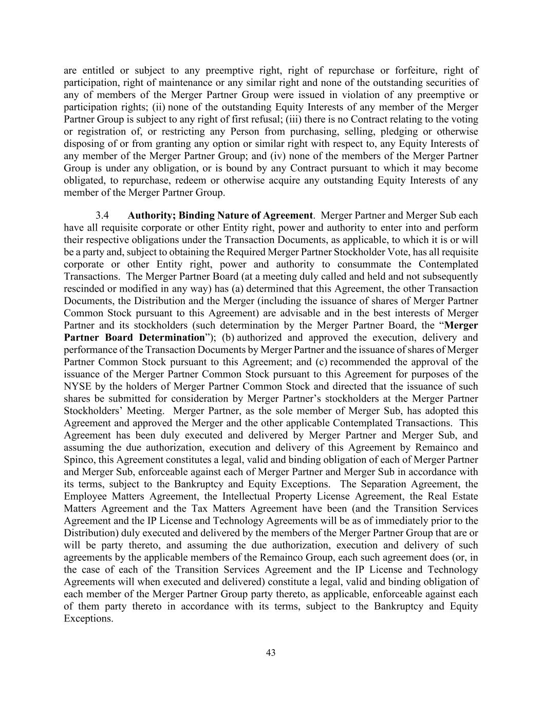 43 are entitled or subject to any preemptive right, right of repurchase or forfeiture, right of participation, right of maintenance or any similar right and none of the outstanding securities of any of members of the Merger Partner Group were issued in violation of any preemptive or participation rights; (ii) none of the outstanding Equity Interests of any member of the Merger Partner Group is subject to any right of first refusal; (iii) there is no Contract relating to the voting or registration of, or restricting any Person from purchasing, selling, pledging or otherwise disposing of or from granting any option or similar right with respect to, any Equity Interests of any member of the Merger Partner Group; and (iv) none of the members of the Merger Partner Group is under any obligation, or is bound by any Contract pursuant to which it may become obligated, to repurchase, redeem or otherwise acquire any outstanding Equity Interests of any member of the Merger Partner Group. 3.4 Authority; Binding Nature of Agreement. Merger Partner and Merger Sub each have all requisite corporate or other Entity right, power and authority to enter into and perform their respective obligations under the Transaction Documents, as applicable, to which it is or will be a party and, subject to obtaining the Required Merger Partner Stockholder Vote, has all requisite corporate or other Entity right, power and authority to consummate the Contemplated Transactions. The Merger Partner Board (at a meeting duly called and held and not subsequently rescinded or modified in any way) has (a) determined that this Agreement, the other Transaction Documents, the Distribution and the Merger (including the issuance of shares of Merger Partner Common Stock pursuant to this Agreement) are advisable and in the best interests of Merger Partner and its stockholders (such determination by the Merger Partner Board, the “Merger Partner Board Determination”); (b) authorized and approved the execution, delivery and performance of the Transaction Documents by Merger Partner and the issuance of shares of Merger Partner Common Stock pursuant to this Agreement; and (c) recommended the approval of the issuance of the Merger Partner Common Stock pursuant to this Agreement for purposes of the NYSE by the holders of Merger Partner Common Stock and directed that the issuance of such shares be submitted for consideration by Merger Partner’s stockholders at the Merger Partner Stockholders’ Meeting. Merger Partner, as the sole member of Merger Sub, has adopted this Agreement and approved the Merger and the other applicable Contemplated Transactions. This Agreement has been duly executed and delivered by Merger Partner and Merger Sub, and assuming the due authorization, execution and delivery of this Agreement by Remainco and Spinco, this Agreement constitutes a legal, valid and binding obligation of each of Merger Partner and Merger Sub, enforceable against each of Merger Partner and Merger Sub in accordance with its terms, subject to the Bankruptcy and Equity Exceptions. The Separation Agreement, the Employee Matters Agreement, the Intellectual Property License Agreement, the Real Estate Matters Agreement and the Tax Matters Agreement have been (and the Transition Services Agreement and the IP License and Technology Agreements will be as of immediately prior to the Distribution) duly executed and delivered by the members of the Merger Partner Group that are or will be party thereto, and assuming the due authorization, execution and delivery of such agreements by the applicable members of the Remainco Group, each such agreement does (or, in the case of each of the Transition Services Agreement and the IP License and Technology Agreements will when executed and delivered) constitute a legal, valid and binding obligation of each member of the Merger Partner Group party thereto, as applicable, enforceable against each of them party thereto in accordance with its terms, subject to the Bankruptcy and Equity Exceptions.