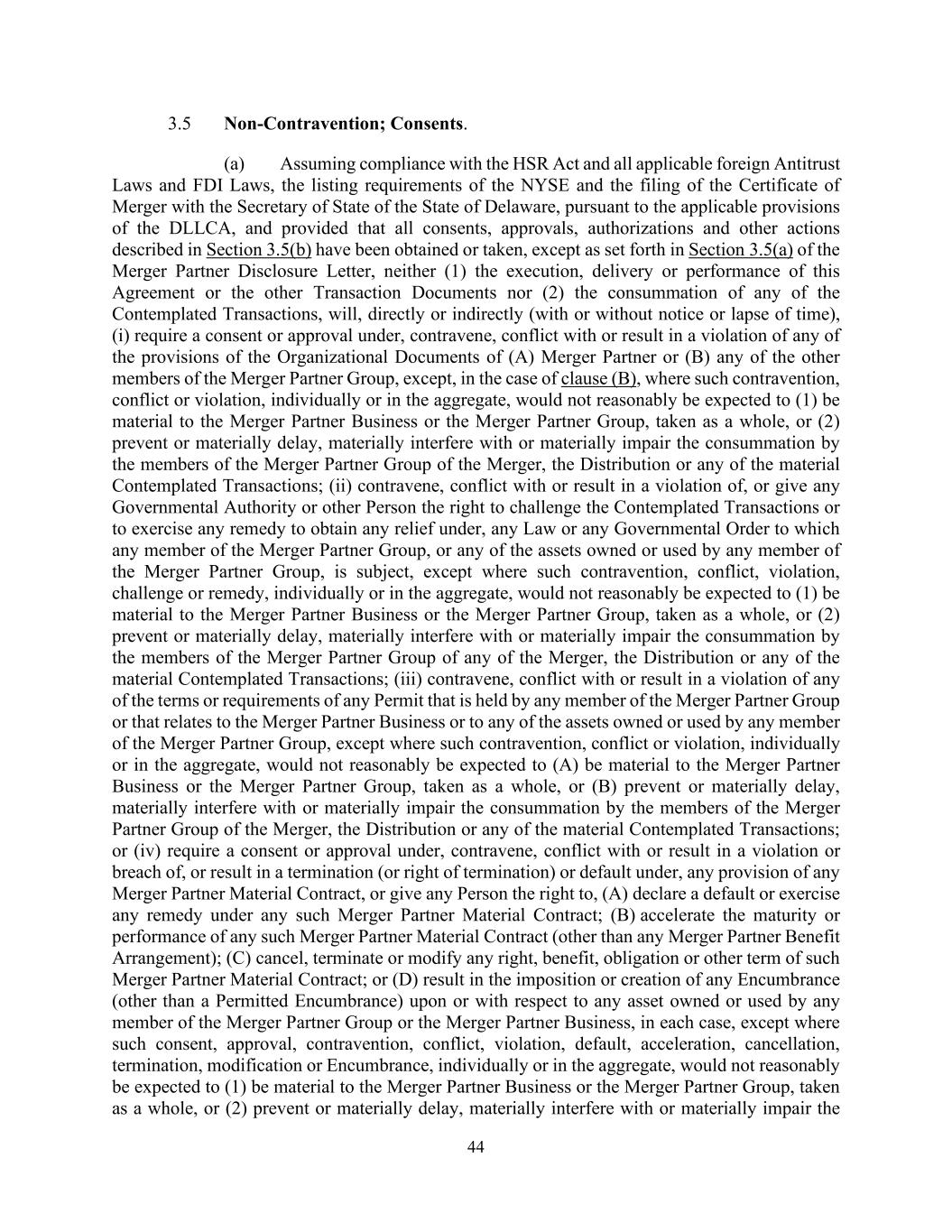 44 3.5 Non-Contravention; Consents. (a) Assuming compliance with the HSR Act and all applicable foreign Antitrust Laws and FDI Laws, the listing requirements of the NYSE and the filing of the Certificate of Merger with the Secretary of State of the State of Delaware, pursuant to the applicable provisions of the DLLCA, and provided that all consents, approvals, authorizations and other actions described in Section 3.5(b) have been obtained or taken, except as set forth in Section 3.5(a) of the Merger Partner Disclosure Letter, neither (1) the execution, delivery or performance of this Agreement or the other Transaction Documents nor (2) the consummation of any of the Contemplated Transactions, will, directly or indirectly (with or without notice or lapse of time), (i) require a consent or approval under, contravene, conflict with or result in a violation of any of the provisions of the Organizational Documents of (A) Merger Partner or (B) any of the other members of the Merger Partner Group, except, in the case of clause (B), where such contravention, conflict or violation, individually or in the aggregate, would not reasonably be expected to (1) be material to the Merger Partner Business or the Merger Partner Group, taken as a whole, or (2) prevent or materially delay, materially interfere with or materially impair the consummation by the members of the Merger Partner Group of the Merger, the Distribution or any of the material Contemplated Transactions; (ii) contravene, conflict with or result in a violation of, or give any Governmental Authority or other Person the right to challenge the Contemplated Transactions or to exercise any remedy to obtain any relief under, any Law or any Governmental Order to which any member of the Merger Partner Group, or any of the assets owned or used by any member of the Merger Partner Group, is subject, except where such contravention, conflict, violation, challenge or remedy, individually or in the aggregate, would not reasonably be expected to (1) be material to the Merger Partner Business or the Merger Partner Group, taken as a whole, or (2) prevent or materially delay, materially interfere with or materially impair the consummation by the members of the Merger Partner Group of any of the Merger, the Distribution or any of the material Contemplated Transactions; (iii) contravene, conflict with or result in a violation of any of the terms or requirements of any Permit that is held by any member of the Merger Partner Group or that relates to the Merger Partner Business or to any of the assets owned or used by any member of the Merger Partner Group, except where such contravention, conflict or violation, individually or in the aggregate, would not reasonably be expected to (A) be material to the Merger Partner Business or the Merger Partner Group, taken as a whole, or (B) prevent or materially delay, materially interfere with or materially impair the consummation by the members of the Merger Partner Group of the Merger, the Distribution or any of the material Contemplated Transactions; or (iv) require a consent or approval under, contravene, conflict with or result in a violation or breach of, or result in a termination (or right of termination) or default under, any provision of any Merger Partner Material Contract, or give any Person the right to, (A) declare a default or exercise any remedy under any such Merger Partner Material Contract; (B) accelerate the maturity or performance of any such Merger Partner Material Contract (other than any Merger Partner Benefit Arrangement); (C) cancel, terminate or modify any right, benefit, obligation or other term of such Merger Partner Material Contract; or (D) result in the imposition or creation of any Encumbrance (other than a Permitted Encumbrance) upon or with respect to any asset owned or used by any member of the Merger Partner Group or the Merger Partner Business, in each case, except where such consent, approval, contravention, conflict, violation, default, acceleration, cancellation, termination, modification or Encumbrance, individually or in the aggregate, would not reasonably be expected to (1) be material to the Merger Partner Business or the Merger Partner Group, taken as a whole, or (2) prevent or materially delay, materially interfere with or materially impair the