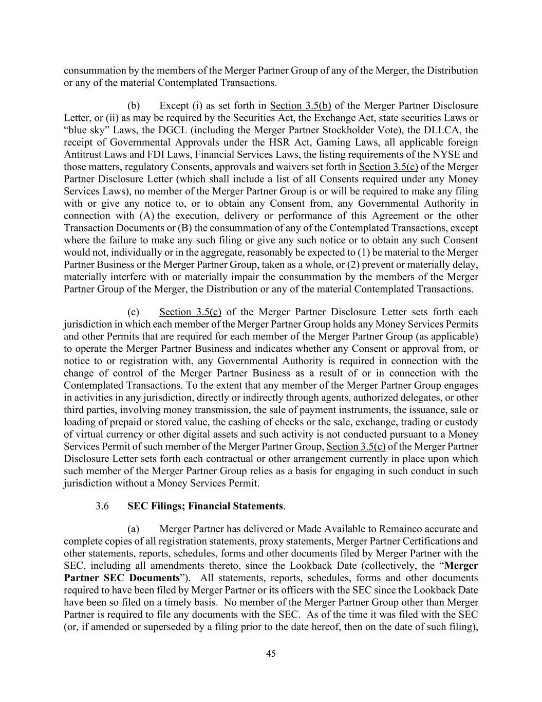 45 consummation by the members of the Merger Partner Group of any of the Merger, the Distribution or any of the material Contemplated Transactions. (b) Except (i) as set forth in Section 3.5(b) of the Merger Partner Disclosure Letter, or (ii) as may be required by the Securities Act, the Exchange Act, state securities Laws or “blue sky” Laws, the DGCL (including the Merger Partner Stockholder Vote), the DLLCA, the receipt of Governmental Approvals under the HSR Act, Gaming Laws, all applicable foreign Antitrust Laws and FDI Laws, Financial Services Laws, the listing requirements of the NYSE and those matters, regulatory Consents, approvals and waivers set forth in Section 3.5(c) of the Merger Partner Disclosure Letter (which shall include a list of all Consents required under any Money Services Laws), no member of the Merger Partner Group is or will be required to make any filing with or give any notice to, or to obtain any Consent from, any Governmental Authority in connection with (A) the execution, delivery or performance of this Agreement or the other Transaction Documents or (B) the consummation of any of the Contemplated Transactions, except where the failure to make any such filing or give any such notice or to obtain any such Consent would not, individually or in the aggregate, reasonably be expected to (1) be material to the Merger Partner Business or the Merger Partner Group, taken as a whole, or (2) prevent or materially delay, materially interfere with or materially impair the consummation by the members of the Merger Partner Group of the Merger, the Distribution or any of the material Contemplated Transactions. (c) Section 3.5(c) of the Merger Partner Disclosure Letter sets forth each jurisdiction in which each member of the Merger Partner Group holds any Money Services Permits and other Permits that are required for each member of the Merger Partner Group (as applicable) to operate the Merger Partner Business and indicates whether any Consent or approval from, or notice to or registration with, any Governmental Authority is required in connection with the change of control of the Merger Partner Business as a result of or in connection with the Contemplated Transactions. To the extent that any member of the Merger Partner Group engages in activities in any jurisdiction, directly or indirectly through agents, authorized delegates, or other third parties, involving money transmission, the sale of payment instruments, the issuance, sale or loading of prepaid or stored value, the cashing of checks or the sale, exchange, trading or custody of virtual currency or other digital assets and such activity is not conducted pursuant to a Money Services Permit of such member of the Merger Partner Group, Section 3.5(c) of the Merger Partner Disclosure Letter sets forth each contractual or other arrangement currently in place upon which such member of the Merger Partner Group relies as a basis for engaging in such conduct in such jurisdiction without a Money Services Permit. 3.6 SEC Filings; Financial Statements. (a) Merger Partner has delivered or Made Available to Remainco accurate and complete copies of all registration statements, proxy statements, Merger Partner Certifications and other statements, reports, schedules, forms and other documents filed by Merger Partner with the SEC, including all amendments thereto, since the Lookback Date (collectively, the “Merger Partner SEC Documents”). All statements, reports, schedules, forms and other documents required to have been filed by Merger Partner or its officers with the SEC since the Lookback Date have been so filed on a timely basis. No member of the Merger Partner Group other than Merger Partner is required to file any documents with the SEC. As of the time it was filed with the SEC (or, if amended or superseded by a filing prior to the date hereof, then on the date of such filing),