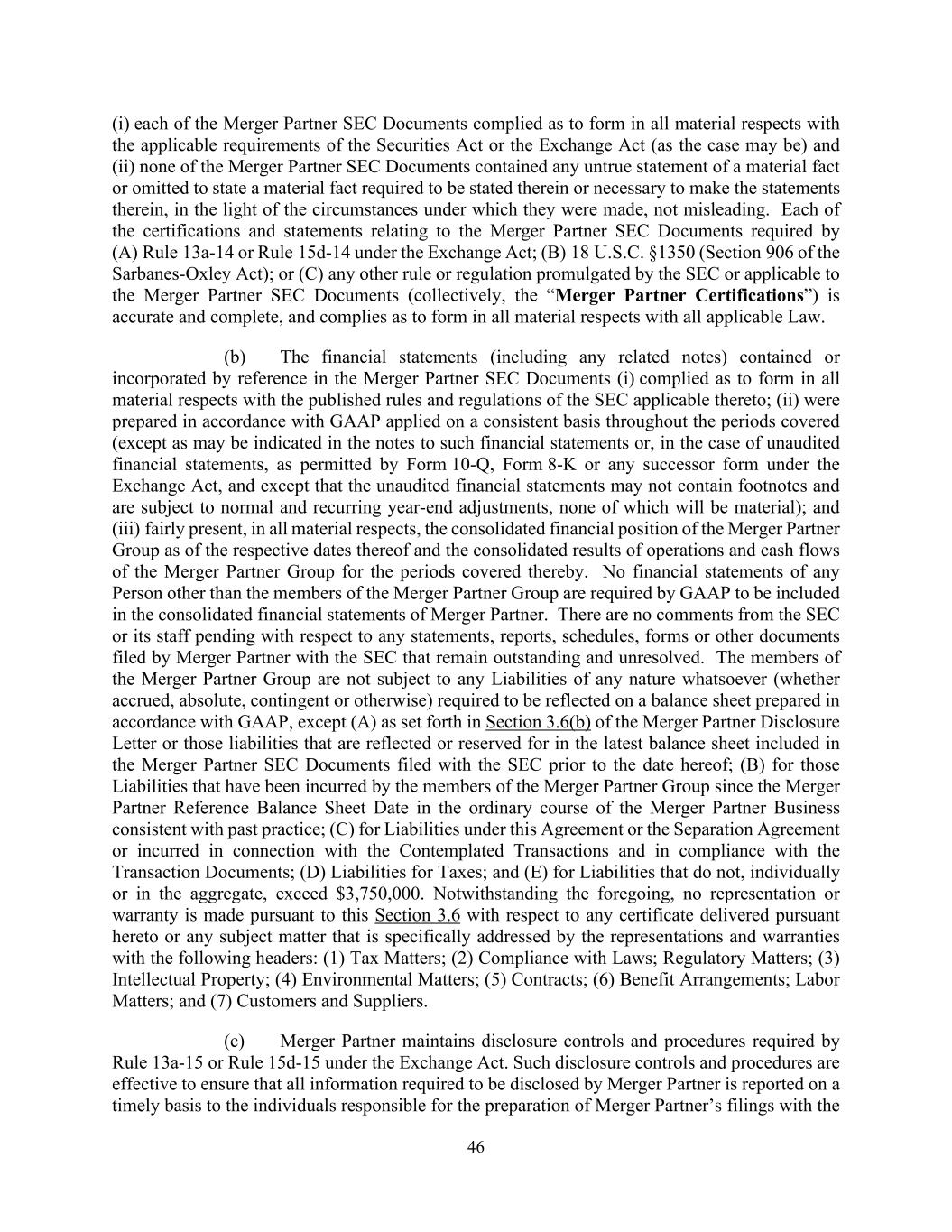 46 (i) each of the Merger Partner SEC Documents complied as to form in all material respects with the applicable requirements of the Securities Act or the Exchange Act (as the case may be) and (ii) none of the Merger Partner SEC Documents contained any untrue statement of a material fact or omitted to state a material fact required to be stated therein or necessary to make the statements therein, in the light of the circumstances under which they were made, not misleading. Each of the certifications and statements relating to the Merger Partner SEC Documents required by (A) Rule 13a-14 or Rule 15d-14 under the Exchange Act; (B) 18 U.S.C. §1350 (Section 906 of the Sarbanes-Oxley Act); or (C) any other rule or regulation promulgated by the SEC or applicable to the Merger Partner SEC Documents (collectively, the “Merger Partner Certifications”) is accurate and complete, and complies as to form in all material respects with all applicable Law. (b) The financial statements (including any related notes) contained or incorporated by reference in the Merger Partner SEC Documents (i) complied as to form in all material respects with the published rules and regulations of the SEC applicable thereto; (ii) were prepared in accordance with GAAP applied on a consistent basis throughout the periods covered (except as may be indicated in the notes to such financial statements or, in the case of unaudited financial statements, as permitted by Form 10-Q, Form 8-K or any successor form under the Exchange Act, and except that the unaudited financial statements may not contain footnotes and are subject to normal and recurring year-end adjustments, none of which will be material); and (iii) fairly present, in all material respects, the consolidated financial position of the Merger Partner Group as of the respective dates thereof and the consolidated results of operations and cash flows of the Merger Partner Group for the periods covered thereby. No financial statements of any Person other than the members of the Merger Partner Group are required by GAAP to be included in the consolidated financial statements of Merger Partner. There are no comments from the SEC or its staff pending with respect to any statements, reports, schedules, forms or other documents filed by Merger Partner with the SEC that remain outstanding and unresolved. The members of the Merger Partner Group are not subject to any Liabilities of any nature whatsoever (whether accrued, absolute, contingent or otherwise) required to be reflected on a balance sheet prepared in accordance with GAAP, except (A) as set forth in Section 3.6(b) of the Merger Partner Disclosure Letter or those liabilities that are reflected or reserved for in the latest balance sheet included in the Merger Partner SEC Documents filed with the SEC prior to the date hereof; (B) for those Liabilities that have been incurred by the members of the Merger Partner Group since the Merger Partner Reference Balance Sheet Date in the ordinary course of the Merger Partner Business consistent with past practice; (C) for Liabilities under this Agreement or the Separation Agreement or incurred in connection with the Contemplated Transactions and in compliance with the Transaction Documents; (D) Liabilities for Taxes; and (E) for Liabilities that do not, individually or in the aggregate, exceed $3,750,000. Notwithstanding the foregoing, no representation or warranty is made pursuant to this Section 3.6 with respect to any certificate delivered pursuant hereto or any subject matter that is specifically addressed by the representations and warranties with the following headers: (1) Tax Matters; (2) Compliance with Laws; Regulatory Matters; (3) Intellectual Property; (4) Environmental Matters; (5) Contracts; (6) Benefit Arrangements; Labor Matters; and (7) Customers and Suppliers. (c) Merger Partner maintains disclosure controls and procedures required by Rule 13a-15 or Rule 15d-15 under the Exchange Act. Such disclosure controls and procedures are effective to ensure that all information required to be disclosed by Merger Partner is reported on a timely basis to the individuals responsible for the preparation of Merger Partner’s filings with the