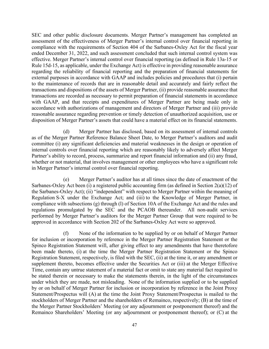 47 SEC and other public disclosure documents. Merger Partner’s management has completed an assessment of the effectiveness of Merger Partner’s internal control over financial reporting in compliance with the requirements of Section 404 of the Sarbanes-Oxley Act for the fiscal year ended December 31, 2022, and such assessment concluded that such internal control system was effective. Merger Partner’s internal control over financial reporting (as defined in Rule 13a-15 or Rule 15d-15, as applicable, under the Exchange Act) is effective in providing reasonable assurance regarding the reliability of financial reporting and the preparation of financial statements for external purposes in accordance with GAAP and includes policies and procedures that (i) pertain to the maintenance of records that are in reasonable detail and accurately and fairly reflect the transactions and dispositions of the assets of Merger Partner, (ii) provide reasonable assurance that transactions are recorded as necessary to permit preparation of financial statements in accordance with GAAP, and that receipts and expenditures of Merger Partner are being made only in accordance with authorizations of management and directors of Merger Partner and (iii) provide reasonable assurance regarding prevention or timely detection of unauthorized acquisition, use or disposition of Merger Partner’s assets that could have a material effect on its financial statements. (d) Merger Partner has disclosed, based on its assessment of internal controls as of the Merger Partner Reference Balance Sheet Date, to Merger Partner’s auditors and audit committee (i) any significant deficiencies and material weaknesses in the design or operation of internal controls over financial reporting which are reasonably likely to adversely affect Merger Partner’s ability to record, process, summarize and report financial information and (ii) any fraud, whether or not material, that involves management or other employees who have a significant role in Merger Partner’s internal control over financial reporting. (e) Merger Partner’s auditor has at all times since the date of enactment of the Sarbanes-Oxley Act been (i) a registered public accounting firm (as defined in Section 2(a)(12) of the Sarbanes-Oxley Act); (ii) “independent” with respect to Merger Partner within the meaning of Regulation S-X under the Exchange Act; and (iii) to the Knowledge of Merger Partner, in compliance with subsections (g) through (l) of Section 10A of the Exchange Act and the rules and regulations promulgated by the SEC and the PCAOB thereunder. All non-audit services performed by Merger Partner’s auditors for the Merger Partner Group that were required to be approved in accordance with Section 202 of the Sarbanes-Oxley Act were so approved. (f) None of the information to be supplied by or on behalf of Merger Partner for inclusion or incorporation by reference in the Merger Partner Registration Statement or the Spinco Registration Statement will, after giving effect to any amendments that have theretofore been made thereto, (i) at the time the Merger Partner Registration Statement or the Spinco Registration Statement, respectively, is filed with the SEC, (ii) at the time it, or any amendment or supplement thereto, becomes effective under the Securities Act or (iii) at the Merger Effective Time, contain any untrue statement of a material fact or omit to state any material fact required to be stated therein or necessary to make the statements therein, in the light of the circumstances under which they are made, not misleading. None of the information supplied or to be supplied by or on behalf of Merger Partner for inclusion or incorporation by reference in the Joint Proxy Statement/Prospectus will (A) at the time the Joint Proxy Statement/Prospectus is mailed to the stockholders of Merger Partner and the shareholders of Remainco, respectively; (B) at the time of the Merger Partner Stockholders’ Meeting (or any adjournment or postponement thereof) and the Remainco Shareholders’ Meeting (or any adjournment or postponement thereof); or (C) at the