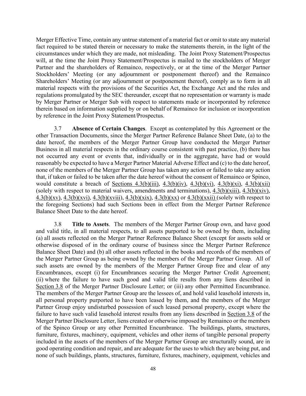 48 Merger Effective Time, contain any untrue statement of a material fact or omit to state any material fact required to be stated therein or necessary to make the statements therein, in the light of the circumstances under which they are made, not misleading. The Joint Proxy Statement/Prospectus will, at the time the Joint Proxy Statement/Prospectus is mailed to the stockholders of Merger Partner and the shareholders of Remainco, respectively, or at the time of the Merger Partner Stockholders’ Meeting (or any adjournment or postponement thereof) and the Remainco Shareholders’ Meeting (or any adjournment or postponement thereof), comply as to form in all material respects with the provisions of the Securities Act, the Exchange Act and the rules and regulations promulgated by the SEC thereunder, except that no representation or warranty is made by Merger Partner or Merger Sub with respect to statements made or incorporated by reference therein based on information supplied by or on behalf of Remainco for inclusion or incorporation by reference in the Joint Proxy Statement/Prospectus. 3.7 Absence of Certain Changes. Except as contemplated by this Agreement or the other Transaction Documents, since the Merger Partner Reference Balance Sheet Date, (a) to the date hereof, the members of the Merger Partner Group have conducted the Merger Partner Business in all material respects in the ordinary course consistent with past practice, (b) there has not occurred any event or events that, individually or in the aggregate, have had or would reasonably be expected to have a Merger Partner Material Adverse Effect and (c) to the date hereof, none of the members of the Merger Partner Group has taken any action or failed to take any action that, if taken or failed to be taken after the date hereof without the consent of Remainco or Spinco, would constitute a breach of Sections 4.3(b)(iii), 4.3(b)(iv), 4.3(b)(vi), 4.3(b)(xi), 4.3(b)(xii) (solely with respect to material waivers, amendments and terminations), 4.3(b)(xiii), 4.3(b)(xiv), 4.3(b)(xv), 4.3(b)(xvi), 4.3(b)(xviii), 4.3(b)(xix), 4.3(b)(xx) or 4.3(b)(xxii) (solely with respect to the foregoing Sections) had such Sections been in effect from the Merger Partner Reference Balance Sheet Date to the date hereof. 3.8 Title to Assets. The members of the Merger Partner Group own, and have good and valid title, in all material respects, to all assets purported to be owned by them, including (a) all assets reflected on the Merger Partner Reference Balance Sheet (except for assets sold or otherwise disposed of in the ordinary course of business since the Merger Partner Reference Balance Sheet Date) and (b) all other assets reflected in the books and records of the members of the Merger Partner Group as being owned by the members of the Merger Partner Group. All of such assets are owned by the members of the Merger Partner Group free and clear of any Encumbrances, except (i) for Encumbrances securing the Merger Partner Credit Agreement; (ii) where the failure to have such good and valid title results from any liens described in Section 3.8 of the Merger Partner Disclosure Letter; or (iii) any other Permitted Encumbrance. The members of the Merger Partner Group are the lessees of, and hold valid leasehold interests in, all personal property purported to have been leased by them, and the members of the Merger Partner Group enjoy undisturbed possession of such leased personal property, except where the failure to have such valid leasehold interest results from any liens described in Section 3.8 of the Merger Partner Disclosure Letter, liens created or otherwise imposed by Remainco or the members of the Spinco Group or any other Permitted Encumbrance. The buildings, plants, structures, furniture, fixtures, machinery, equipment, vehicles and other items of tangible personal property included in the assets of the members of the Merger Partner Group are structurally sound, are in good operating condition and repair, and are adequate for the uses to which they are being put, and none of such buildings, plants, structures, furniture, fixtures, machinery, equipment, vehicles and
