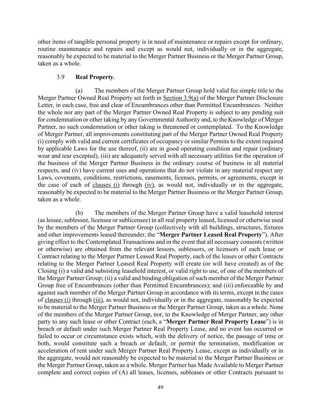 49 other items of tangible personal property is in need of maintenance or repairs except for ordinary, routine maintenance and repairs and except as would not, individually or in the aggregate, reasonably be expected to be material to the Merger Partner Business or the Merger Partner Group, taken as a whole. 3.9 Real Property. (a) The members of the Merger Partner Group hold valid fee simple title to the Merger Partner Owned Real Property set forth in Section 3.9(a) of the Merger Partner Disclosure Letter, in each case, free and clear of Encumbrances other than Permitted Encumbrances. Neither the whole nor any part of the Merger Partner Owned Real Property is subject to any pending suit for condemnation or other taking by any Governmental Authority and, to the Knowledge of Merger Partner, no such condemnation or other taking is threatened or contemplated. To the Knowledge of Merger Partner, all improvements constituting part of the Merger Partner Owned Real Property (i) comply with valid and current certificates of occupancy or similar Permits to the extent required by applicable Laws for the use thereof, (ii) are in good operating condition and repair (ordinary wear and tear excepted), (iii) are adequately served with all necessary utilities for the operation of the business of the Merger Partner Business in the ordinary course of business in all material respects, and (iv) have current uses and operations that do not violate in any material respect any Laws, covenants, conditions, restrictions, easements, licenses, permits, or agreements, except in the case of each of clauses (i) through (iv), as would not, individually or in the aggregate, reasonably be expected to be material to the Merger Partner Business or the Merger Partner Group, taken as a whole. (b) The members of the Merger Partner Group have a valid leasehold interest (as lessee, sublessee, licensee or sublicensee) in all real property leased, licensed or otherwise used by the members of the Merger Partner Group (collectively with all buildings, structures, fixtures and other improvements leased thereunder, the “Merger Partner Leased Real Property”). After giving effect to the Contemplated Transactions and in the event that all necessary consents (written or otherwise) are obtained from the relevant lessors, sublessors, or licensors of each lease or Contract relating to the Merger Partner Leased Real Property, each of the leases or other Contracts relating to the Merger Partner Leased Real Property will create (or will have created) as of the Closing (i) a valid and subsisting leasehold interest, or valid right to use, of one of the members of the Merger Partner Group; (ii) a valid and binding obligation of such member of the Merger Partner Group free of Encumbrances (other than Permitted Encumbrances); and (iii) enforceable by and against such member of the Merger Partner Group in accordance with its terms, except in the cases of clauses (i) through (iii), as would not, individually or in the aggregate, reasonably be expected to be material to the Merger Partner Business or the Merger Partner Group, taken as a whole. None of the members of the Merger Partner Group, nor, to the Knowledge of Merger Partner, any other party to any such lease or other Contract (each, a “Merger Partner Real Property Lease”) is in breach or default under such Merger Partner Real Property Lease, and no event has occurred or failed to occur or circumstance exists which, with the delivery of notice, the passage of time or both, would constitute such a breach or default, or permit the termination, modification or acceleration of rent under such Merger Partner Real Property Lease, except as individually or in the aggregate, would not reasonably be expected to be material to the Merger Partner Business or the Merger Partner Group, taken as a whole. Merger Partner has Made Available to Merger Partner complete and correct copies of (A) all leases, licenses, subleases or other Contracts pursuant to