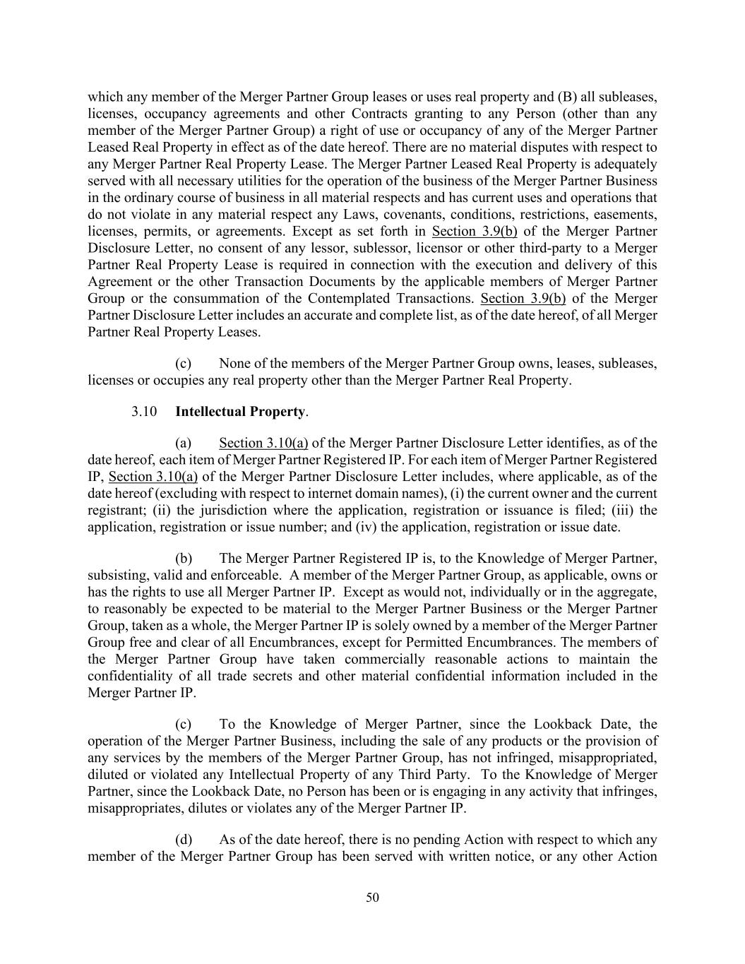 50 which any member of the Merger Partner Group leases or uses real property and (B) all subleases, licenses, occupancy agreements and other Contracts granting to any Person (other than any member of the Merger Partner Group) a right of use or occupancy of any of the Merger Partner Leased Real Property in effect as of the date hereof. There are no material disputes with respect to any Merger Partner Real Property Lease. The Merger Partner Leased Real Property is adequately served with all necessary utilities for the operation of the business of the Merger Partner Business in the ordinary course of business in all material respects and has current uses and operations that do not violate in any material respect any Laws, covenants, conditions, restrictions, easements, licenses, permits, or agreements. Except as set forth in Section 3.9(b) of the Merger Partner Disclosure Letter, no consent of any lessor, sublessor, licensor or other third-party to a Merger Partner Real Property Lease is required in connection with the execution and delivery of this Agreement or the other Transaction Documents by the applicable members of Merger Partner Group or the consummation of the Contemplated Transactions. Section 3.9(b) of the Merger Partner Disclosure Letter includes an accurate and complete list, as of the date hereof, of all Merger Partner Real Property Leases. (c) None of the members of the Merger Partner Group owns, leases, subleases, licenses or occupies any real property other than the Merger Partner Real Property. 3.10 Intellectual Property. (a) Section 3.10(a) of the Merger Partner Disclosure Letter identifies, as of the date hereof, each item of Merger Partner Registered IP. For each item of Merger Partner Registered IP, Section 3.10(a) of the Merger Partner Disclosure Letter includes, where applicable, as of the date hereof (excluding with respect to internet domain names), (i) the current owner and the current registrant; (ii) the jurisdiction where the application, registration or issuance is filed; (iii) the application, registration or issue number; and (iv) the application, registration or issue date. (b) The Merger Partner Registered IP is, to the Knowledge of Merger Partner, subsisting, valid and enforceable. A member of the Merger Partner Group, as applicable, owns or has the rights to use all Merger Partner IP. Except as would not, individually or in the aggregate, to reasonably be expected to be material to the Merger Partner Business or the Merger Partner Group, taken as a whole, the Merger Partner IP is solely owned by a member of the Merger Partner Group free and clear of all Encumbrances, except for Permitted Encumbrances. The members of the Merger Partner Group have taken commercially reasonable actions to maintain the confidentiality of all trade secrets and other material confidential information included in the Merger Partner IP. (c) To the Knowledge of Merger Partner, since the Lookback Date, the operation of the Merger Partner Business, including the sale of any products or the provision of any services by the members of the Merger Partner Group, has not infringed, misappropriated, diluted or violated any Intellectual Property of any Third Party. To the Knowledge of Merger Partner, since the Lookback Date, no Person has been or is engaging in any activity that infringes, misappropriates, dilutes or violates any of the Merger Partner IP. (d) As of the date hereof, there is no pending Action with respect to which any member of the Merger Partner Group has been served with written notice, or any other Action