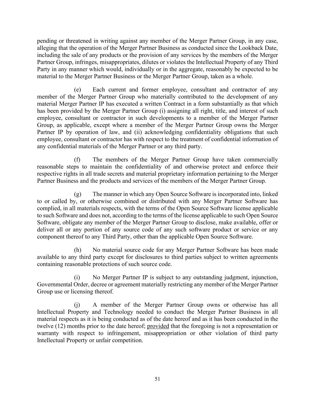 51 pending or threatened in writing against any member of the Merger Partner Group, in any case, alleging that the operation of the Merger Partner Business as conducted since the Lookback Date, including the sale of any products or the provision of any services by the members of the Merger Partner Group, infringes, misappropriates, dilutes or violates the Intellectual Property of any Third Party in any manner which would, individually or in the aggregate, reasonably be expected to be material to the Merger Partner Business or the Merger Partner Group, taken as a whole. (e) Each current and former employee, consultant and contractor of any member of the Merger Partner Group who materially contributed to the development of any material Merger Partner IP has executed a written Contract in a form substantially as that which has been provided by the Merger Partner Group (i) assigning all right, title, and interest of such employee, consultant or contractor in such developments to a member of the Merger Partner Group, as applicable, except where a member of the Merger Partner Group owns the Merger Partner IP by operation of law, and (ii) acknowledging confidentiality obligations that such employee, consultant or contractor has with respect to the treatment of confidential information of any confidential materials of the Merger Partner or any third party. (f) The members of the Merger Partner Group have taken commercially reasonable steps to maintain the confidentiality of and otherwise protect and enforce their respective rights in all trade secrets and material proprietary information pertaining to the Merger Partner Business and the products and services of the members of the Merger Partner Group. (g) The manner in which any Open Source Software is incorporated into, linked to or called by, or otherwise combined or distributed with any Merger Partner Software has complied, in all materials respects, with the terms of the Open Source Software license applicable to such Software and does not, according to the terms of the license applicable to such Open Source Software, obligate any member of the Merger Partner Group to disclose, make available, offer or deliver all or any portion of any source code of any such software product or service or any component thereof to any Third Party, other than the applicable Open Source Software. (h) No material source code for any Merger Partner Software has been made available to any third party except for disclosures to third parties subject to written agreements containing reasonable protections of such source code. (i) No Merger Partner IP is subject to any outstanding judgment, injunction, Governmental Order, decree or agreement materially restricting any member of the Merger Partner Group use or licensing thereof. (j) A member of the Merger Partner Group owns or otherwise has all Intellectual Property and Technology needed to conduct the Merger Partner Business in all material respects as it is being conducted as of the date hereof and as it has been conducted in the twelve (12) months prior to the date hereof; provided that the foregoing is not a representation or warranty with respect to infringement, misappropriation or other violation of third party Intellectual Property or unfair competition.