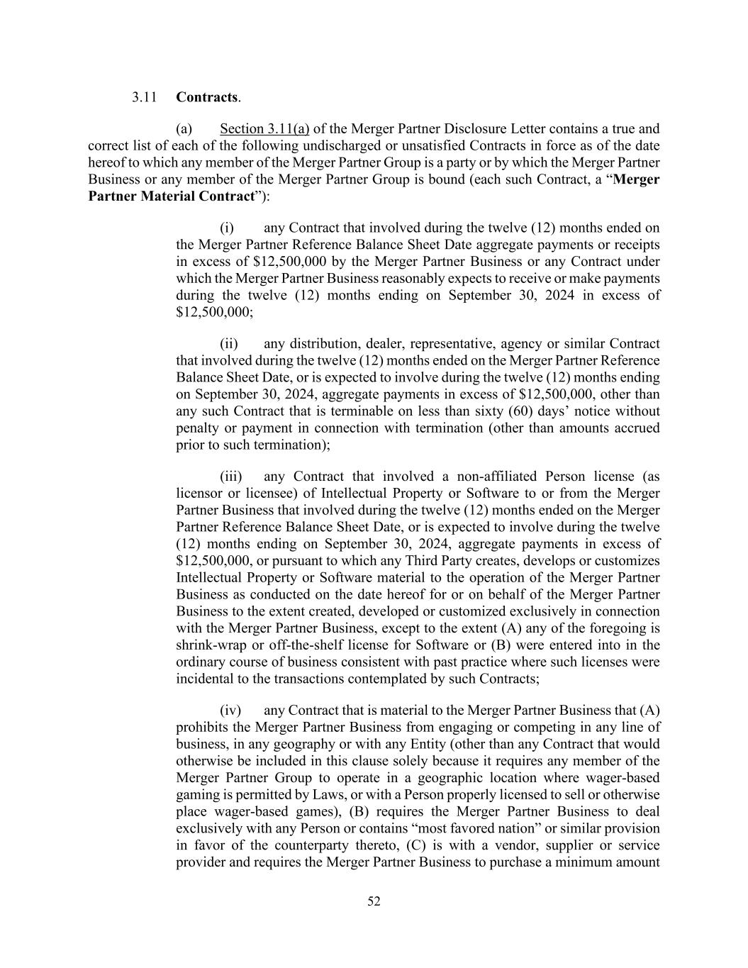52 3.11 Contracts. (a) Section 3.11(a) of the Merger Partner Disclosure Letter contains a true and correct list of each of the following undischarged or unsatisfied Contracts in force as of the date hereof to which any member of the Merger Partner Group is a party or by which the Merger Partner Business or any member of the Merger Partner Group is bound (each such Contract, a “Merger Partner Material Contract”): (i) any Contract that involved during the twelve (12) months ended on the Merger Partner Reference Balance Sheet Date aggregate payments or receipts in excess of $12,500,000 by the Merger Partner Business or any Contract under which the Merger Partner Business reasonably expects to receive or make payments during the twelve (12) months ending on September 30, 2024 in excess of $12,500,000; (ii) any distribution, dealer, representative, agency or similar Contract that involved during the twelve (12) months ended on the Merger Partner Reference Balance Sheet Date, or is expected to involve during the twelve (12) months ending on September 30, 2024, aggregate payments in excess of $12,500,000, other than any such Contract that is terminable on less than sixty (60) days’ notice without penalty or payment in connection with termination (other than amounts accrued prior to such termination); (iii) any Contract that involved a non-affiliated Person license (as licensor or licensee) of Intellectual Property or Software to or from the Merger Partner Business that involved during the twelve (12) months ended on the Merger Partner Reference Balance Sheet Date, or is expected to involve during the twelve (12) months ending on September 30, 2024, aggregate payments in excess of $12,500,000, or pursuant to which any Third Party creates, develops or customizes Intellectual Property or Software material to the operation of the Merger Partner Business as conducted on the date hereof for or on behalf of the Merger Partner Business to the extent created, developed or customized exclusively in connection with the Merger Partner Business, except to the extent (A) any of the foregoing is shrink-wrap or off-the-shelf license for Software or (B) were entered into in the ordinary course of business consistent with past practice where such licenses were incidental to the transactions contemplated by such Contracts; (iv) any Contract that is material to the Merger Partner Business that (A) prohibits the Merger Partner Business from engaging or competing in any line of business, in any geography or with any Entity (other than any Contract that would otherwise be included in this clause solely because it requires any member of the Merger Partner Group to operate in a geographic location where wager-based gaming is permitted by Laws, or with a Person properly licensed to sell or otherwise place wager-based games), (B) requires the Merger Partner Business to deal exclusively with any Person or contains “most favored nation” or similar provision in favor of the counterparty thereto, (C) is with a vendor, supplier or service provider and requires the Merger Partner Business to purchase a minimum amount