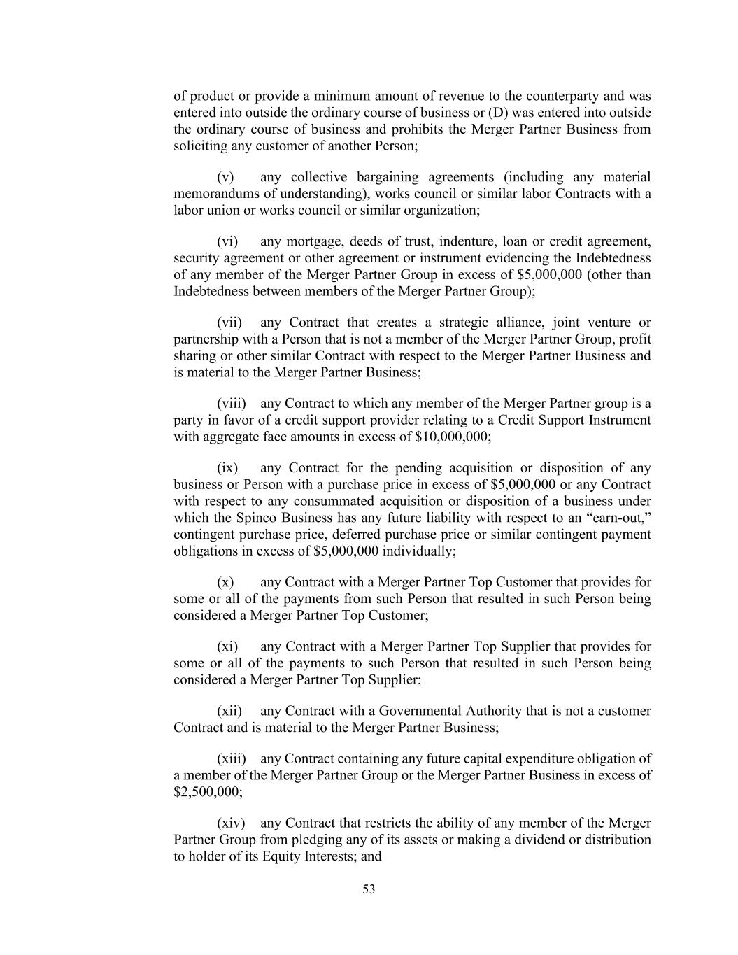 53 of product or provide a minimum amount of revenue to the counterparty and was entered into outside the ordinary course of business or (D) was entered into outside the ordinary course of business and prohibits the Merger Partner Business from soliciting any customer of another Person; (v) any collective bargaining agreements (including any material memorandums of understanding), works council or similar labor Contracts with a labor union or works council or similar organization; (vi) any mortgage, deeds of trust, indenture, loan or credit agreement, security agreement or other agreement or instrument evidencing the Indebtedness of any member of the Merger Partner Group in excess of $5,000,000 (other than Indebtedness between members of the Merger Partner Group); (vii) any Contract that creates a strategic alliance, joint venture or partnership with a Person that is not a member of the Merger Partner Group, profit sharing or other similar Contract with respect to the Merger Partner Business and is material to the Merger Partner Business; (viii) any Contract to which any member of the Merger Partner group is a party in favor of a credit support provider relating to a Credit Support Instrument with aggregate face amounts in excess of $10,000,000; (ix) any Contract for the pending acquisition or disposition of any business or Person with a purchase price in excess of $5,000,000 or any Contract with respect to any consummated acquisition or disposition of a business under which the Spinco Business has any future liability with respect to an “earn-out,” contingent purchase price, deferred purchase price or similar contingent payment obligations in excess of $5,000,000 individually; (x) any Contract with a Merger Partner Top Customer that provides for some or all of the payments from such Person that resulted in such Person being considered a Merger Partner Top Customer; (xi) any Contract with a Merger Partner Top Supplier that provides for some or all of the payments to such Person that resulted in such Person being considered a Merger Partner Top Supplier; (xii) any Contract with a Governmental Authority that is not a customer Contract and is material to the Merger Partner Business; (xiii) any Contract containing any future capital expenditure obligation of a member of the Merger Partner Group or the Merger Partner Business in excess of $2,500,000; (xiv) any Contract that restricts the ability of any member of the Merger Partner Group from pledging any of its assets or making a dividend or distribution to holder of its Equity Interests; and