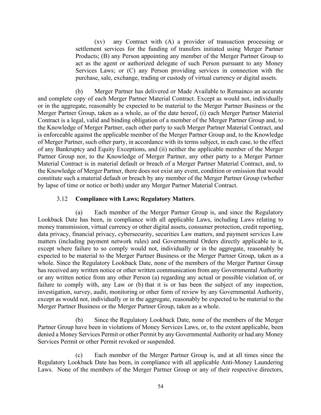 54 (xv) any Contract with (A) a provider of transaction processing or settlement services for the funding of transfers initiated using Merger Partner Products; (B) any Person appointing any member of the Merger Partner Group to act as the agent or authorized delegate of such Person pursuant to any Money Services Laws; or (C) any Person providing services in connection with the purchase, sale, exchange, trading or custody of virtual currency or digital assets. (b) Merger Partner has delivered or Made Available to Remainco an accurate and complete copy of each Merger Partner Material Contract. Except as would not, individually or in the aggregate, reasonably be expected to be material to the Merger Partner Business or the Merger Partner Group, taken as a whole, as of the date hereof, (i) each Merger Partner Material Contract is a legal, valid and binding obligation of a member of the Merger Partner Group and, to the Knowledge of Merger Partner, each other party to such Merger Partner Material Contract, and is enforceable against the applicable member of the Merger Partner Group and, to the Knowledge of Merger Partner, such other party, in accordance with its terms subject, in each case, to the effect of any Bankruptcy and Equity Exceptions, and (ii) neither the applicable member of the Merger Partner Group nor, to the Knowledge of Merger Partner, any other party to a Merger Partner Material Contract is in material default or breach of a Merger Partner Material Contract, and, to the Knowledge of Merger Partner, there does not exist any event, condition or omission that would constitute such a material default or breach by any member of the Merger Partner Group (whether by lapse of time or notice or both) under any Merger Partner Material Contract. 3.12 Compliance with Laws; Regulatory Matters. (a) Each member of the Merger Partner Group is, and since the Regulatory Lookback Date has been, in compliance with all applicable Laws, including Laws relating to money transmission, virtual currency or other digital assets, consumer protection, credit reporting, data privacy, financial privacy, cybersecurity, securities Law matters, and payment services Law matters (including payment network rules) and Governmental Orders directly applicable to it, except where failure to so comply would not, individually or in the aggregate, reasonably be expected to be material to the Merger Partner Business or the Merger Partner Group, taken as a whole. Since the Regulatory Lookback Date, none of the members of the Merger Partner Group has received any written notice or other written communication from any Governmental Authority or any written notice from any other Person (a) regarding any actual or possible violation of, or failure to comply with, any Law or (b) that it is or has been the subject of any inspection, investigation, survey, audit, monitoring or other form of review by any Governmental Authority, except as would not, individually or in the aggregate, reasonably be expected to be material to the Merger Partner Business or the Merger Partner Group, taken as a whole. (b) Since the Regulatory Lookback Date, none of the members of the Merger Partner Group have been in violations of Money Services Laws, or, to the extent applicable, been denied a Money Services Permit or other Permit by any Governmental Authority or had any Money Services Permit or other Permit revoked or suspended. (c) Each member of the Merger Partner Group is, and at all times since the Regulatory Lookback Date has been, in compliance with all applicable Anti-Money Laundering Laws. None of the members of the Merger Partner Group or any of their respective directors,