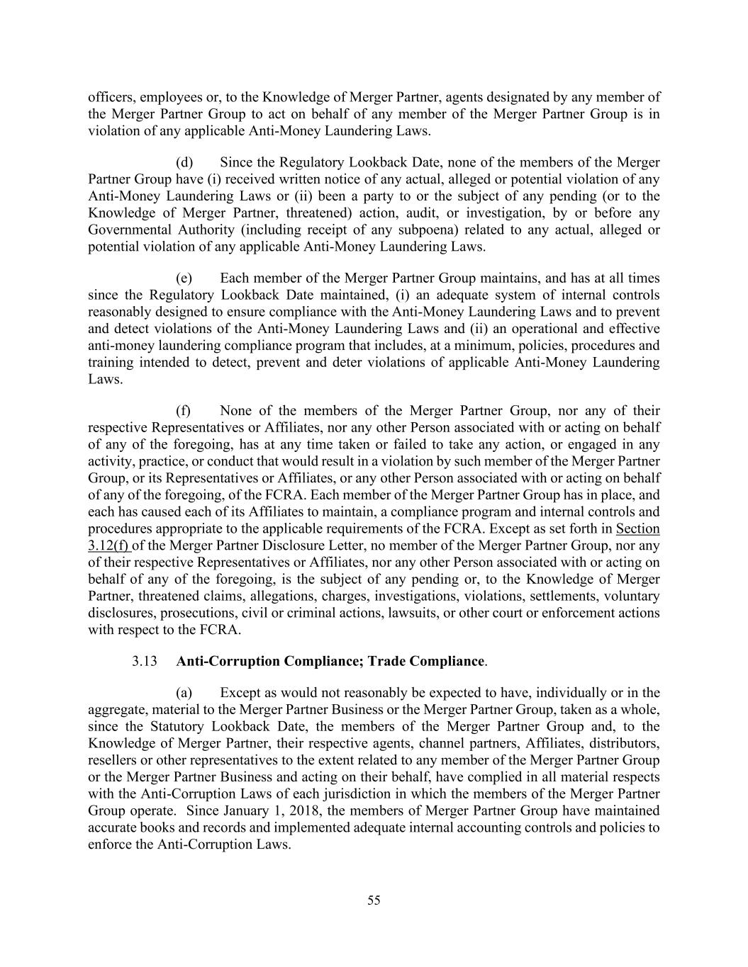 55 officers, employees or, to the Knowledge of Merger Partner, agents designated by any member of the Merger Partner Group to act on behalf of any member of the Merger Partner Group is in violation of any applicable Anti-Money Laundering Laws. (d) Since the Regulatory Lookback Date, none of the members of the Merger Partner Group have (i) received written notice of any actual, alleged or potential violation of any Anti-Money Laundering Laws or (ii) been a party to or the subject of any pending (or to the Knowledge of Merger Partner, threatened) action, audit, or investigation, by or before any Governmental Authority (including receipt of any subpoena) related to any actual, alleged or potential violation of any applicable Anti-Money Laundering Laws. (e) Each member of the Merger Partner Group maintains, and has at all times since the Regulatory Lookback Date maintained, (i) an adequate system of internal controls reasonably designed to ensure compliance with the Anti-Money Laundering Laws and to prevent and detect violations of the Anti-Money Laundering Laws and (ii) an operational and effective anti-money laundering compliance program that includes, at a minimum, policies, procedures and training intended to detect, prevent and deter violations of applicable Anti-Money Laundering Laws. (f) None of the members of the Merger Partner Group, nor any of their respective Representatives or Affiliates, nor any other Person associated with or acting on behalf of any of the foregoing, has at any time taken or failed to take any action, or engaged in any activity, practice, or conduct that would result in a violation by such member of the Merger Partner Group, or its Representatives or Affiliates, or any other Person associated with or acting on behalf of any of the foregoing, of the FCRA. Each member of the Merger Partner Group has in place, and each has caused each of its Affiliates to maintain, a compliance program and internal controls and procedures appropriate to the applicable requirements of the FCRA. Except as set forth in Section 3.12(f) of the Merger Partner Disclosure Letter, no member of the Merger Partner Group, nor any of their respective Representatives or Affiliates, nor any other Person associated with or acting on behalf of any of the foregoing, is the subject of any pending or, to the Knowledge of Merger Partner, threatened claims, allegations, charges, investigations, violations, settlements, voluntary disclosures, prosecutions, civil or criminal actions, lawsuits, or other court or enforcement actions with respect to the FCRA. 3.13 Anti-Corruption Compliance; Trade Compliance. (a) Except as would not reasonably be expected to have, individually or in the aggregate, material to the Merger Partner Business or the Merger Partner Group, taken as a whole, since the Statutory Lookback Date, the members of the Merger Partner Group and, to the Knowledge of Merger Partner, their respective agents, channel partners, Affiliates, distributors, resellers or other representatives to the extent related to any member of the Merger Partner Group or the Merger Partner Business and acting on their behalf, have complied in all material respects with the Anti-Corruption Laws of each jurisdiction in which the members of the Merger Partner Group operate. Since January 1, 2018, the members of Merger Partner Group have maintained accurate books and records and implemented adequate internal accounting controls and policies to enforce the Anti-Corruption Laws.