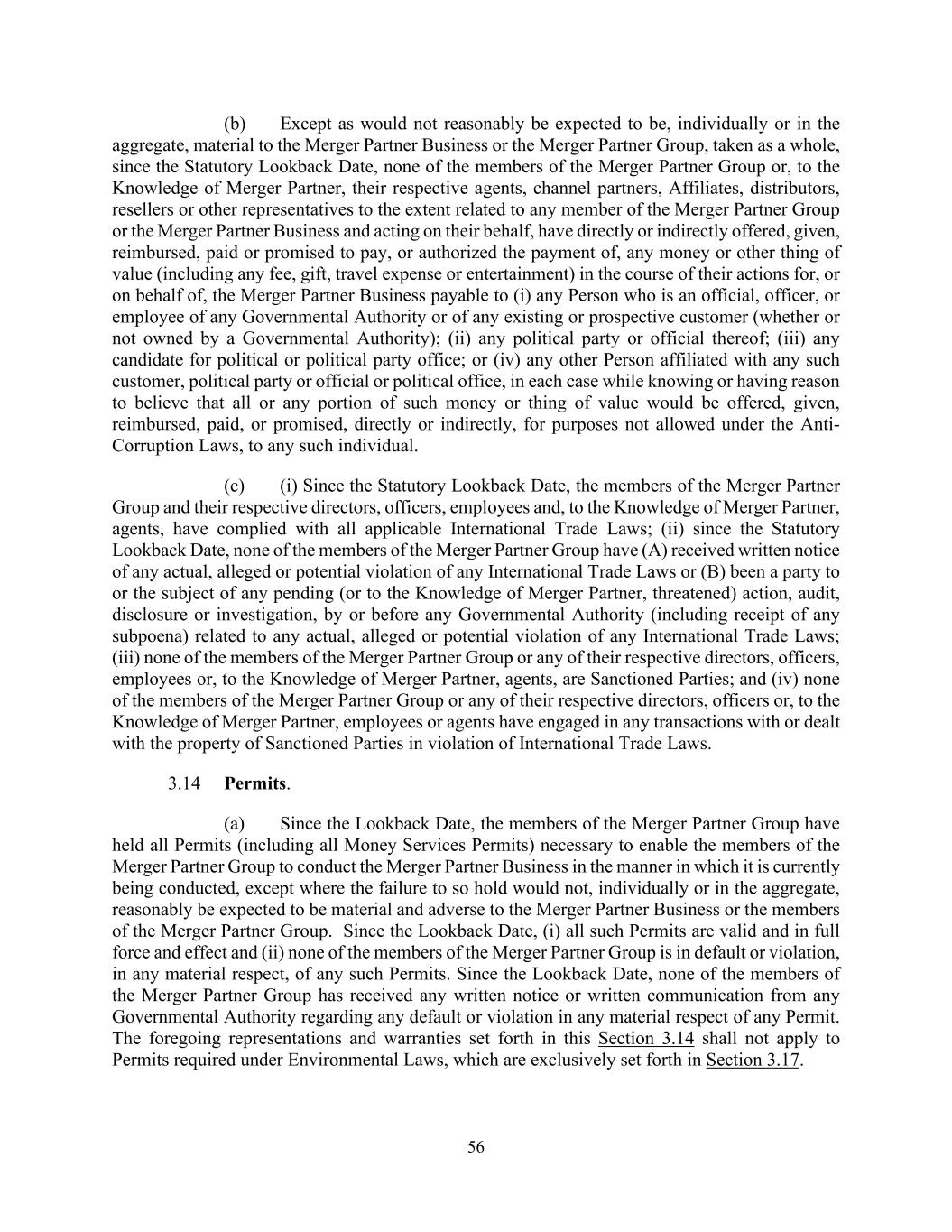 56 (b) Except as would not reasonably be expected to be, individually or in the aggregate, material to the Merger Partner Business or the Merger Partner Group, taken as a whole, since the Statutory Lookback Date, none of the members of the Merger Partner Group or, to the Knowledge of Merger Partner, their respective agents, channel partners, Affiliates, distributors, resellers or other representatives to the extent related to any member of the Merger Partner Group or the Merger Partner Business and acting on their behalf, have directly or indirectly offered, given, reimbursed, paid or promised to pay, or authorized the payment of, any money or other thing of value (including any fee, gift, travel expense or entertainment) in the course of their actions for, or on behalf of, the Merger Partner Business payable to (i) any Person who is an official, officer, or employee of any Governmental Authority or of any existing or prospective customer (whether or not owned by a Governmental Authority); (ii) any political party or official thereof; (iii) any candidate for political or political party office; or (iv) any other Person affiliated with any such customer, political party or official or political office, in each case while knowing or having reason to believe that all or any portion of such money or thing of value would be offered, given, reimbursed, paid, or promised, directly or indirectly, for purposes not allowed under the Anti- Corruption Laws, to any such individual. (c) (i) Since the Statutory Lookback Date, the members of the Merger Partner Group and their respective directors, officers, employees and, to the Knowledge of Merger Partner, agents, have complied with all applicable International Trade Laws; (ii) since the Statutory Lookback Date, none of the members of the Merger Partner Group have (A) received written notice of any actual, alleged or potential violation of any International Trade Laws or (B) been a party to or the subject of any pending (or to the Knowledge of Merger Partner, threatened) action, audit, disclosure or investigation, by or before any Governmental Authority (including receipt of any subpoena) related to any actual, alleged or potential violation of any International Trade Laws; (iii) none of the members of the Merger Partner Group or any of their respective directors, officers, employees or, to the Knowledge of Merger Partner, agents, are Sanctioned Parties; and (iv) none of the members of the Merger Partner Group or any of their respective directors, officers or, to the Knowledge of Merger Partner, employees or agents have engaged in any transactions with or dealt with the property of Sanctioned Parties in violation of International Trade Laws. 3.14 Permits. (a) Since the Lookback Date, the members of the Merger Partner Group have held all Permits (including all Money Services Permits) necessary to enable the members of the Merger Partner Group to conduct the Merger Partner Business in the manner in which it is currently being conducted, except where the failure to so hold would not, individually or in the aggregate, reasonably be expected to be material and adverse to the Merger Partner Business or the members of the Merger Partner Group. Since the Lookback Date, (i) all such Permits are valid and in full force and effect and (ii) none of the members of the Merger Partner Group is in default or violation, in any material respect, of any such Permits. Since the Lookback Date, none of the members of the Merger Partner Group has received any written notice or written communication from any Governmental Authority regarding any default or violation in any material respect of any Permit. The foregoing representations and warranties set forth in this Section 3.14 shall not apply to Permits required under Environmental Laws, which are exclusively set forth in Section 3.17.