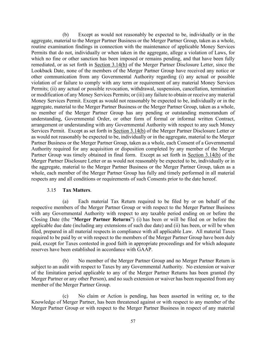 57 (b) Except as would not reasonably be expected to be, individually or in the aggregate, material to the Merger Partner Business or the Merger Partner Group, taken as a whole, routine examination findings in connection with the maintenance of applicable Money Services Permits that do not, individually or when taken in the aggregate, allege a violation of Laws, for which no fine or other sanction has been imposed or remains pending, and that have been fully remediated, or as set forth in Section 3.14(b) of the Merger Partner Disclosure Letter, since the Lookback Date, none of the members of the Merger Partner Group have received any notice or other communication from any Governmental Authority regarding (i) any actual or possible violation of or failure to comply with any term or requirement of any material Money Services Permits; (ii) any actual or possible revocation, withdrawal, suspension, cancellation, termination or modification of any Money Services Permits; or (iii) any failure to obtain or receive any material Money Services Permit. Except as would not reasonably be expected to be, individually or in the aggregate, material to the Merger Partner Business or the Merger Partner Group, taken as a whole, no member of the Merger Partner Group has any pending or outstanding memorandum of understanding, Governmental Order, or other form of formal or informal written Contract, arrangement or understanding with any Governmental Authority with respect to any such Money Services Permit. Except as set forth in Section 3.14(b) of the Merger Partner Disclosure Letter or as would not reasonably be expected to be, individually or in the aggregate, material to the Merger Partner Business or the Merger Partner Group, taken as a whole, each Consent of a Governmental Authority required for any acquisition or disposition completed by any member of the Merger Partner Group was timely obtained in final form. Except as set forth in Section 3.14(b) of the Merger Partner Disclosure Letter or as would not reasonably be expected to be, individually or in the aggregate, material to the Merger Partner Business or the Merger Partner Group, taken as a whole, each member of the Merger Partner Group has fully and timely performed in all material respects any and all conditions or requirements of such Consents prior to the date hereof. 3.15 Tax Matters. (a) Each material Tax Return required to be filed by or on behalf of the respective members of the Merger Partner Group or with respect to the Merger Partner Business with any Governmental Authority with respect to any taxable period ending on or before the Closing Date (the “Merger Partner Returns”) (i) has been or will be filed on or before the applicable due date (including any extensions of such due date) and (ii) has been, or will be when filed, prepared in all material respects in compliance with all applicable Law. All material Taxes required to be paid by or with respect to the members of the Merger Partner Group have been duly paid, except for Taxes contested in good faith in appropriate proceedings and for which adequate reserves have been established in accordance with GAAP. (b) No member of the Merger Partner Group and no Merger Partner Return is subject to an audit with respect to Taxes by any Governmental Authority. No extension or waiver of the limitation period applicable to any of the Merger Partner Returns has been granted (by Merger Partner or any other Person), and no such extension or waiver has been requested from any member of the Merger Partner Group. (c) No claim or Action is pending, has been asserted in writing or, to the Knowledge of Merger Partner, has been threatened against or with respect to any member of the Merger Partner Group or with respect to the Merger Partner Business in respect of any material