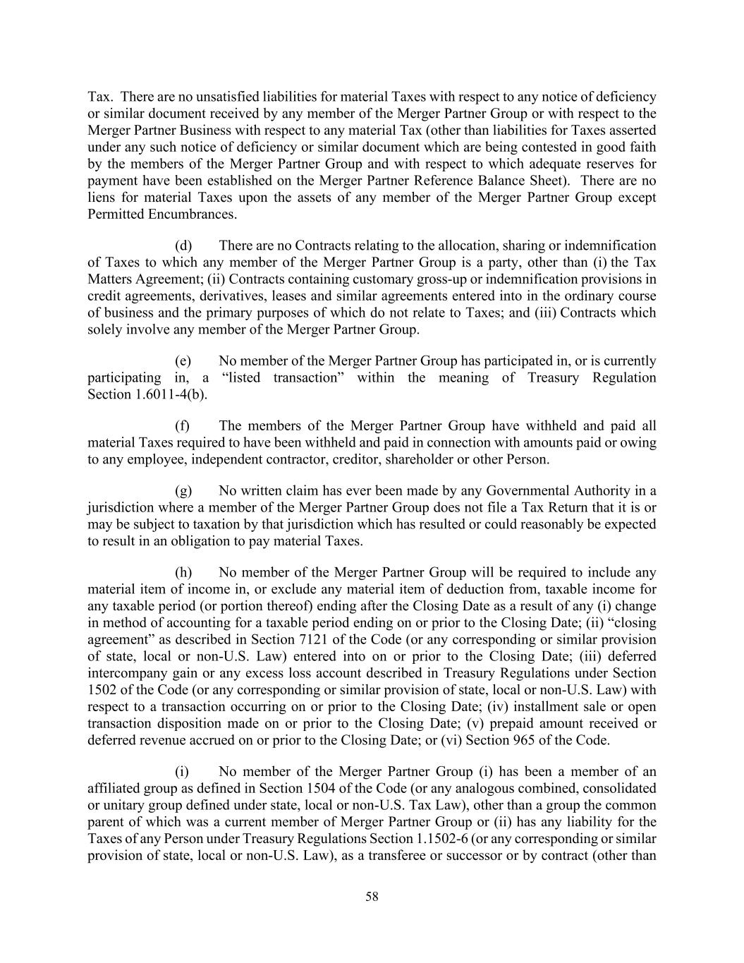 58 Tax. There are no unsatisfied liabilities for material Taxes with respect to any notice of deficiency or similar document received by any member of the Merger Partner Group or with respect to the Merger Partner Business with respect to any material Tax (other than liabilities for Taxes asserted under any such notice of deficiency or similar document which are being contested in good faith by the members of the Merger Partner Group and with respect to which adequate reserves for payment have been established on the Merger Partner Reference Balance Sheet). There are no liens for material Taxes upon the assets of any member of the Merger Partner Group except Permitted Encumbrances. (d) There are no Contracts relating to the allocation, sharing or indemnification of Taxes to which any member of the Merger Partner Group is a party, other than (i) the Tax Matters Agreement; (ii) Contracts containing customary gross-up or indemnification provisions in credit agreements, derivatives, leases and similar agreements entered into in the ordinary course of business and the primary purposes of which do not relate to Taxes; and (iii) Contracts which solely involve any member of the Merger Partner Group. (e) No member of the Merger Partner Group has participated in, or is currently participating in, a “listed transaction” within the meaning of Treasury Regulation Section 1.6011-4(b). (f) The members of the Merger Partner Group have withheld and paid all material Taxes required to have been withheld and paid in connection with amounts paid or owing to any employee, independent contractor, creditor, shareholder or other Person. (g) No written claim has ever been made by any Governmental Authority in a jurisdiction where a member of the Merger Partner Group does not file a Tax Return that it is or may be subject to taxation by that jurisdiction which has resulted or could reasonably be expected to result in an obligation to pay material Taxes. (h) No member of the Merger Partner Group will be required to include any material item of income in, or exclude any material item of deduction from, taxable income for any taxable period (or portion thereof) ending after the Closing Date as a result of any (i) change in method of accounting for a taxable period ending on or prior to the Closing Date; (ii) “closing agreement” as described in Section 7121 of the Code (or any corresponding or similar provision of state, local or non-U.S. Law) entered into on or prior to the Closing Date; (iii) deferred intercompany gain or any excess loss account described in Treasury Regulations under Section 1502 of the Code (or any corresponding or similar provision of state, local or non-U.S. Law) with respect to a transaction occurring on or prior to the Closing Date; (iv) installment sale or open transaction disposition made on or prior to the Closing Date; (v) prepaid amount received or deferred revenue accrued on or prior to the Closing Date; or (vi) Section 965 of the Code. (i) No member of the Merger Partner Group (i) has been a member of an affiliated group as defined in Section 1504 of the Code (or any analogous combined, consolidated or unitary group defined under state, local or non-U.S. Tax Law), other than a group the common parent of which was a current member of Merger Partner Group or (ii) has any liability for the Taxes of any Person under Treasury Regulations Section 1.1502-6 (or any corresponding or similar provision of state, local or non-U.S. Law), as a transferee or successor or by contract (other than