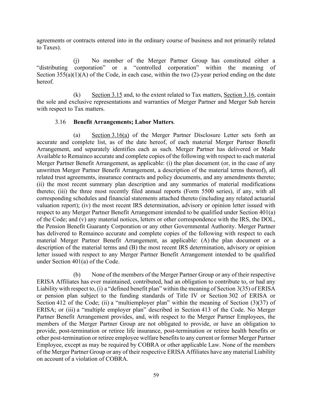 59 agreements or contracts entered into in the ordinary course of business and not primarily related to Taxes). (j) No member of the Merger Partner Group has constituted either a “distributing corporation” or a “controlled corporation” within the meaning of Section 355(a)(1)(A) of the Code, in each case, within the two (2)-year period ending on the date hereof. (k) Section 3.15 and, to the extent related to Tax matters, Section 3.16, contain the sole and exclusive representations and warranties of Merger Partner and Merger Sub herein with respect to Tax matters. 3.16 Benefit Arrangements; Labor Matters. (a) Section 3.16(a) of the Merger Partner Disclosure Letter sets forth an accurate and complete list, as of the date hereof, of each material Merger Partner Benefit Arrangement, and separately identifies each as such. Merger Partner has delivered or Made Available to Remainco accurate and complete copies of the following with respect to each material Merger Partner Benefit Arrangement, as applicable: (i) the plan document (or, in the case of any unwritten Merger Partner Benefit Arrangement, a description of the material terms thereof), all related trust agreements, insurance contracts and policy documents, and any amendments thereto; (ii) the most recent summary plan description and any summaries of material modifications thereto; (iii) the three most recently filed annual reports (Form 5500 series), if any, with all corresponding schedules and financial statements attached thereto (including any related actuarial valuation report); (iv) the most recent IRS determination, advisory or opinion letter issued with respect to any Merger Partner Benefit Arrangement intended to be qualified under Section 401(a) of the Code; and (v) any material notices, letters or other correspondence with the IRS, the DOL, the Pension Benefit Guaranty Corporation or any other Governmental Authority. Merger Partner has delivered to Remainco accurate and complete copies of the following with respect to each material Merger Partner Benefit Arrangement, as applicable: (A) the plan document or a description of the material terms and (B) the most recent IRS determination, advisory or opinion letter issued with respect to any Merger Partner Benefit Arrangement intended to be qualified under Section 401(a) of the Code. (b) None of the members of the Merger Partner Group or any of their respective ERISA Affiliates has ever maintained, contributed, had an obligation to contribute to, or had any Liability with respect to, (i) a “defined benefit plan” within the meaning of Section 3(35) of ERISA or pension plan subject to the funding standards of Title IV or Section 302 of ERISA or Section 412 of the Code; (ii) a “multiemployer plan” within the meaning of Section (3)(37) of ERISA; or (iii) a “multiple employer plan” described in Section 413 of the Code. No Merger Partner Benefit Arrangement provides, and, with respect to the Merger Partner Employees, the members of the Merger Partner Group are not obligated to provide, or have an obligation to provide, post-termination or retiree life insurance, post-termination or retiree health benefits or other post-termination or retiree employee welfare benefits to any current or former Merger Partner Employee, except as may be required by COBRA or other applicable Law. None of the members of the Merger Partner Group or any of their respective ERISA Affiliates have any material Liability on account of a violation of COBRA.