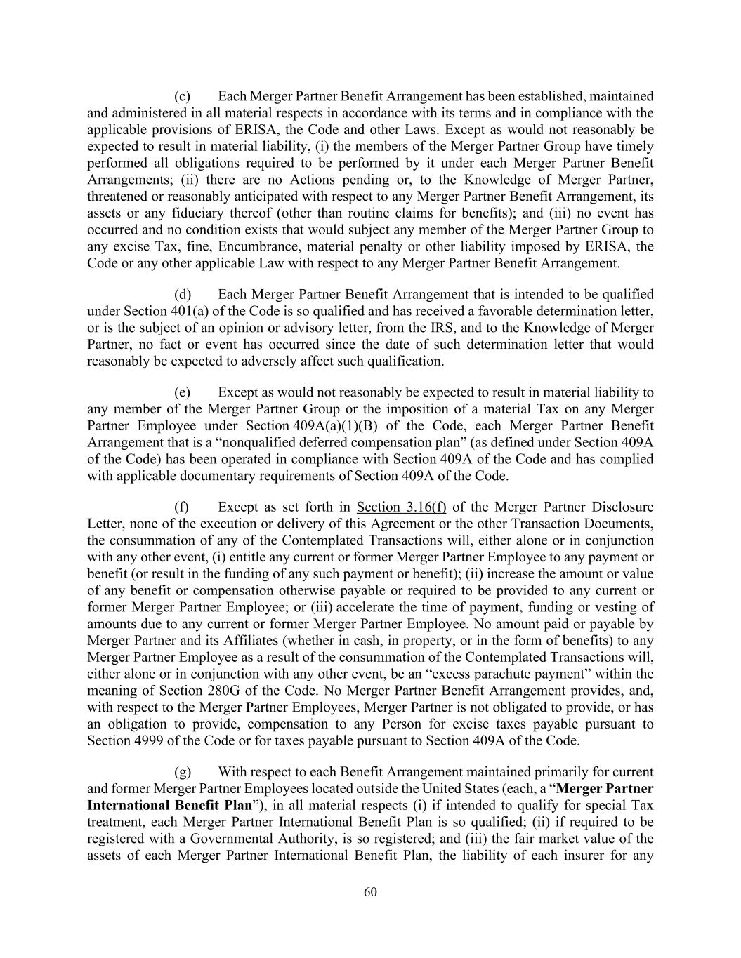 60 (c) Each Merger Partner Benefit Arrangement has been established, maintained and administered in all material respects in accordance with its terms and in compliance with the applicable provisions of ERISA, the Code and other Laws. Except as would not reasonably be expected to result in material liability, (i) the members of the Merger Partner Group have timely performed all obligations required to be performed by it under each Merger Partner Benefit Arrangements; (ii) there are no Actions pending or, to the Knowledge of Merger Partner, threatened or reasonably anticipated with respect to any Merger Partner Benefit Arrangement, its assets or any fiduciary thereof (other than routine claims for benefits); and (iii) no event has occurred and no condition exists that would subject any member of the Merger Partner Group to any excise Tax, fine, Encumbrance, material penalty or other liability imposed by ERISA, the Code or any other applicable Law with respect to any Merger Partner Benefit Arrangement. (d) Each Merger Partner Benefit Arrangement that is intended to be qualified under Section 401(a) of the Code is so qualified and has received a favorable determination letter, or is the subject of an opinion or advisory letter, from the IRS, and to the Knowledge of Merger Partner, no fact or event has occurred since the date of such determination letter that would reasonably be expected to adversely affect such qualification. (e) Except as would not reasonably be expected to result in material liability to any member of the Merger Partner Group or the imposition of a material Tax on any Merger Partner Employee under Section 409A(a)(1)(B) of the Code, each Merger Partner Benefit Arrangement that is a “nonqualified deferred compensation plan” (as defined under Section 409A of the Code) has been operated in compliance with Section 409A of the Code and has complied with applicable documentary requirements of Section 409A of the Code. (f) Except as set forth in Section 3.16(f) of the Merger Partner Disclosure Letter, none of the execution or delivery of this Agreement or the other Transaction Documents, the consummation of any of the Contemplated Transactions will, either alone or in conjunction with any other event, (i) entitle any current or former Merger Partner Employee to any payment or benefit (or result in the funding of any such payment or benefit); (ii) increase the amount or value of any benefit or compensation otherwise payable or required to be provided to any current or former Merger Partner Employee; or (iii) accelerate the time of payment, funding or vesting of amounts due to any current or former Merger Partner Employee. No amount paid or payable by Merger Partner and its Affiliates (whether in cash, in property, or in the form of benefits) to any Merger Partner Employee as a result of the consummation of the Contemplated Transactions will, either alone or in conjunction with any other event, be an “excess parachute payment” within the meaning of Section 280G of the Code. No Merger Partner Benefit Arrangement provides, and, with respect to the Merger Partner Employees, Merger Partner is not obligated to provide, or has an obligation to provide, compensation to any Person for excise taxes payable pursuant to Section 4999 of the Code or for taxes payable pursuant to Section 409A of the Code. (g) With respect to each Benefit Arrangement maintained primarily for current and former Merger Partner Employees located outside the United States (each, a “Merger Partner International Benefit Plan”), in all material respects (i) if intended to qualify for special Tax treatment, each Merger Partner International Benefit Plan is so qualified; (ii) if required to be registered with a Governmental Authority, is so registered; and (iii) the fair market value of the assets of each Merger Partner International Benefit Plan, the liability of each insurer for any