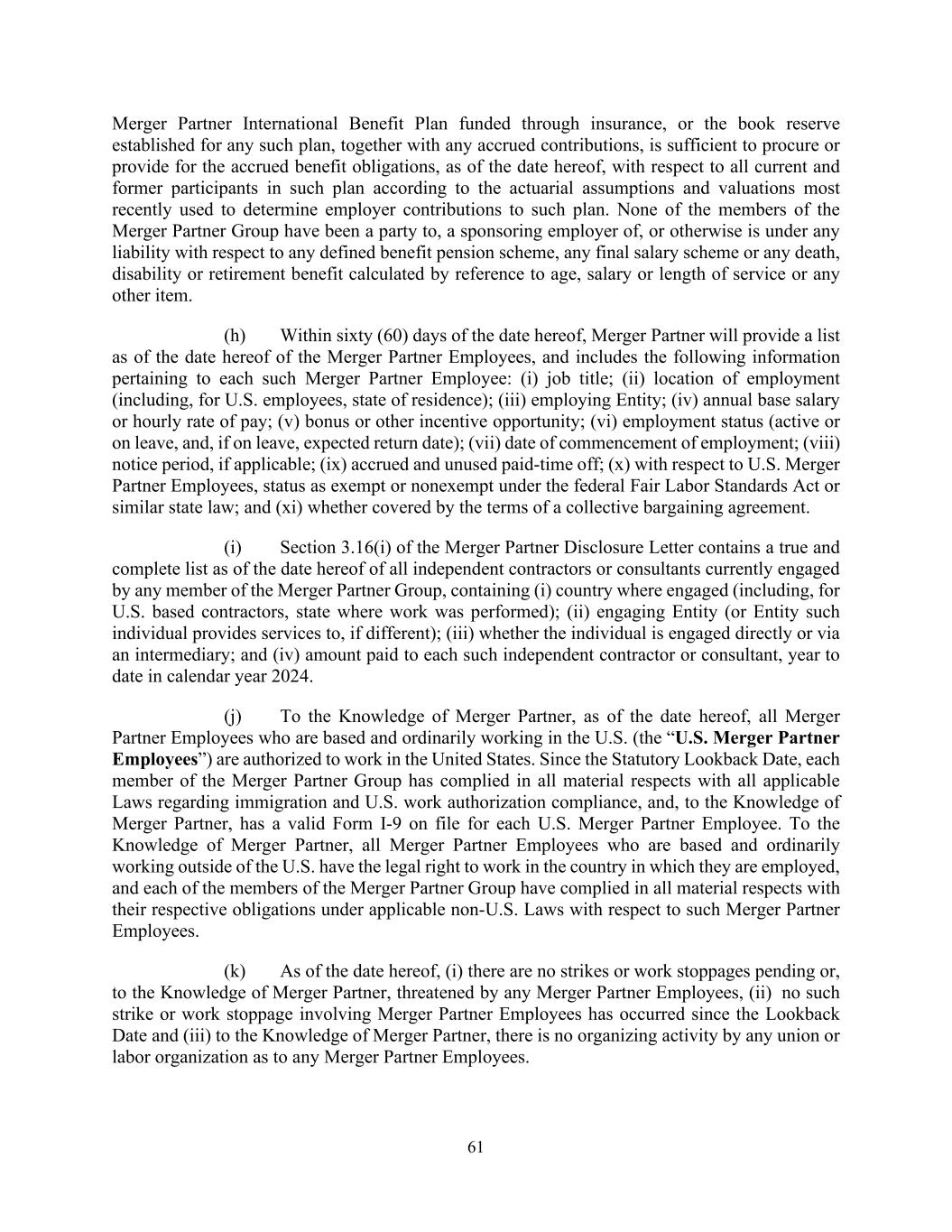 61 Merger Partner International Benefit Plan funded through insurance, or the book reserve established for any such plan, together with any accrued contributions, is sufficient to procure or provide for the accrued benefit obligations, as of the date hereof, with respect to all current and former participants in such plan according to the actuarial assumptions and valuations most recently used to determine employer contributions to such plan. None of the members of the Merger Partner Group have been a party to, a sponsoring employer of, or otherwise is under any liability with respect to any defined benefit pension scheme, any final salary scheme or any death, disability or retirement benefit calculated by reference to age, salary or length of service or any other item. (h) Within sixty (60) days of the date hereof, Merger Partner will provide a list as of the date hereof of the Merger Partner Employees, and includes the following information pertaining to each such Merger Partner Employee: (i) job title; (ii) location of employment (including, for U.S. employees, state of residence); (iii) employing Entity; (iv) annual base salary or hourly rate of pay; (v) bonus or other incentive opportunity; (vi) employment status (active or on leave, and, if on leave, expected return date); (vii) date of commencement of employment; (viii) notice period, if applicable; (ix) accrued and unused paid-time off; (x) with respect to U.S. Merger Partner Employees, status as exempt or nonexempt under the federal Fair Labor Standards Act or similar state law; and (xi) whether covered by the terms of a collective bargaining agreement. (i) Section 3.16(i) of the Merger Partner Disclosure Letter contains a true and complete list as of the date hereof of all independent contractors or consultants currently engaged by any member of the Merger Partner Group, containing (i) country where engaged (including, for U.S. based contractors, state where work was performed); (ii) engaging Entity (or Entity such individual provides services to, if different); (iii) whether the individual is engaged directly or via an intermediary; and (iv) amount paid to each such independent contractor or consultant, year to date in calendar year 2024. (j) To the Knowledge of Merger Partner, as of the date hereof, all Merger Partner Employees who are based and ordinarily working in the U.S. (the “U.S. Merger Partner Employees”) are authorized to work in the United States. Since the Statutory Lookback Date, each member of the Merger Partner Group has complied in all material respects with all applicable Laws regarding immigration and U.S. work authorization compliance, and, to the Knowledge of Merger Partner, has a valid Form I-9 on file for each U.S. Merger Partner Employee. To the Knowledge of Merger Partner, all Merger Partner Employees who are based and ordinarily working outside of the U.S. have the legal right to work in the country in which they are employed, and each of the members of the Merger Partner Group have complied in all material respects with their respective obligations under applicable non-U.S. Laws with respect to such Merger Partner Employees. (k) As of the date hereof, (i) there are no strikes or work stoppages pending or, to the Knowledge of Merger Partner, threatened by any Merger Partner Employees, (ii) no such strike or work stoppage involving Merger Partner Employees has occurred since the Lookback Date and (iii) to the Knowledge of Merger Partner, there is no organizing activity by any union or labor organization as to any Merger Partner Employees.