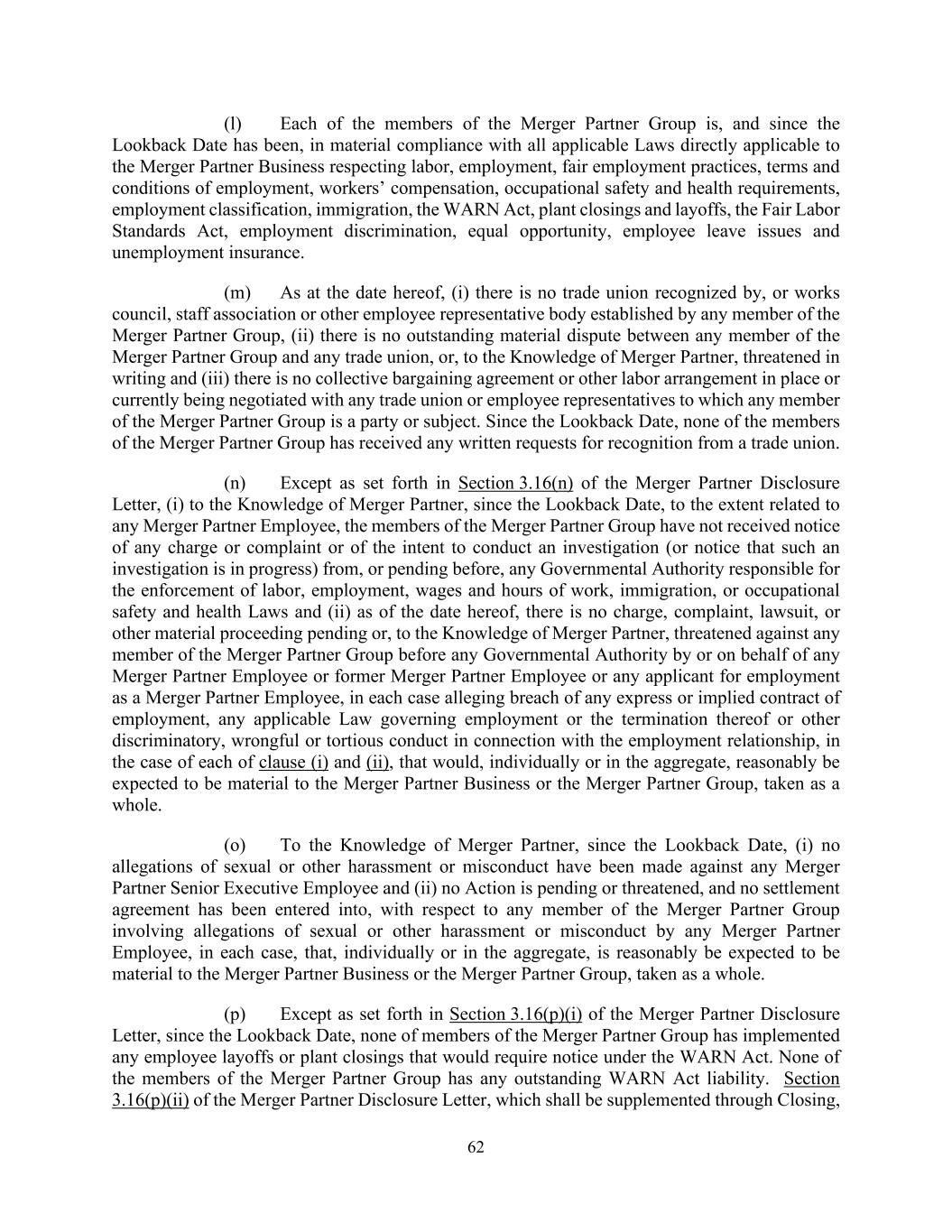 62 (l) Each of the members of the Merger Partner Group is, and since the Lookback Date has been, in material compliance with all applicable Laws directly applicable to the Merger Partner Business respecting labor, employment, fair employment practices, terms and conditions of employment, workers’ compensation, occupational safety and health requirements, employment classification, immigration, the WARN Act, plant closings and layoffs, the Fair Labor Standards Act, employment discrimination, equal opportunity, employee leave issues and unemployment insurance. (m) As at the date hereof, (i) there is no trade union recognized by, or works council, staff association or other employee representative body established by any member of the Merger Partner Group, (ii) there is no outstanding material dispute between any member of the Merger Partner Group and any trade union, or, to the Knowledge of Merger Partner, threatened in writing and (iii) there is no collective bargaining agreement or other labor arrangement in place or currently being negotiated with any trade union or employee representatives to which any member of the Merger Partner Group is a party or subject. Since the Lookback Date, none of the members of the Merger Partner Group has received any written requests for recognition from a trade union. (n) Except as set forth in Section 3.16(n) of the Merger Partner Disclosure Letter, (i) to the Knowledge of Merger Partner, since the Lookback Date, to the extent related to any Merger Partner Employee, the members of the Merger Partner Group have not received notice of any charge or complaint or of the intent to conduct an investigation (or notice that such an investigation is in progress) from, or pending before, any Governmental Authority responsible for the enforcement of labor, employment, wages and hours of work, immigration, or occupational safety and health Laws and (ii) as of the date hereof, there is no charge, complaint, lawsuit, or other material proceeding pending or, to the Knowledge of Merger Partner, threatened against any member of the Merger Partner Group before any Governmental Authority by or on behalf of any Merger Partner Employee or former Merger Partner Employee or any applicant for employment as a Merger Partner Employee, in each case alleging breach of any express or implied contract of employment, any applicable Law governing employment or the termination thereof or other discriminatory, wrongful or tortious conduct in connection with the employment relationship, in the case of each of clause (i) and (ii), that would, individually or in the aggregate, reasonably be expected to be material to the Merger Partner Business or the Merger Partner Group, taken as a whole. (o) To the Knowledge of Merger Partner, since the Lookback Date, (i) no allegations of sexual or other harassment or misconduct have been made against any Merger Partner Senior Executive Employee and (ii) no Action is pending or threatened, and no settlement agreement has been entered into, with respect to any member of the Merger Partner Group involving allegations of sexual or other harassment or misconduct by any Merger Partner Employee, in each case, that, individually or in the aggregate, is reasonably be expected to be material to the Merger Partner Business or the Merger Partner Group, taken as a whole. (p) Except as set forth in Section 3.16(p)(i) of the Merger Partner Disclosure Letter, since the Lookback Date, none of members of the Merger Partner Group has implemented any employee layoffs or plant closings that would require notice under the WARN Act. None of the members of the Merger Partner Group has any outstanding WARN Act liability. Section 3.16(p)(ii) of the Merger Partner Disclosure Letter, which shall be supplemented through Closing,