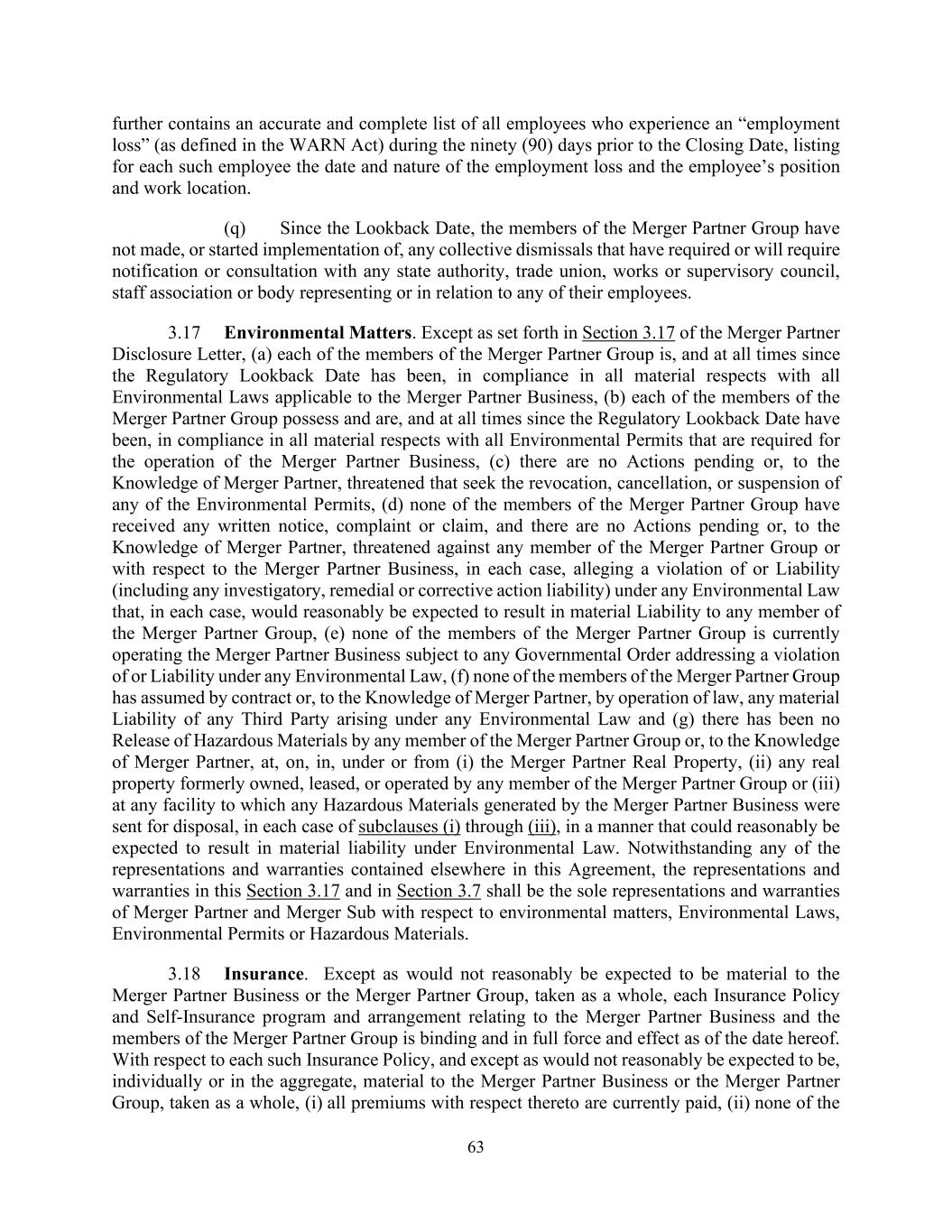 63 further contains an accurate and complete list of all employees who experience an “employment loss” (as defined in the WARN Act) during the ninety (90) days prior to the Closing Date, listing for each such employee the date and nature of the employment loss and the employee’s position and work location. (q) Since the Lookback Date, the members of the Merger Partner Group have not made, or started implementation of, any collective dismissals that have required or will require notification or consultation with any state authority, trade union, works or supervisory council, staff association or body representing or in relation to any of their employees. 3.17 Environmental Matters. Except as set forth in Section 3.17 of the Merger Partner Disclosure Letter, (a) each of the members of the Merger Partner Group is, and at all times since the Regulatory Lookback Date has been, in compliance in all material respects with all Environmental Laws applicable to the Merger Partner Business, (b) each of the members of the Merger Partner Group possess and are, and at all times since the Regulatory Lookback Date have been, in compliance in all material respects with all Environmental Permits that are required for the operation of the Merger Partner Business, (c) there are no Actions pending or, to the Knowledge of Merger Partner, threatened that seek the revocation, cancellation, or suspension of any of the Environmental Permits, (d) none of the members of the Merger Partner Group have received any written notice, complaint or claim, and there are no Actions pending or, to the Knowledge of Merger Partner, threatened against any member of the Merger Partner Group or with respect to the Merger Partner Business, in each case, alleging a violation of or Liability (including any investigatory, remedial or corrective action liability) under any Environmental Law that, in each case, would reasonably be expected to result in material Liability to any member of the Merger Partner Group, (e) none of the members of the Merger Partner Group is currently operating the Merger Partner Business subject to any Governmental Order addressing a violation of or Liability under any Environmental Law, (f) none of the members of the Merger Partner Group has assumed by contract or, to the Knowledge of Merger Partner, by operation of law, any material Liability of any Third Party arising under any Environmental Law and (g) there has been no Release of Hazardous Materials by any member of the Merger Partner Group or, to the Knowledge of Merger Partner, at, on, in, under or from (i) the Merger Partner Real Property, (ii) any real property formerly owned, leased, or operated by any member of the Merger Partner Group or (iii) at any facility to which any Hazardous Materials generated by the Merger Partner Business were sent for disposal, in each case of subclauses (i) through (iii), in a manner that could reasonably be expected to result in material liability under Environmental Law. Notwithstanding any of the representations and warranties contained elsewhere in this Agreement, the representations and warranties in this Section 3.17 and in Section 3.7 shall be the sole representations and warranties of Merger Partner and Merger Sub with respect to environmental matters, Environmental Laws, Environmental Permits or Hazardous Materials. 3.18 Insurance. Except as would not reasonably be expected to be material to the Merger Partner Business or the Merger Partner Group, taken as a whole, each Insurance Policy and Self-Insurance program and arrangement relating to the Merger Partner Business and the members of the Merger Partner Group is binding and in full force and effect as of the date hereof. With respect to each such Insurance Policy, and except as would not reasonably be expected to be, individually or in the aggregate, material to the Merger Partner Business or the Merger Partner Group, taken as a whole, (i) all premiums with respect thereto are currently paid, (ii) none of the
