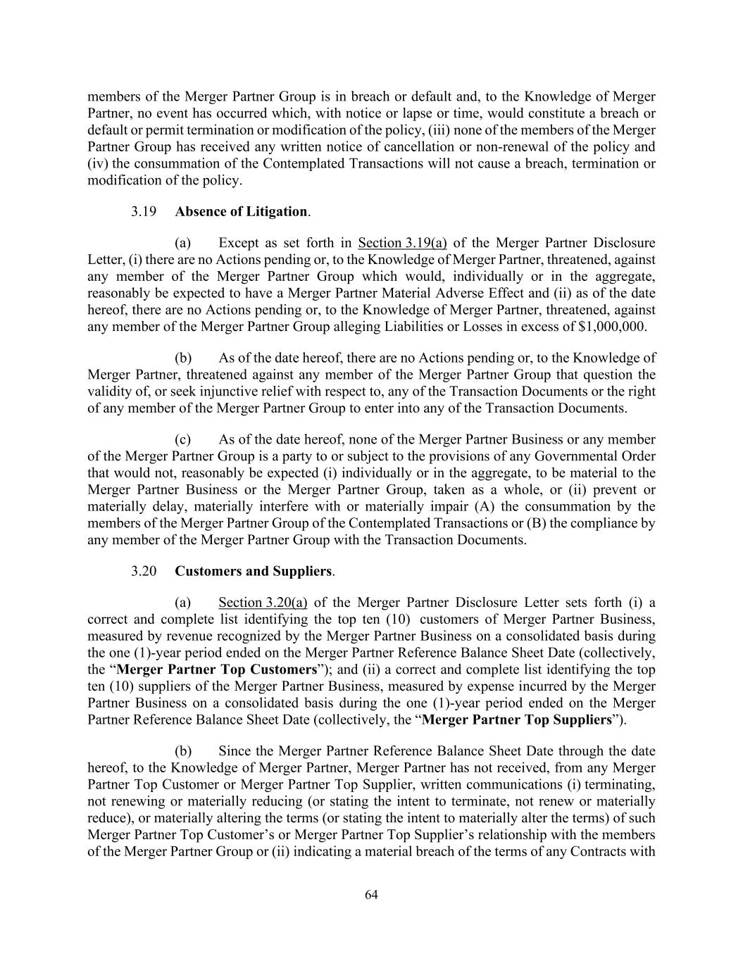 64 members of the Merger Partner Group is in breach or default and, to the Knowledge of Merger Partner, no event has occurred which, with notice or lapse or time, would constitute a breach or default or permit termination or modification of the policy, (iii) none of the members of the Merger Partner Group has received any written notice of cancellation or non-renewal of the policy and (iv) the consummation of the Contemplated Transactions will not cause a breach, termination or modification of the policy. 3.19 Absence of Litigation. (a) Except as set forth in Section 3.19(a) of the Merger Partner Disclosure Letter, (i) there are no Actions pending or, to the Knowledge of Merger Partner, threatened, against any member of the Merger Partner Group which would, individually or in the aggregate, reasonably be expected to have a Merger Partner Material Adverse Effect and (ii) as of the date hereof, there are no Actions pending or, to the Knowledge of Merger Partner, threatened, against any member of the Merger Partner Group alleging Liabilities or Losses in excess of $1,000,000. (b) As of the date hereof, there are no Actions pending or, to the Knowledge of Merger Partner, threatened against any member of the Merger Partner Group that question the validity of, or seek injunctive relief with respect to, any of the Transaction Documents or the right of any member of the Merger Partner Group to enter into any of the Transaction Documents. (c) As of the date hereof, none of the Merger Partner Business or any member of the Merger Partner Group is a party to or subject to the provisions of any Governmental Order that would not, reasonably be expected (i) individually or in the aggregate, to be material to the Merger Partner Business or the Merger Partner Group, taken as a whole, or (ii) prevent or materially delay, materially interfere with or materially impair (A) the consummation by the members of the Merger Partner Group of the Contemplated Transactions or (B) the compliance by any member of the Merger Partner Group with the Transaction Documents. 3.20 Customers and Suppliers. (a) Section 3.20(a) of the Merger Partner Disclosure Letter sets forth (i) a correct and complete list identifying the top ten (10) customers of Merger Partner Business, measured by revenue recognized by the Merger Partner Business on a consolidated basis during the one (1)-year period ended on the Merger Partner Reference Balance Sheet Date (collectively, the “Merger Partner Top Customers”); and (ii) a correct and complete list identifying the top ten (10) suppliers of the Merger Partner Business, measured by expense incurred by the Merger Partner Business on a consolidated basis during the one (1)-year period ended on the Merger Partner Reference Balance Sheet Date (collectively, the “Merger Partner Top Suppliers”). (b) Since the Merger Partner Reference Balance Sheet Date through the date hereof, to the Knowledge of Merger Partner, Merger Partner has not received, from any Merger Partner Top Customer or Merger Partner Top Supplier, written communications (i) terminating, not renewing or materially reducing (or stating the intent to terminate, not renew or materially reduce), or materially altering the terms (or stating the intent to materially alter the terms) of such Merger Partner Top Customer’s or Merger Partner Top Supplier’s relationship with the members of the Merger Partner Group or (ii) indicating a material breach of the terms of any Contracts with