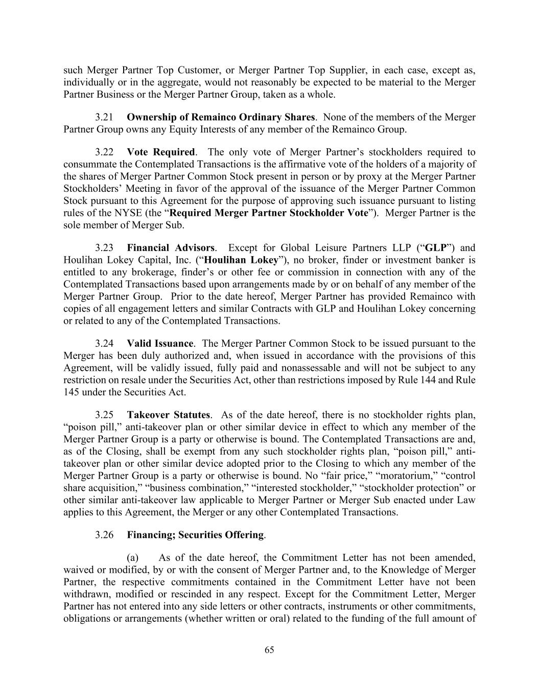 65 such Merger Partner Top Customer, or Merger Partner Top Supplier, in each case, except as, individually or in the aggregate, would not reasonably be expected to be material to the Merger Partner Business or the Merger Partner Group, taken as a whole. 3.21 Ownership of Remainco Ordinary Shares. None of the members of the Merger Partner Group owns any Equity Interests of any member of the Remainco Group. 3.22 Vote Required. The only vote of Merger Partner’s stockholders required to consummate the Contemplated Transactions is the affirmative vote of the holders of a majority of the shares of Merger Partner Common Stock present in person or by proxy at the Merger Partner Stockholders’ Meeting in favor of the approval of the issuance of the Merger Partner Common Stock pursuant to this Agreement for the purpose of approving such issuance pursuant to listing rules of the NYSE (the “Required Merger Partner Stockholder Vote”). Merger Partner is the sole member of Merger Sub. 3.23 Financial Advisors. Except for Global Leisure Partners LLP (“GLP”) and Houlihan Lokey Capital, Inc. (“Houlihan Lokey”), no broker, finder or investment banker is entitled to any brokerage, finder’s or other fee or commission in connection with any of the Contemplated Transactions based upon arrangements made by or on behalf of any member of the Merger Partner Group. Prior to the date hereof, Merger Partner has provided Remainco with copies of all engagement letters and similar Contracts with GLP and Houlihan Lokey concerning or related to any of the Contemplated Transactions. 3.24 Valid Issuance. The Merger Partner Common Stock to be issued pursuant to the Merger has been duly authorized and, when issued in accordance with the provisions of this Agreement, will be validly issued, fully paid and nonassessable and will not be subject to any restriction on resale under the Securities Act, other than restrictions imposed by Rule 144 and Rule 145 under the Securities Act. 3.25 Takeover Statutes. As of the date hereof, there is no stockholder rights plan, “poison pill,” anti-takeover plan or other similar device in effect to which any member of the Merger Partner Group is a party or otherwise is bound. The Contemplated Transactions are and, as of the Closing, shall be exempt from any such stockholder rights plan, “poison pill,” anti- takeover plan or other similar device adopted prior to the Closing to which any member of the Merger Partner Group is a party or otherwise is bound. No “fair price,” “moratorium,” “control share acquisition,” “business combination,” “interested stockholder,” “stockholder protection” or other similar anti-takeover law applicable to Merger Partner or Merger Sub enacted under Law applies to this Agreement, the Merger or any other Contemplated Transactions. 3.26 Financing; Securities Offering. (a) As of the date hereof, the Commitment Letter has not been amended, waived or modified, by or with the consent of Merger Partner and, to the Knowledge of Merger Partner, the respective commitments contained in the Commitment Letter have not been withdrawn, modified or rescinded in any respect. Except for the Commitment Letter, Merger Partner has not entered into any side letters or other contracts, instruments or other commitments, obligations or arrangements (whether written or oral) related to the funding of the full amount of