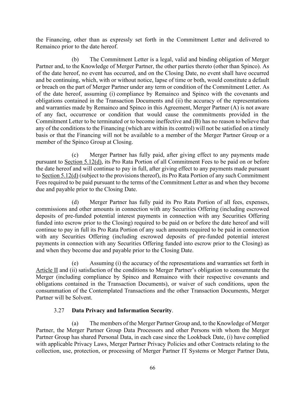 66 the Financing, other than as expressly set forth in the Commitment Letter and delivered to Remainco prior to the date hereof. (b) The Commitment Letter is a legal, valid and binding obligation of Merger Partner and, to the Knowledge of Merger Partner, the other parties thereto (other than Spinco). As of the date hereof, no event has occurred, and on the Closing Date, no event shall have occurred and be continuing, which, with or without notice, lapse of time or both, would constitute a default or breach on the part of Merger Partner under any term or condition of the Commitment Letter. As of the date hereof, assuming (i) compliance by Remainco and Spinco with the covenants and obligations contained in the Transaction Documents and (ii) the accuracy of the representations and warranties made by Remainco and Spinco in this Agreement, Merger Partner (A) is not aware of any fact, occurrence or condition that would cause the commitments provided in the Commitment Letter to be terminated or to become ineffective and (B) has no reason to believe that any of the conditions to the Financing (which are within its control) will not be satisfied on a timely basis or that the Financing will not be available to a member of the Merger Partner Group or a member of the Spinco Group at Closing. (c) Merger Partner has fully paid, after giving effect to any payments made pursuant to Section 5.12(d), its Pro Rata Portion of all Commitment Fees to be paid on or before the date hereof and will continue to pay in full, after giving effect to any payments made pursuant to Section 5.12(d) (subject to the provisions thereof), its Pro Rata Portion of any such Commitment Fees required to be paid pursuant to the terms of the Commitment Letter as and when they become due and payable prior to the Closing Date. (d) Merger Partner has fully paid its Pro Rata Portion of all fees, expenses, commissions and other amounts in connection with any Securities Offering (including escrowed deposits of pre-funded potential interest payments in connection with any Securities Offering funded into escrow prior to the Closing) required to be paid on or before the date hereof and will continue to pay in full its Pro Rata Portion of any such amounts required to be paid in connection with any Securities Offering (including escrowed deposits of pre-funded potential interest payments in connection with any Securities Offering funded into escrow prior to the Closing) as and when they become due and payable prior to the Closing Date. (e) Assuming (i) the accuracy of the representations and warranties set forth in Article II and (ii) satisfaction of the conditions to Merger Partner’s obligation to consummate the Merger (including compliance by Spinco and Remainco with their respective covenants and obligations contained in the Transaction Documents), or waiver of such conditions, upon the consummation of the Contemplated Transactions and the other Transaction Documents, Merger Partner will be Solvent. 3.27 Data Privacy and Information Security. (a) The members of the Merger Partner Group and, to the Knowledge of Merger Partner, the Merger Partner Group Data Processors and other Persons with whom the Merger Partner Group has shared Personal Data, in each case since the Lookback Date, (i) have complied with applicable Privacy Laws, Merger Partner Privacy Policies and other Contracts relating to the collection, use, protection, or processing of Merger Partner IT Systems or Merger Partner Data,